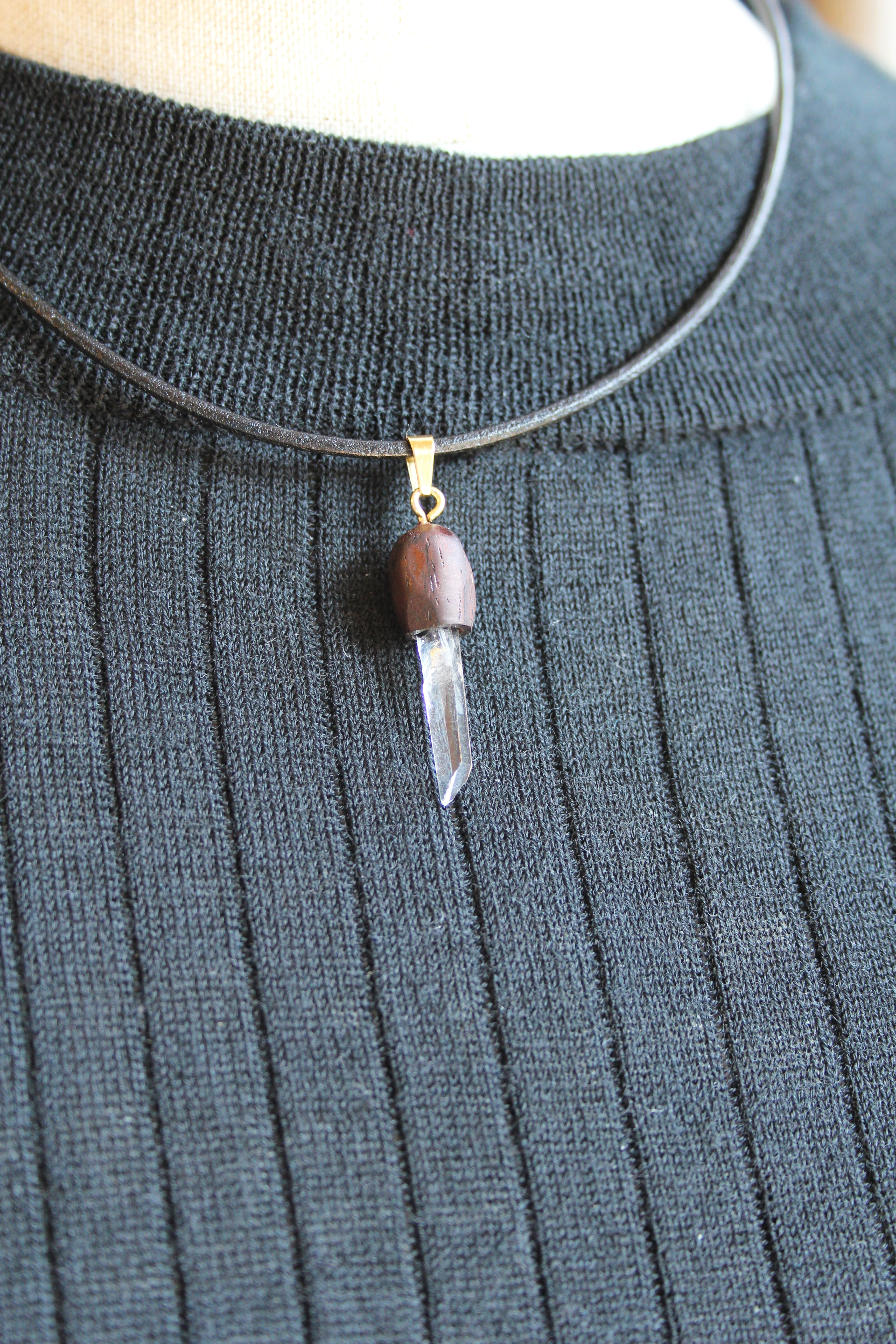 【商品説明】:水晶の原石と高級木材のローズウッドを使用したペンダント。コロンビアレムリアンを彷彿させるような透明度が高い宮崎産水晶。ギューンと伸びたポイント水晶に根元にチョイある山傷がカッコイイです