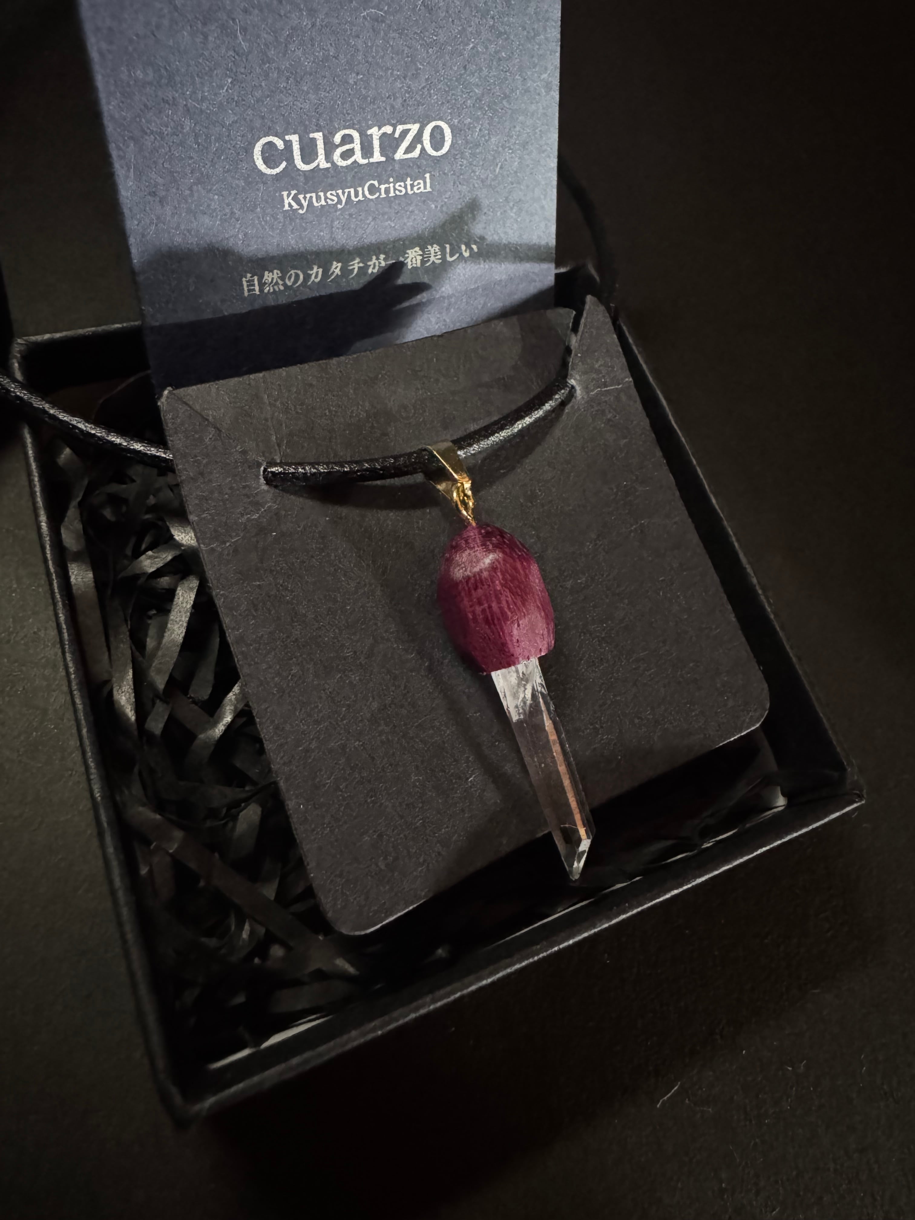 【商品説明】:水晶の原石と高級木材のパープルハートを使用したペンダント。コロンビアレムリアンを彷彿させるような透明度が高い宮崎産水晶。ギューンと伸びたポイント水晶に根元にチョイある山傷がカッコイイです