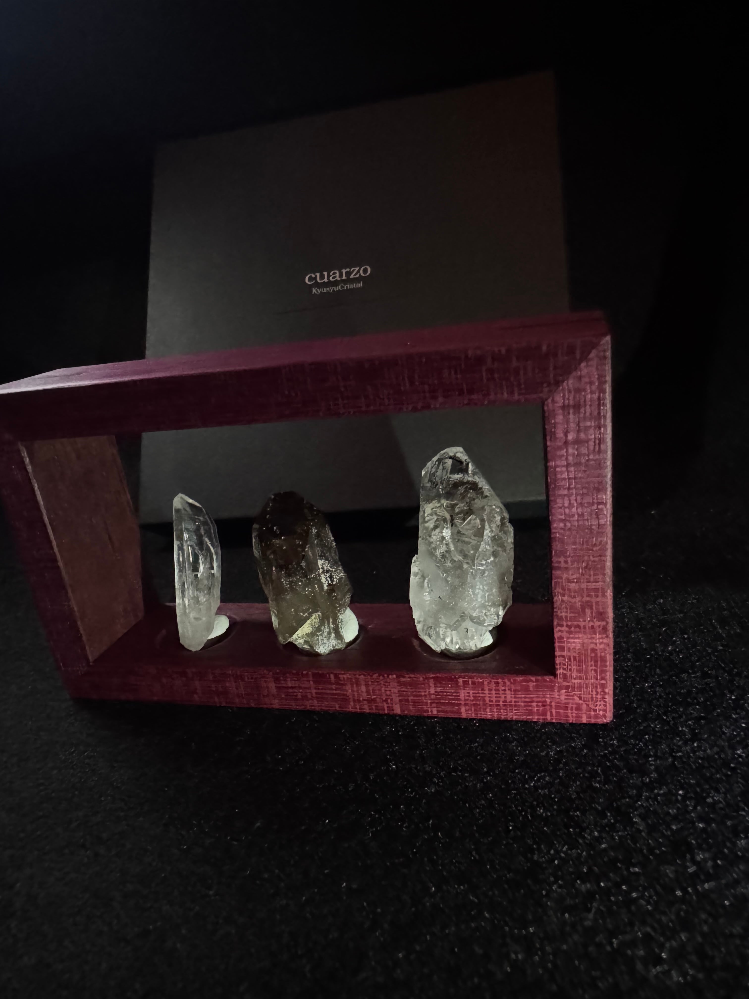 【商品説明】:3種水晶の原石と高級木材のパープルハートを使用した置物。