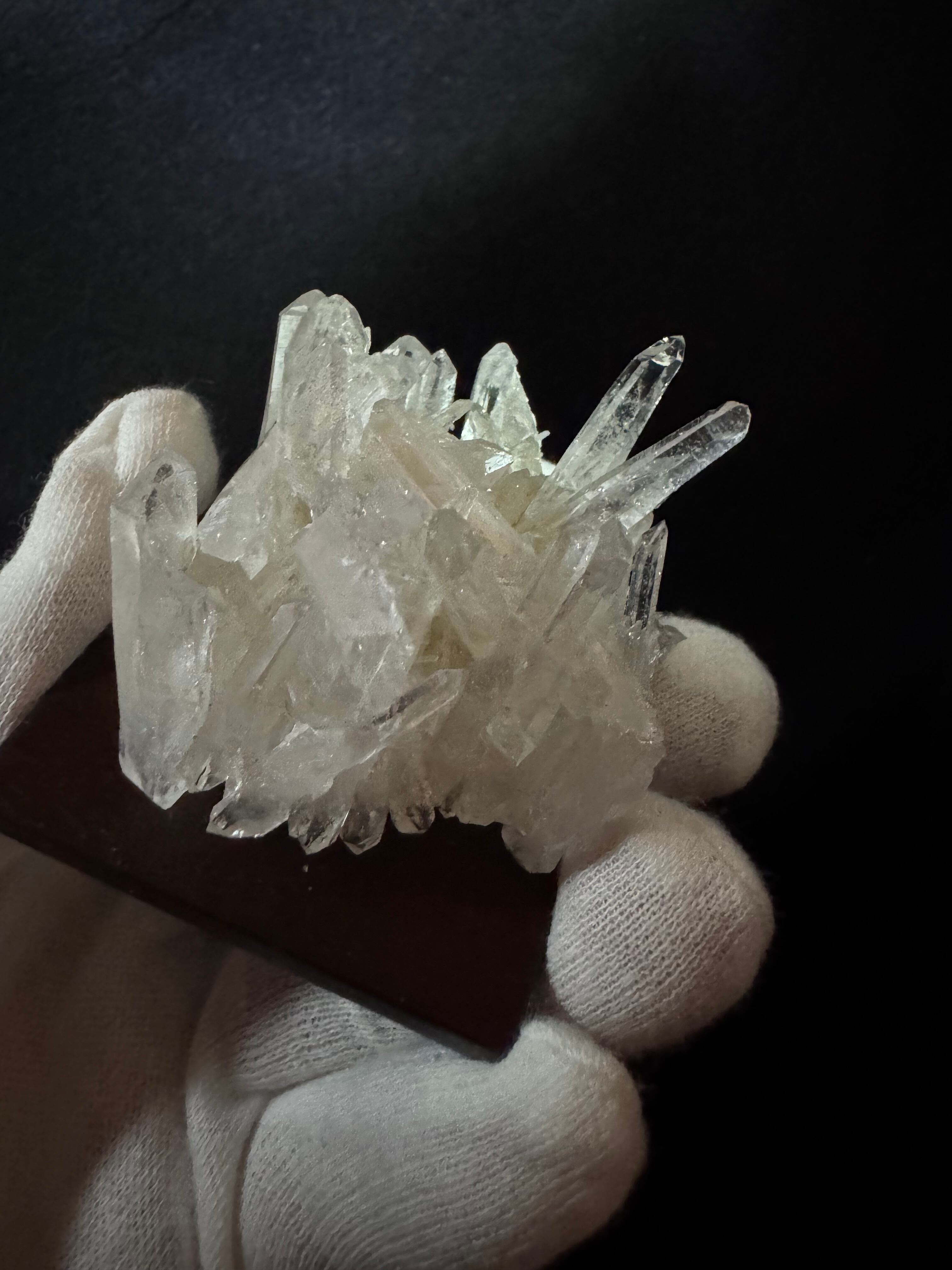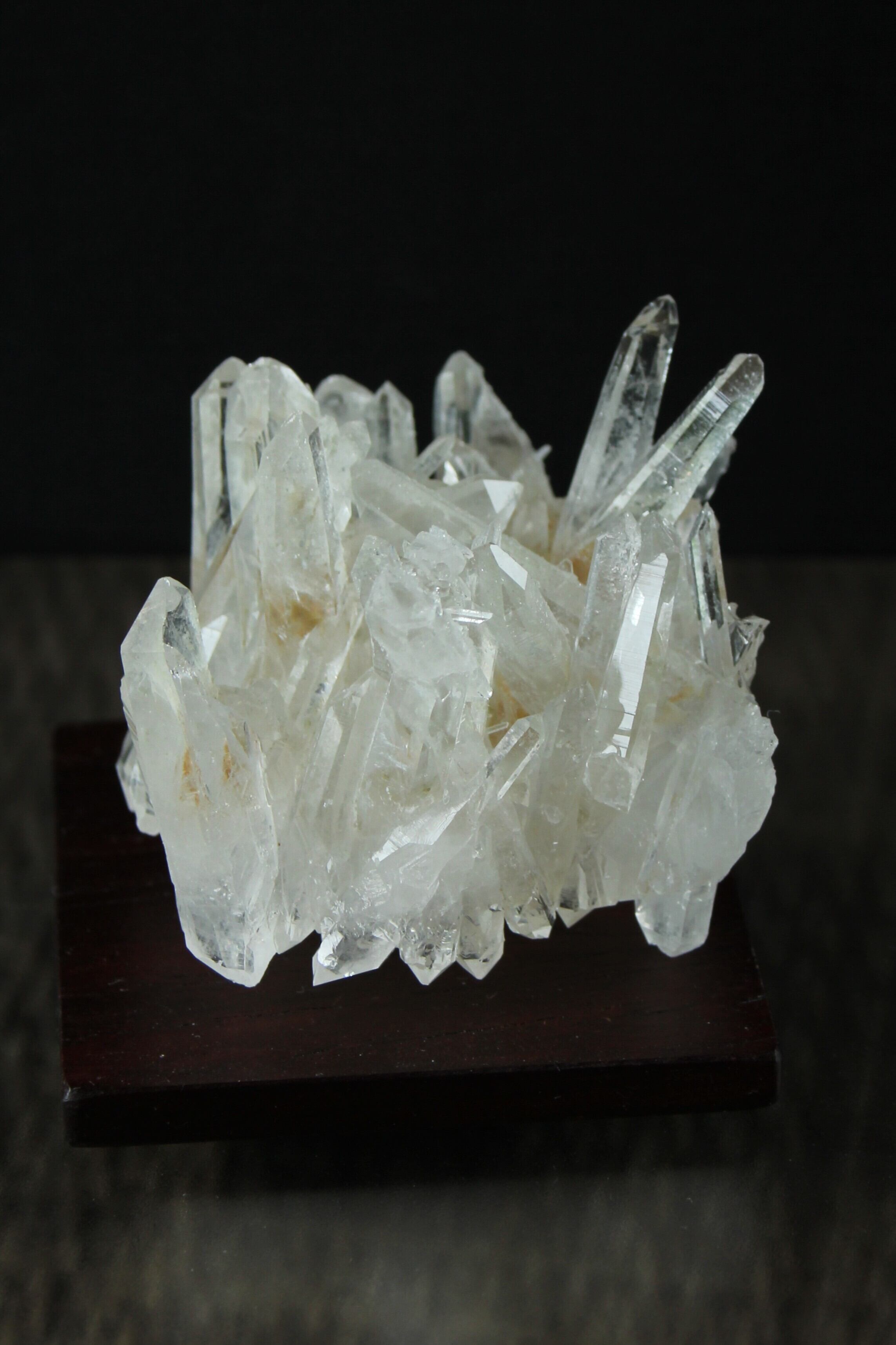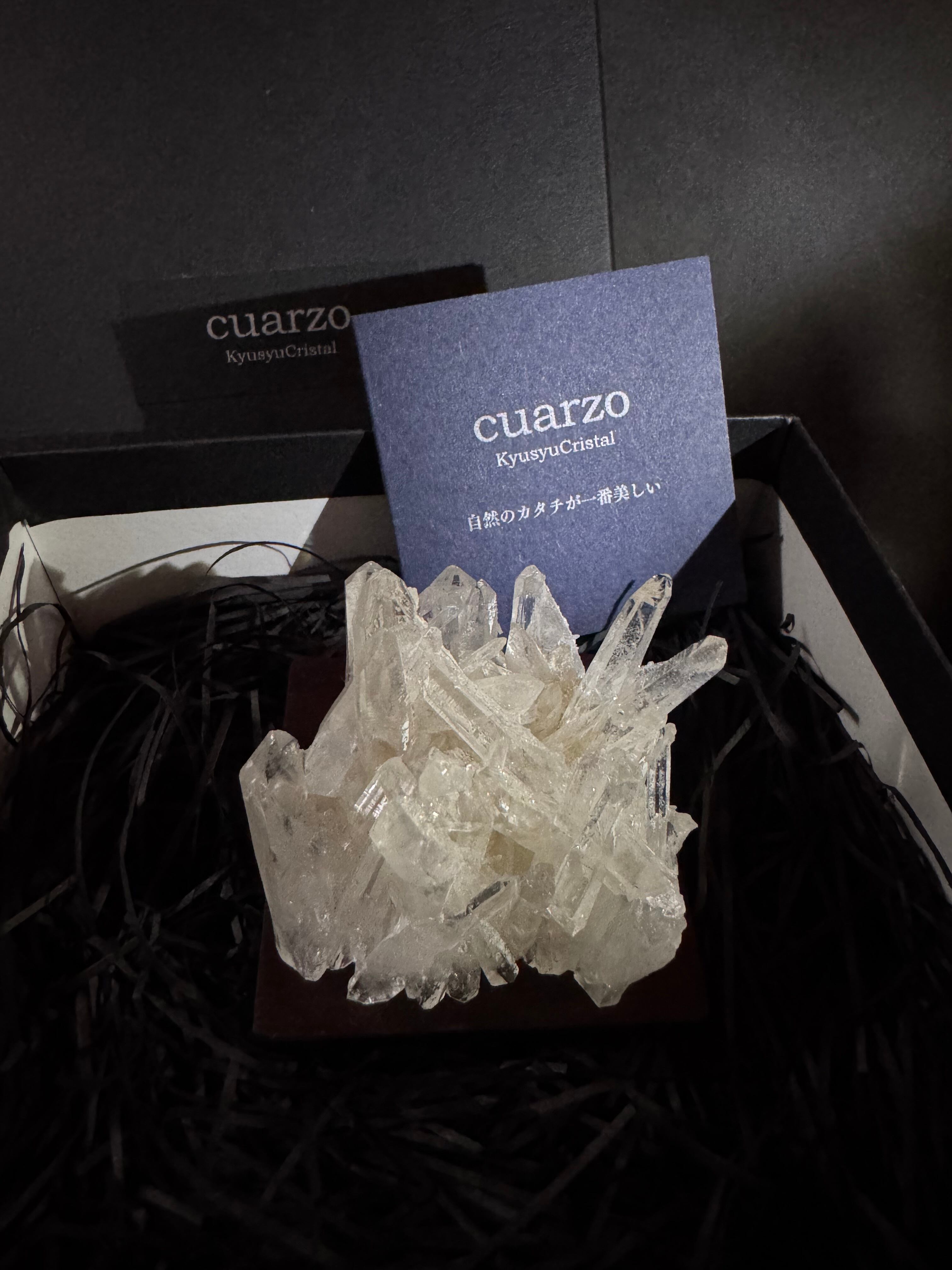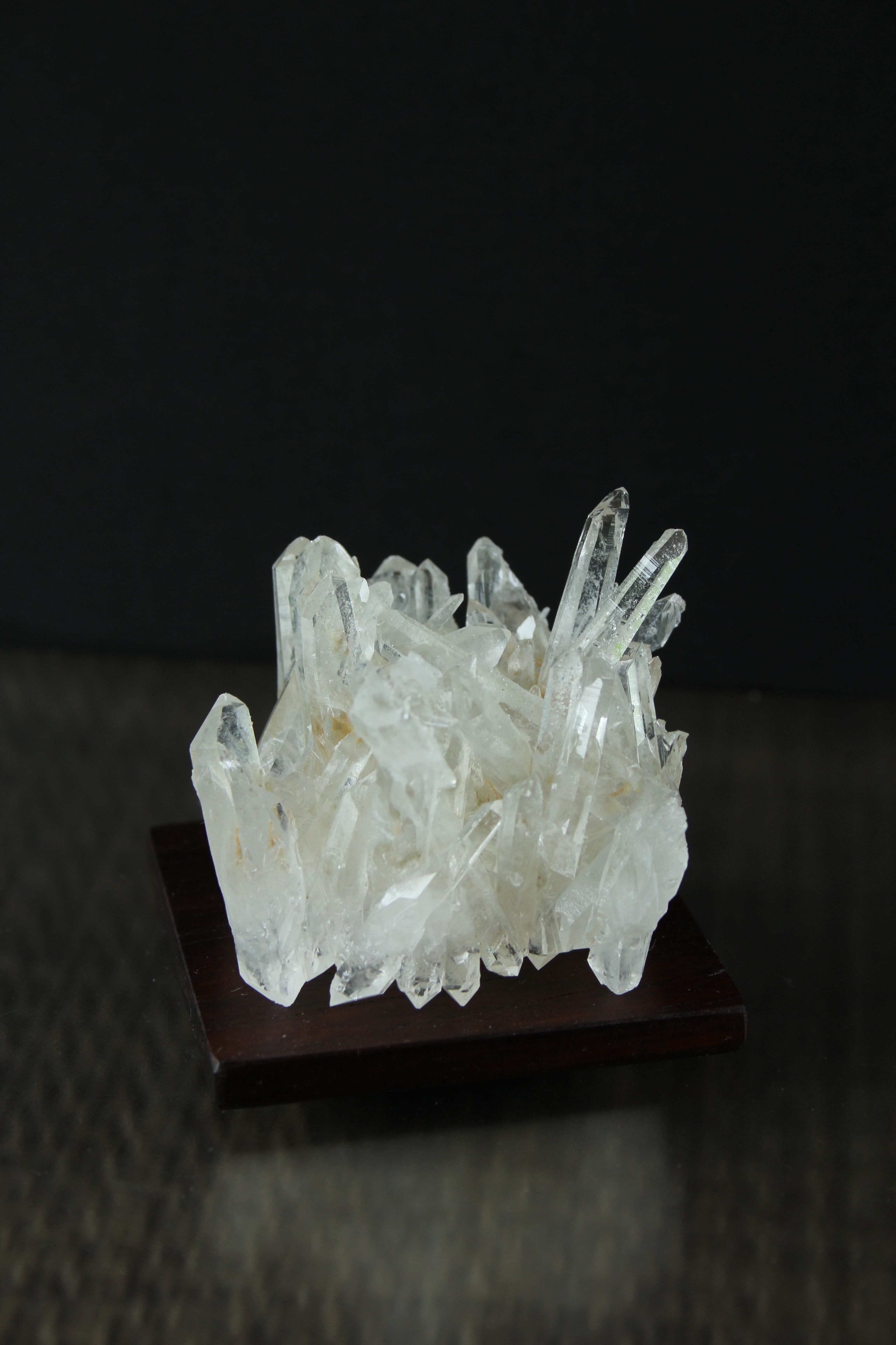 【商品説明】:水晶の原石と高級木材のローズウッドを使用した置物。透明度の高い宮崎産水晶。この産地の特徴をとらえたようなギザギザのクラスターです。ローズウッドスクエア50の大きさ(約50x50x5mm)