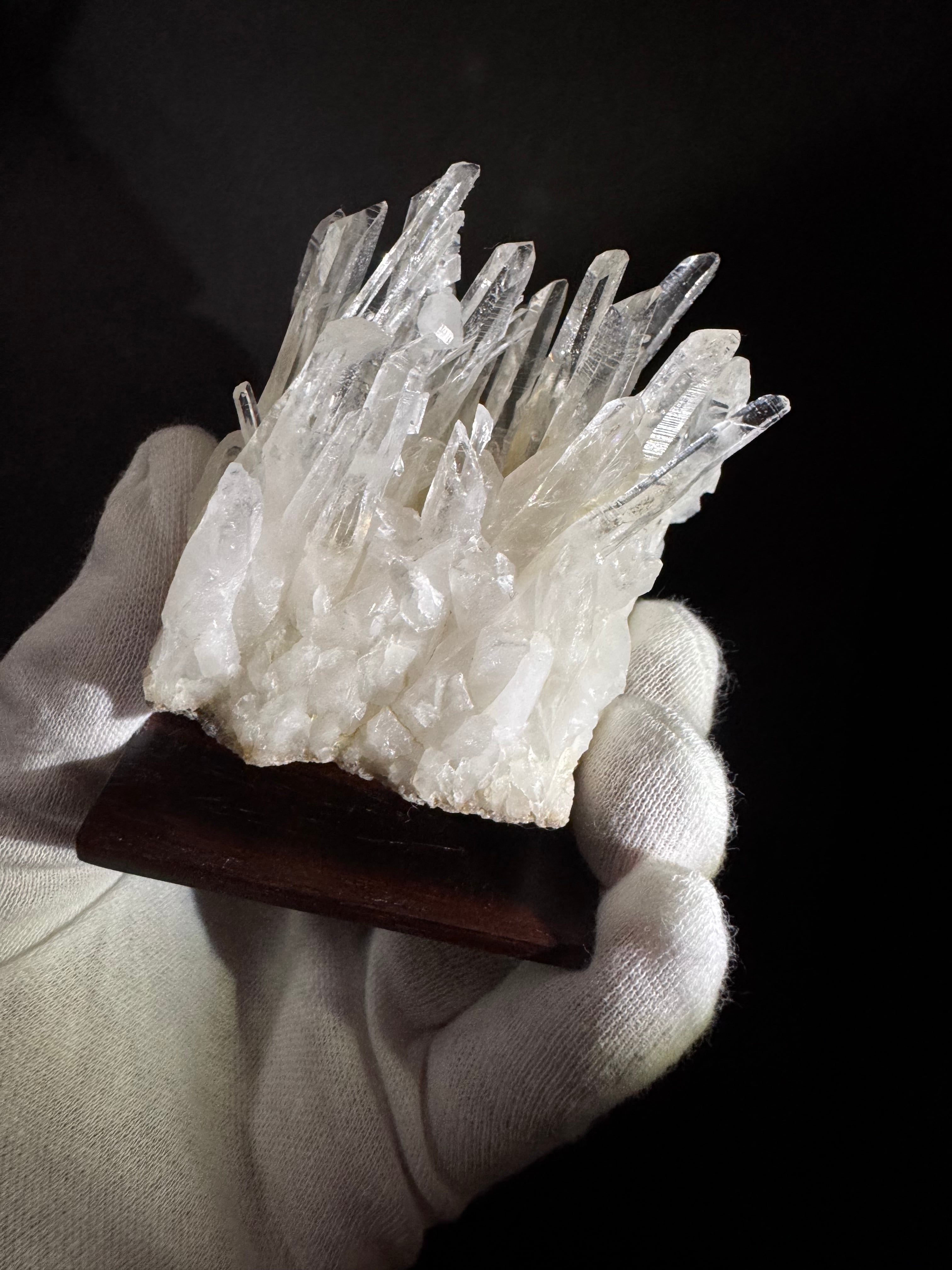 【商品説明】:水晶の原石と高級木材のローズウッドを使用した置物。透明度の高い宮崎産水晶。この産地の特徴をとらえたようなギザギザのクラスターです。長い剣山のように真上に伸びる幾つもの水晶がカッコイイです。ローズウッドスクエア60の大きさ(約60x60x5mm)