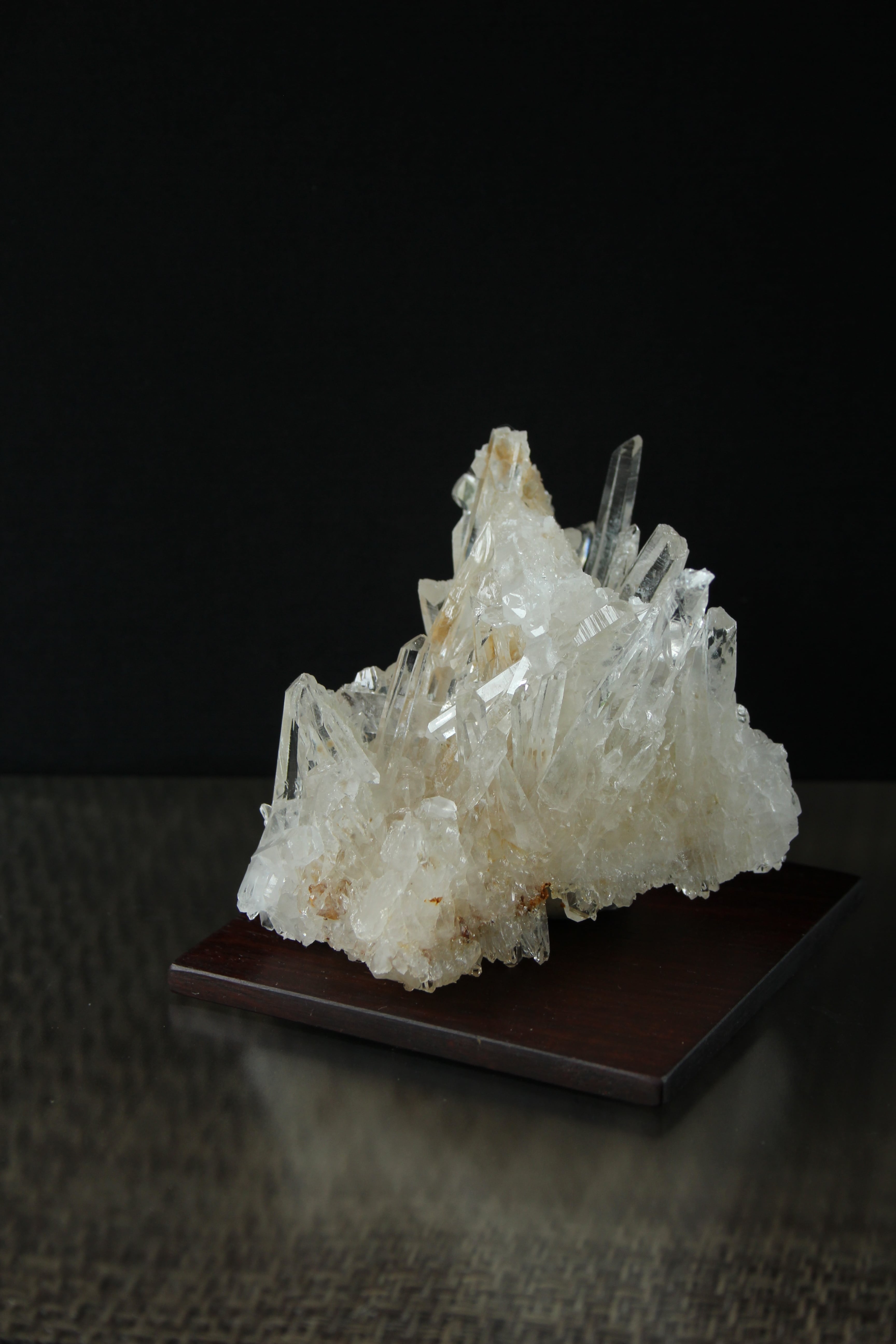【商品説明】:水晶の原石と高級木材のローズウッドを使用した置物。透明度の高い宮崎産水晶がごちゃごちゃと重なっているクラスターです。ローズウッドスクエア70の大きさ(約70x70x5mm)