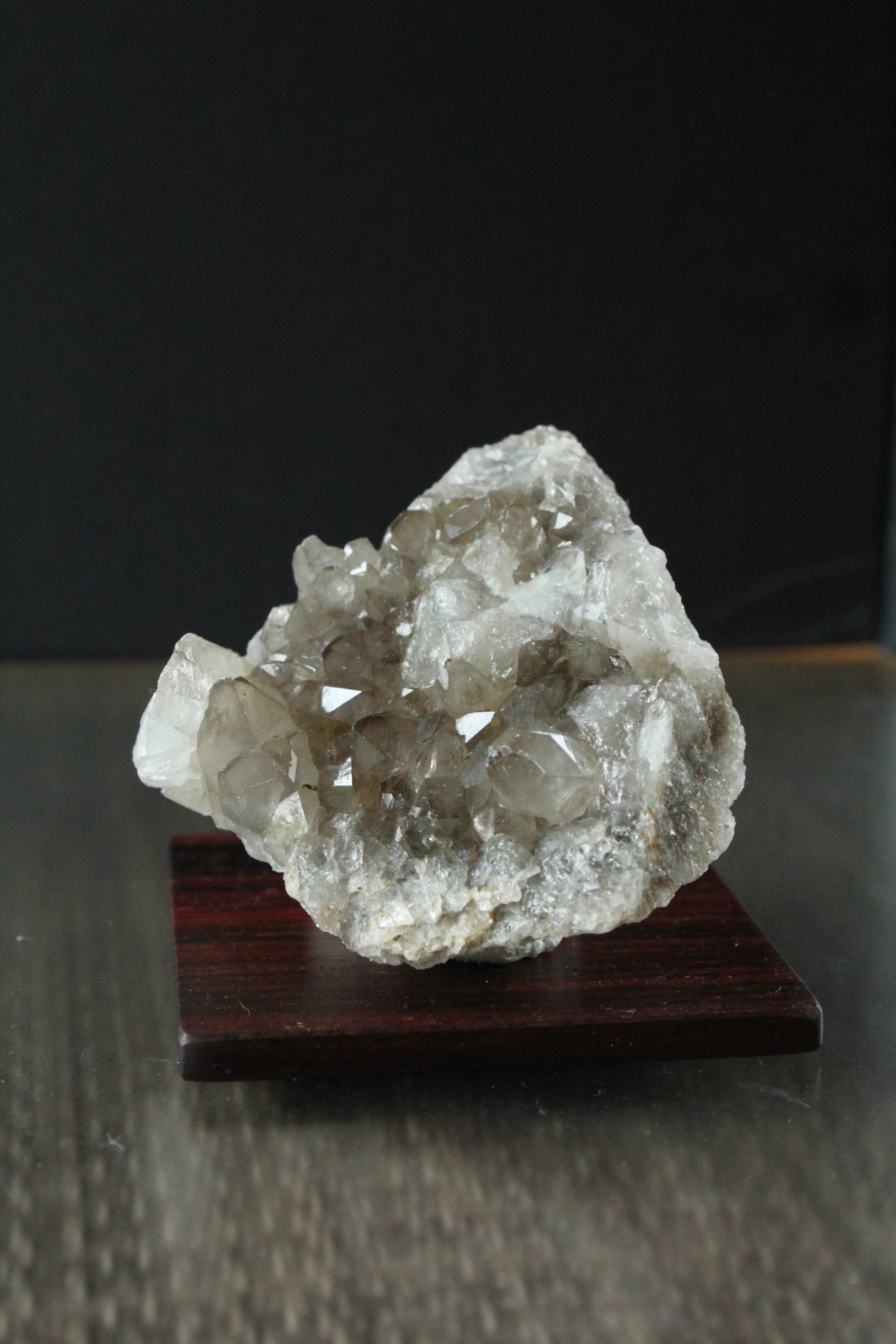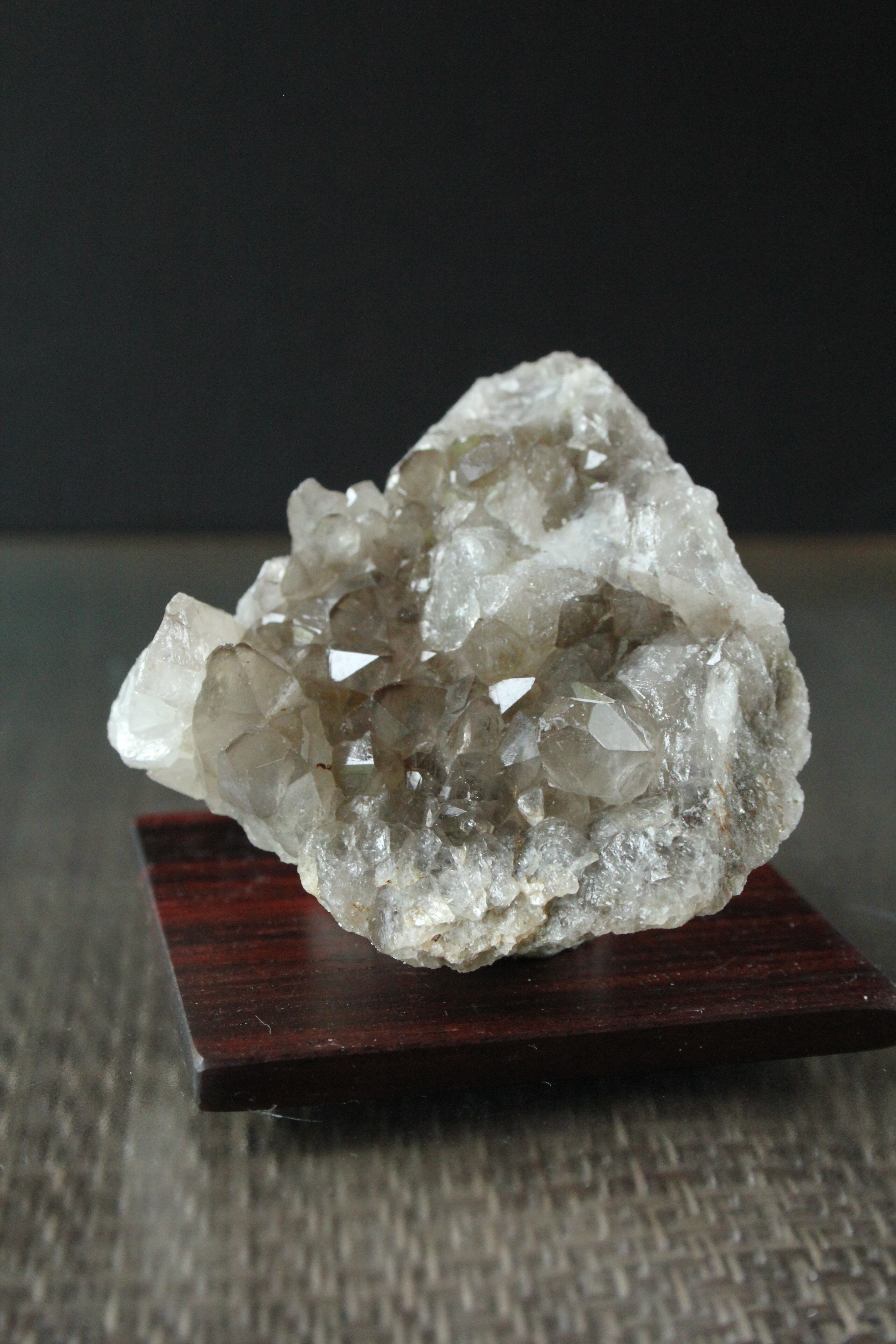 【商品説明】:水晶の原石と高級木材のローズウッドを使用した置物。全体的に淡いグレーに近い感じの透明感溢れる宮崎産の煙水晶です。単体の水晶でみると小さいですが、一つ一つがとてもキレイです。この産地の見本のようなクラスターです。ローズウッドスクエア60の大きさ(約60x60x5mm)