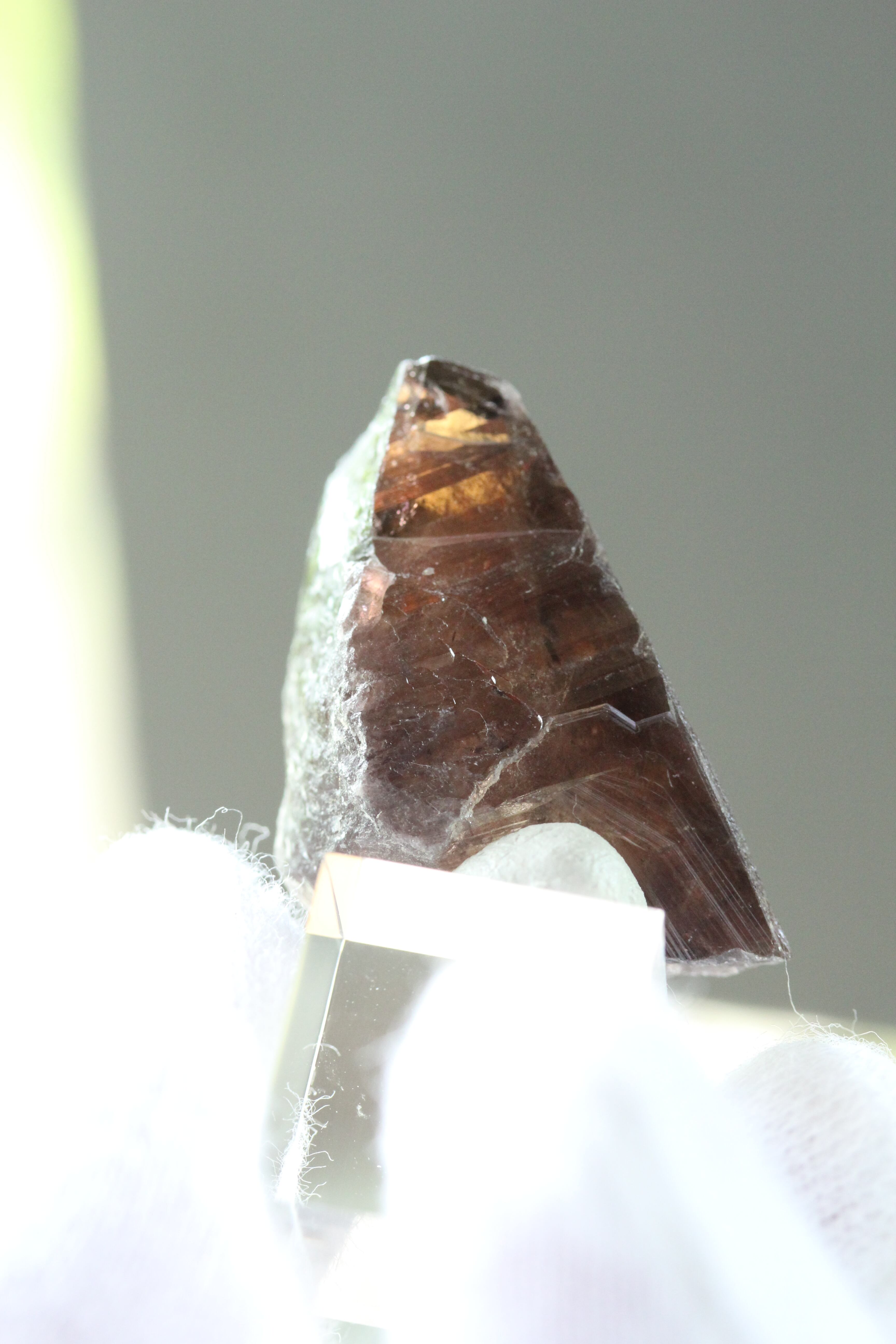 【商品説明】:アキシナイト(斧石)の原石とアクリルキューブを使用した置物。今回入荷した中で一番厚みのある斧石の結晶。それでも光に透かすと透明感がある。アクリルキューブの大きさ(約15x15x15mm)