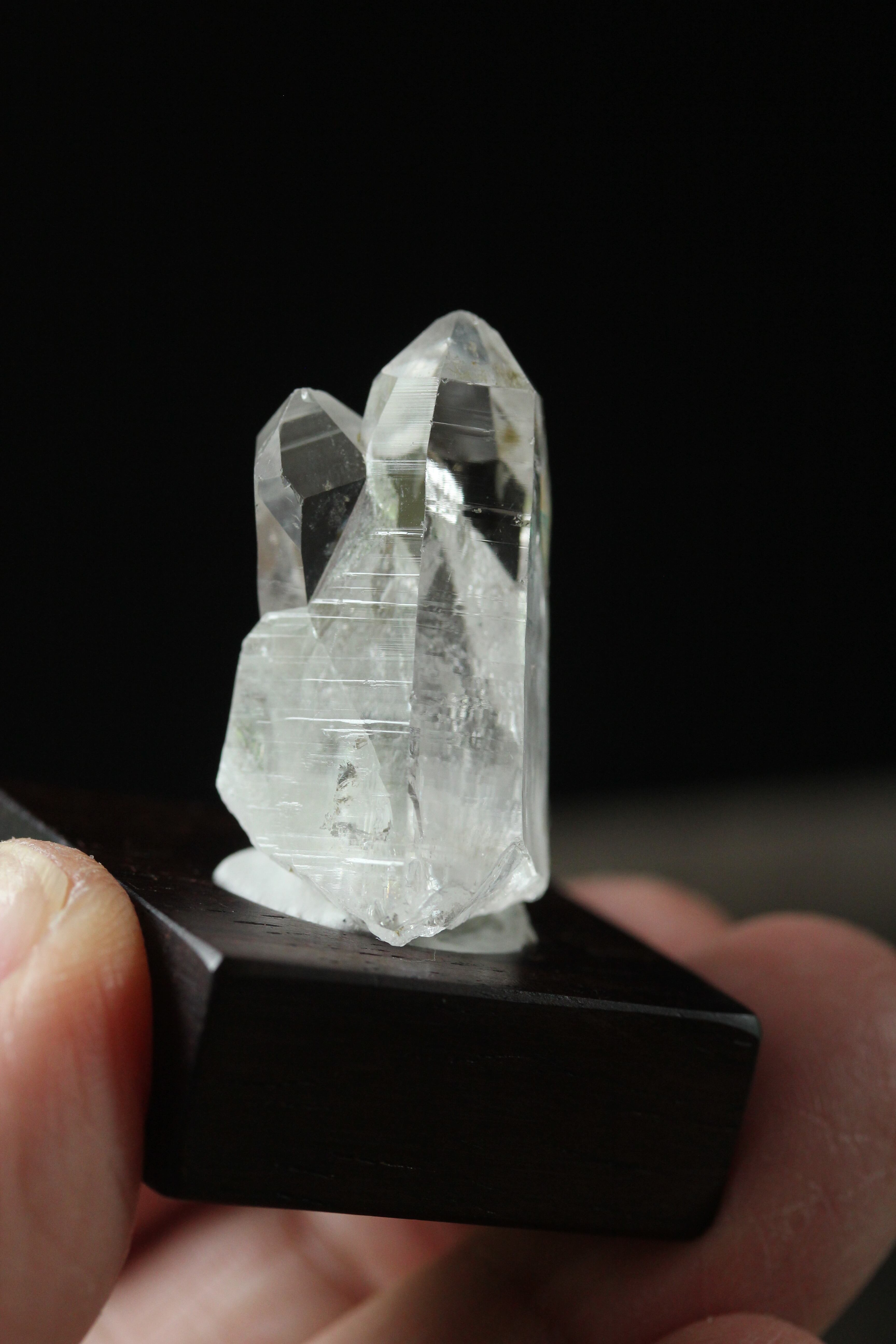 【商品説明】:水晶の原石と高級木材のローズウッドを使用した置物。宮崎クリスタルの中でも、抜群のテリと透明感を誇る日之影町産の水晶。2つが重なった部分のクラックが入り、反射してとてもきれいです。写真ではわかりずらいですが、小さな虹も入っています。ローズウッドベースの大きさ(約30x30x12mm)水晶を置く部分には「座ぐり」と呼ばれる円形の溝を掘っております。簡単のように見えますが、硬い木材のローズウッドに、一定の深さの溝を掘るには、非常に高度な技術を用います。木工歴50年の職人が成せる技です