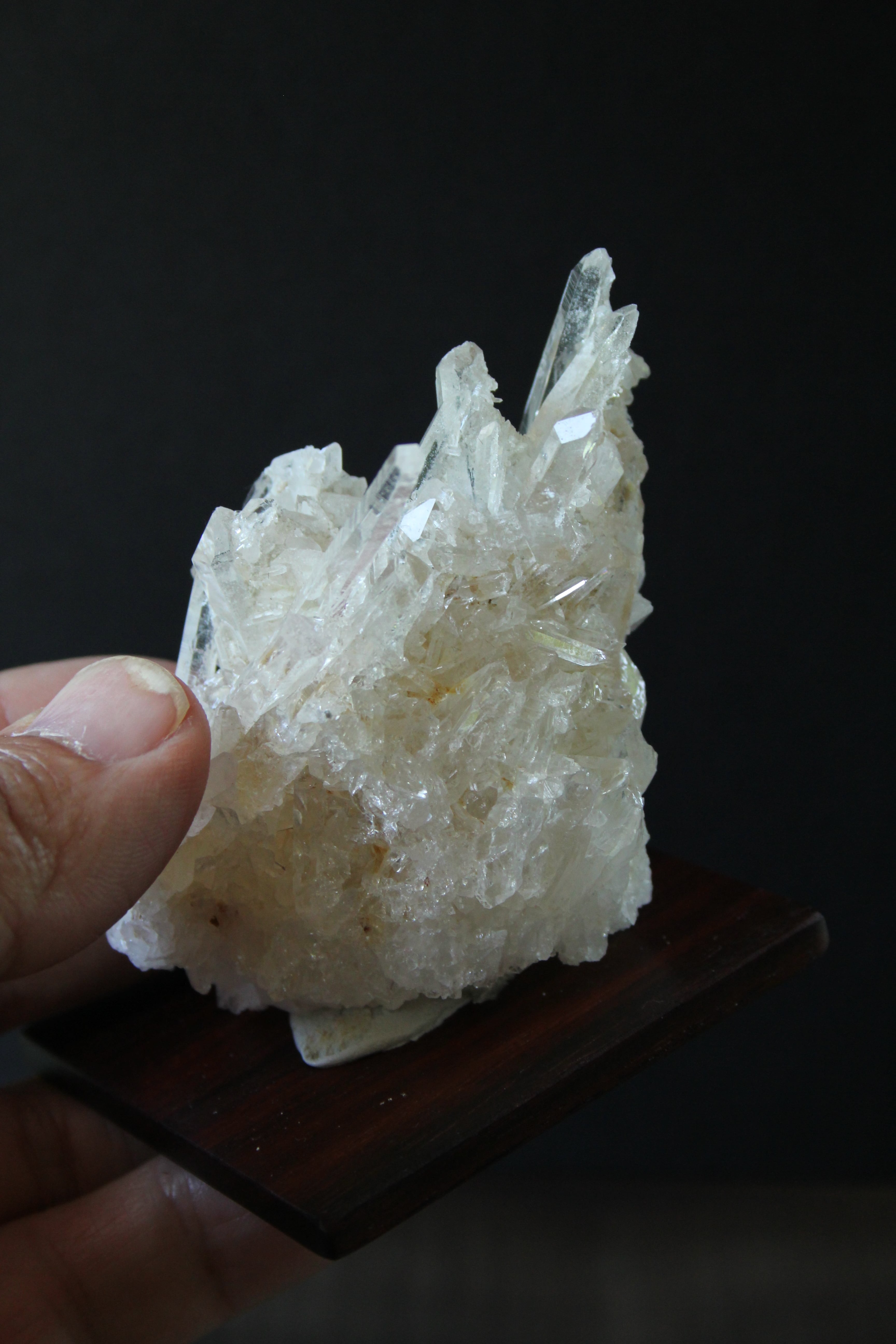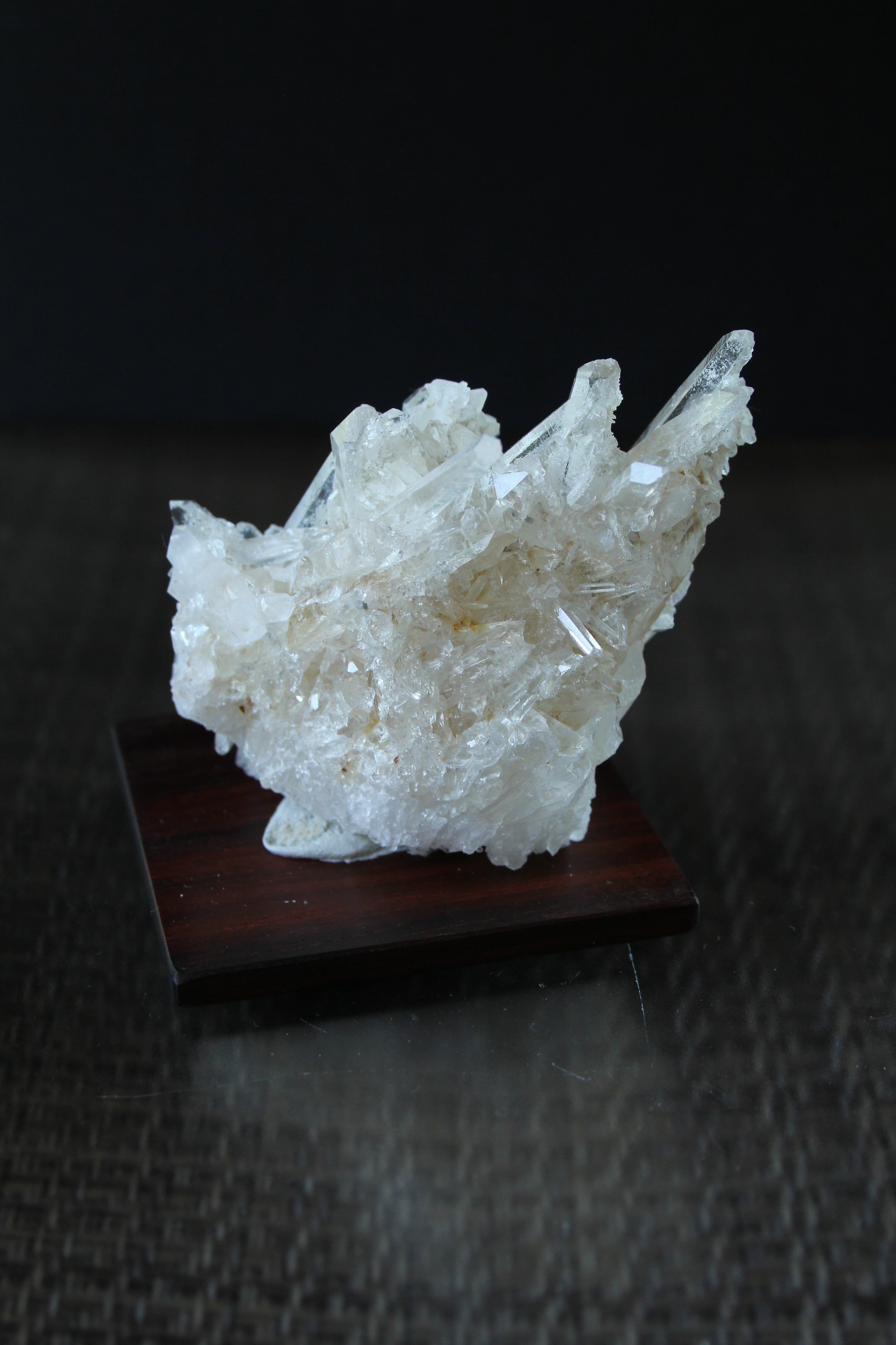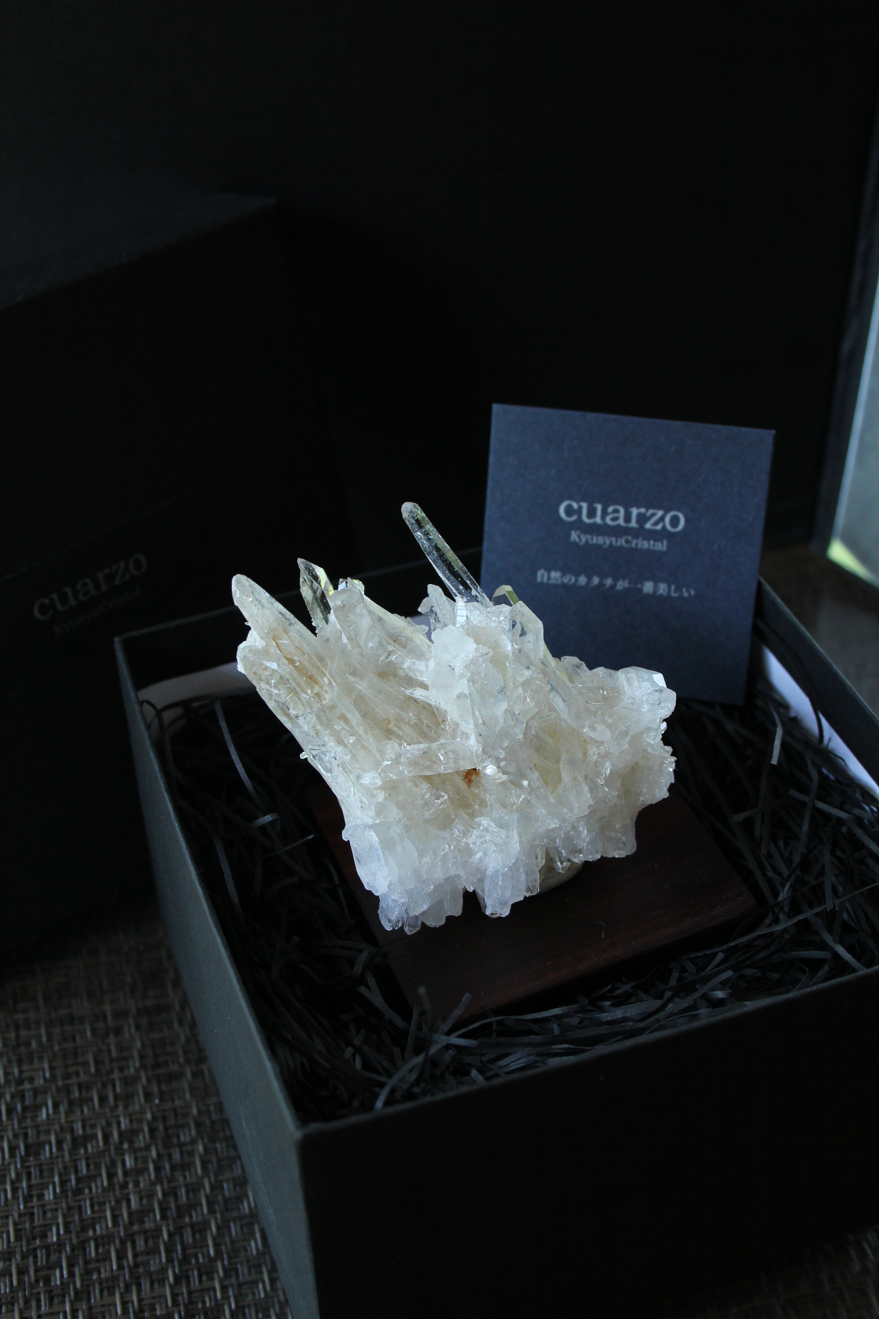 【商品説明】:水晶の原石と高級木材のローズウッドを使用した置物。透明度の高い宮崎産水晶。この産地の特徴をとらえたようなギザギザのクラスターです。細長い水晶は数本飛び出た格好いいクラスターです。ローズウッドスクエア60の大きさ(約60x60x5mm)