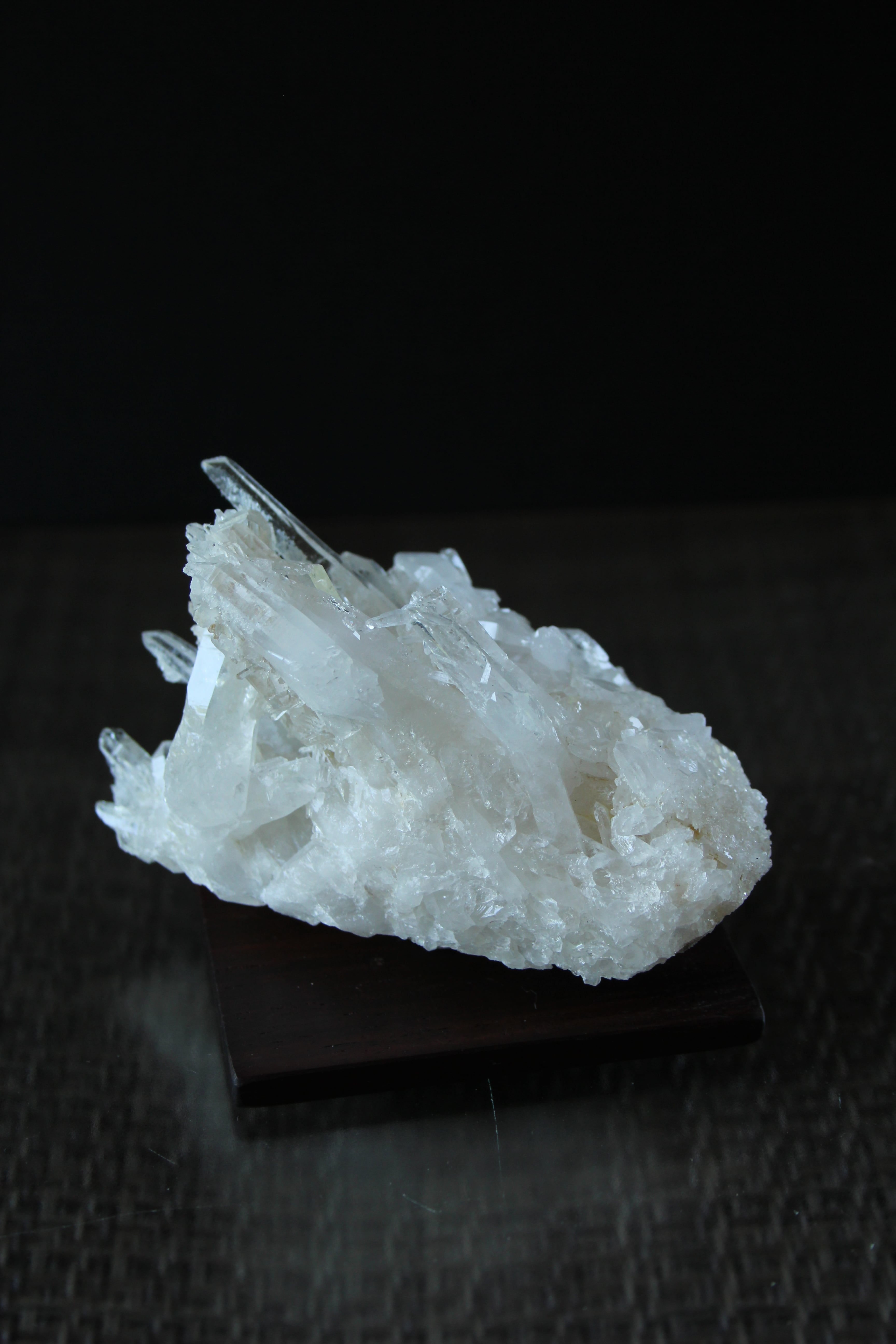 【商品説明】:水晶の原石と高級木材のローズウッドを使用した置物。透明度の高い宮崎産水晶。この産地の特徴をとらえたようなギザギザのクラスターです。真ん中の1本の水晶がギューンと伸びた美しい一品です。ローズウッドスクエア60の大きさ(約60x60x5mm)