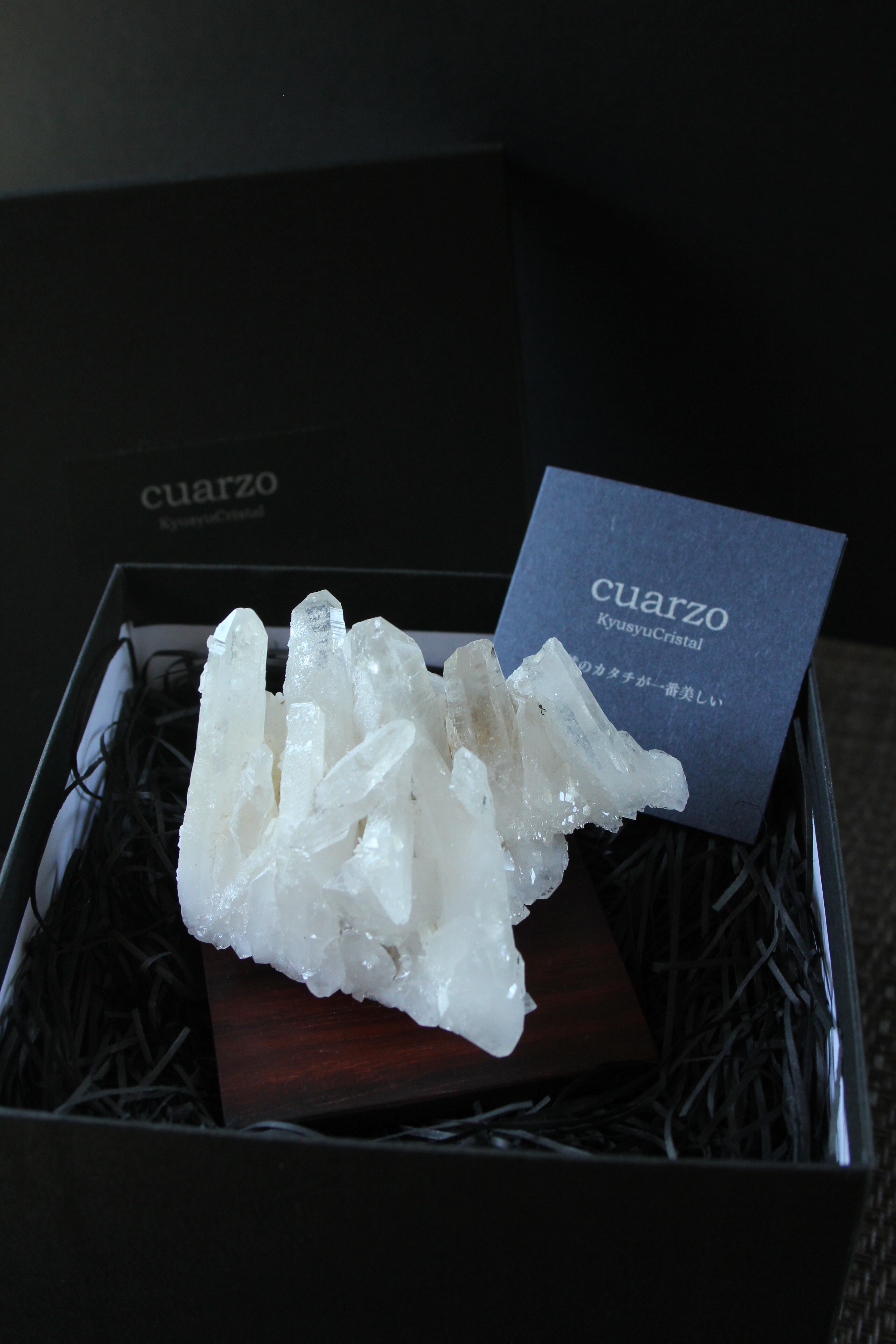 【商品説明】:水晶の原石と高級木材のローズウッドを使用した置物。透明度の高い宮崎産水晶。この産地の特徴をとらえたようなギザギザのクラスターです。少し太めの水晶が何本かまとまったようなクラスターです。ローズウッドスクエア60の大きさ(約60x60x5mm)