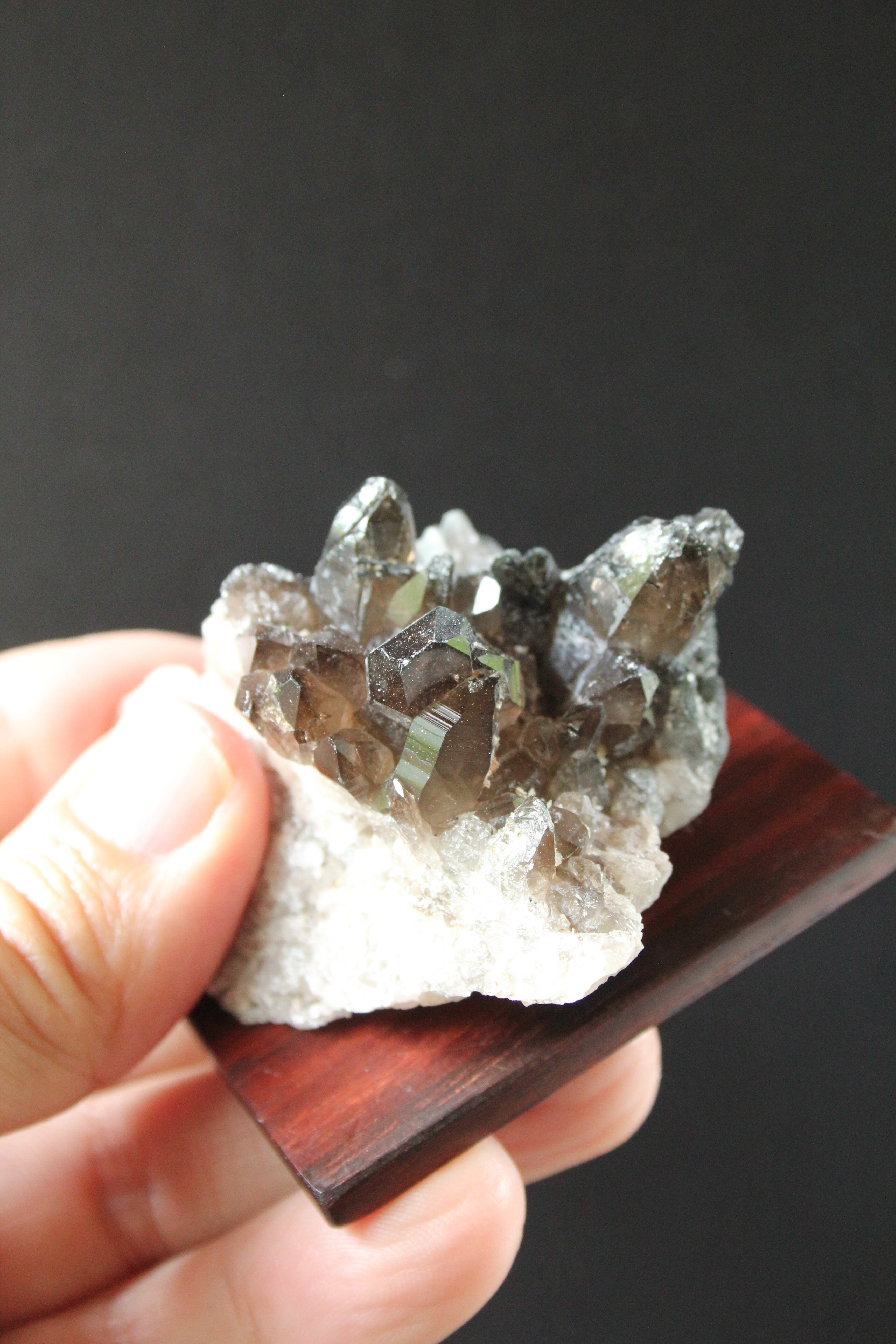 【商品説明】:水晶の原石と高級木材のローズウッドを使用した置物。モリオンに近い、透明感のある宮崎産煙水晶のクラスターです。単体の水晶でみると小さいですが、一つ一つがとてもキレイです。この産地の中でも、モリオンに近い黒っぽい煙水晶が取れるのは、ごく限られた地域です。ローズウッドスクエア60の大きさ(約60x60x5mm)