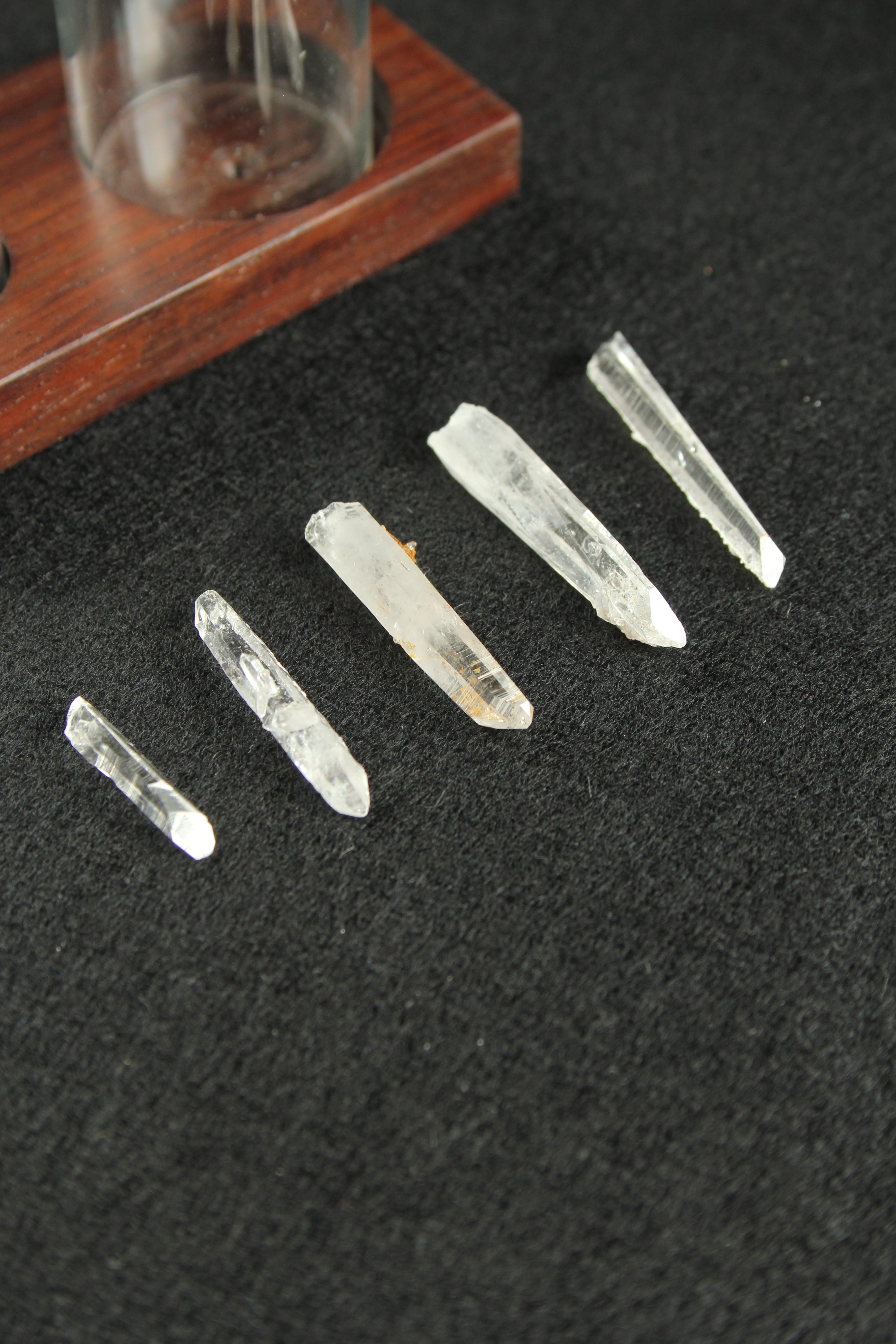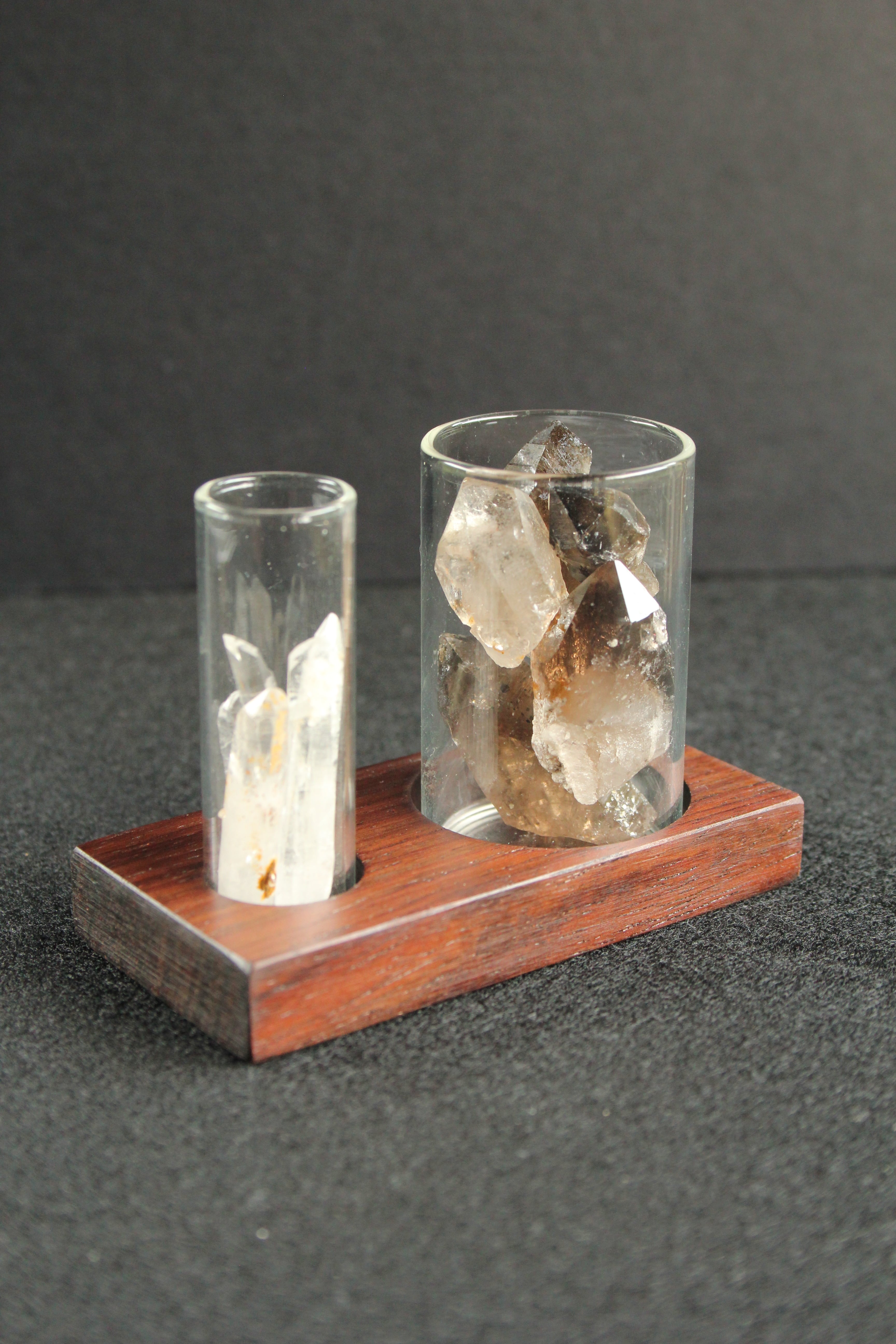 【商品説明】:宮崎産の透明度高い水晶と、ほんのり茶色からモリオンに近い黒水晶など、バリエーションが豊富な煙水晶を各5本づつガラス製の試験管に詰めたセット。試験管台は、もちろんローズウッド。水晶は欠けや傷はありますが、宮崎産水晶の原石をお手元に置きたい人は、とってもお得なセットです。