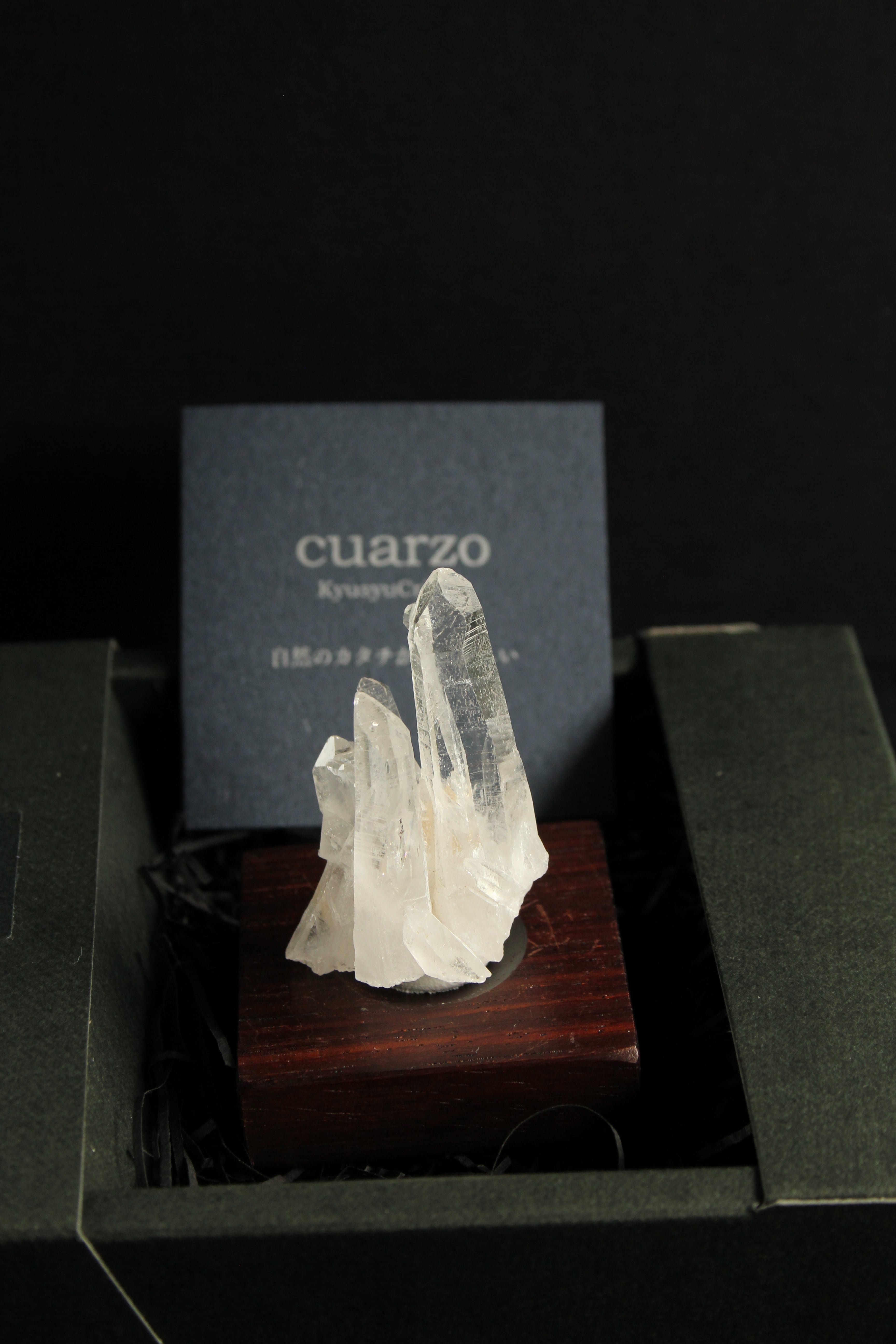 【商品説明】:水晶の原石と高級木材のローズウッドを使用した置物。コロンビアレムリアンを彷彿させるような透明度が高い宮崎県西米良産水晶。かわいいミニクラスターです。ローズウッドベースの大きさ(約40x40x12mm)水晶を置く部分には「座ぐり」と呼ばれる円形の溝を掘っております。簡単のように見えますが、硬い木材のローズウッドに、一定の深さの溝を掘るには、非常に高度な技術を用います。木工歴50年の職人が成せる技です