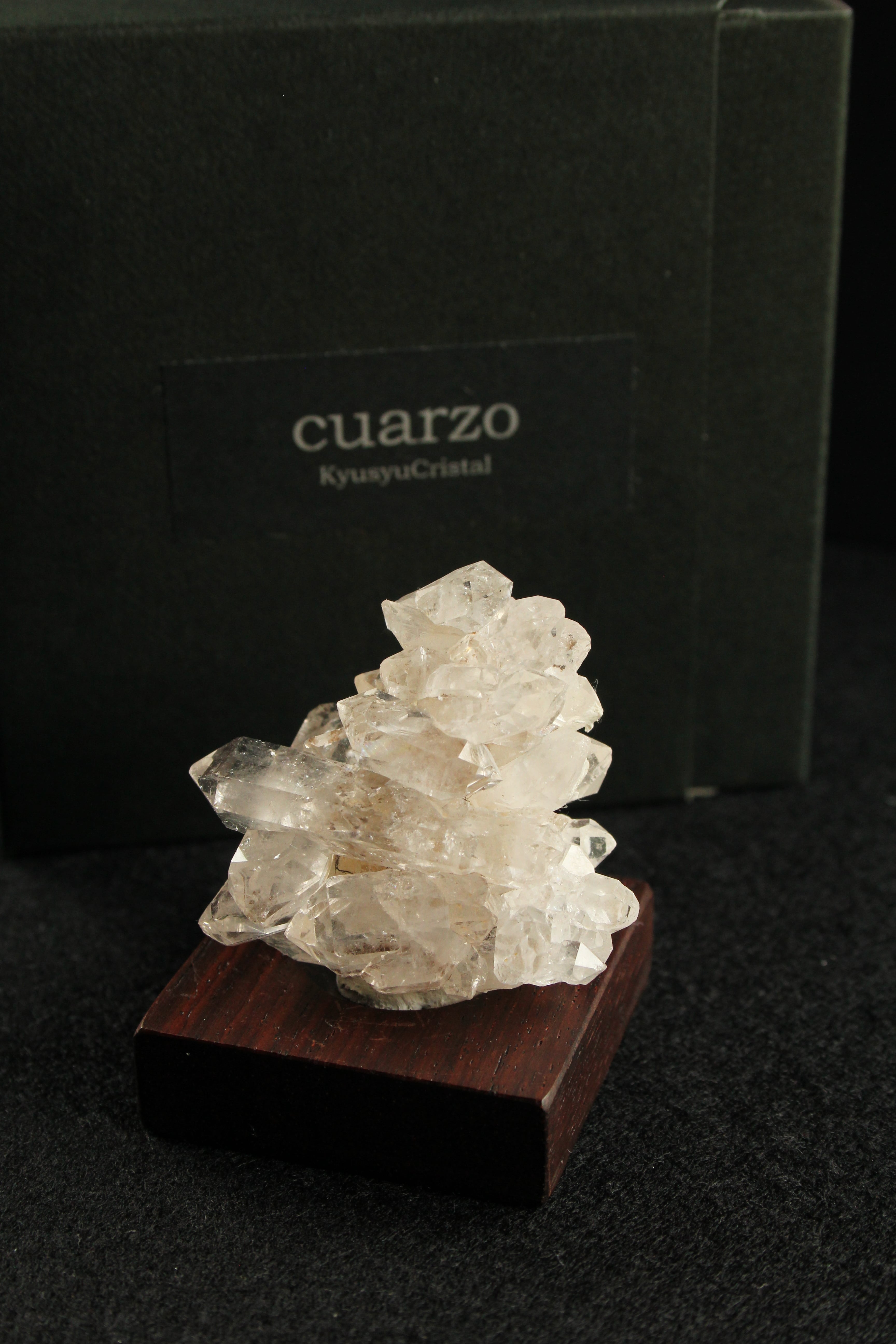 【商品説明】:水晶の原石と高級木材のローズウッドを使用した置物。ズシリと重く存在感のある短い感じの宮崎産水晶クラスターです。両錐が集まり上下左右に伸びた、この産地でも珍しい水晶です。ローズウッドベースの大きさ(約40x40x12mm)水晶を置く部分には「座ぐり」と呼ばれる円形の溝を掘っております。簡単のように見えますが、硬い木材のローズウッドに、一定の深さの溝を掘るには、非常に高度な技術を用います。木工歴50年の職人が成せる技です