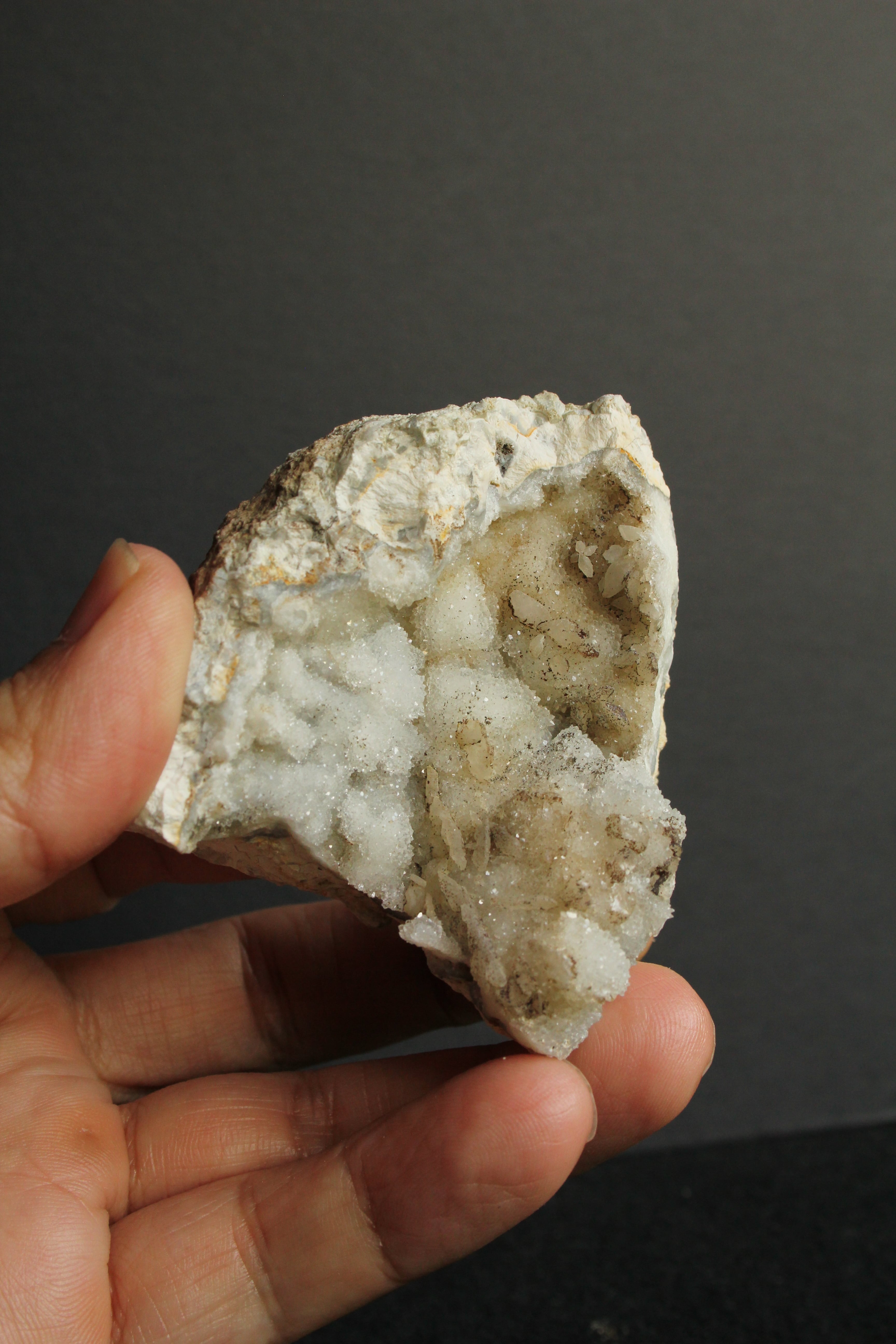 【商品説明】:ジオードの原石オンリー。日本ではとても珍しい球顆流紋岩のジオード。空洞の中、全体にキラキラ水晶または方解石が見られます。