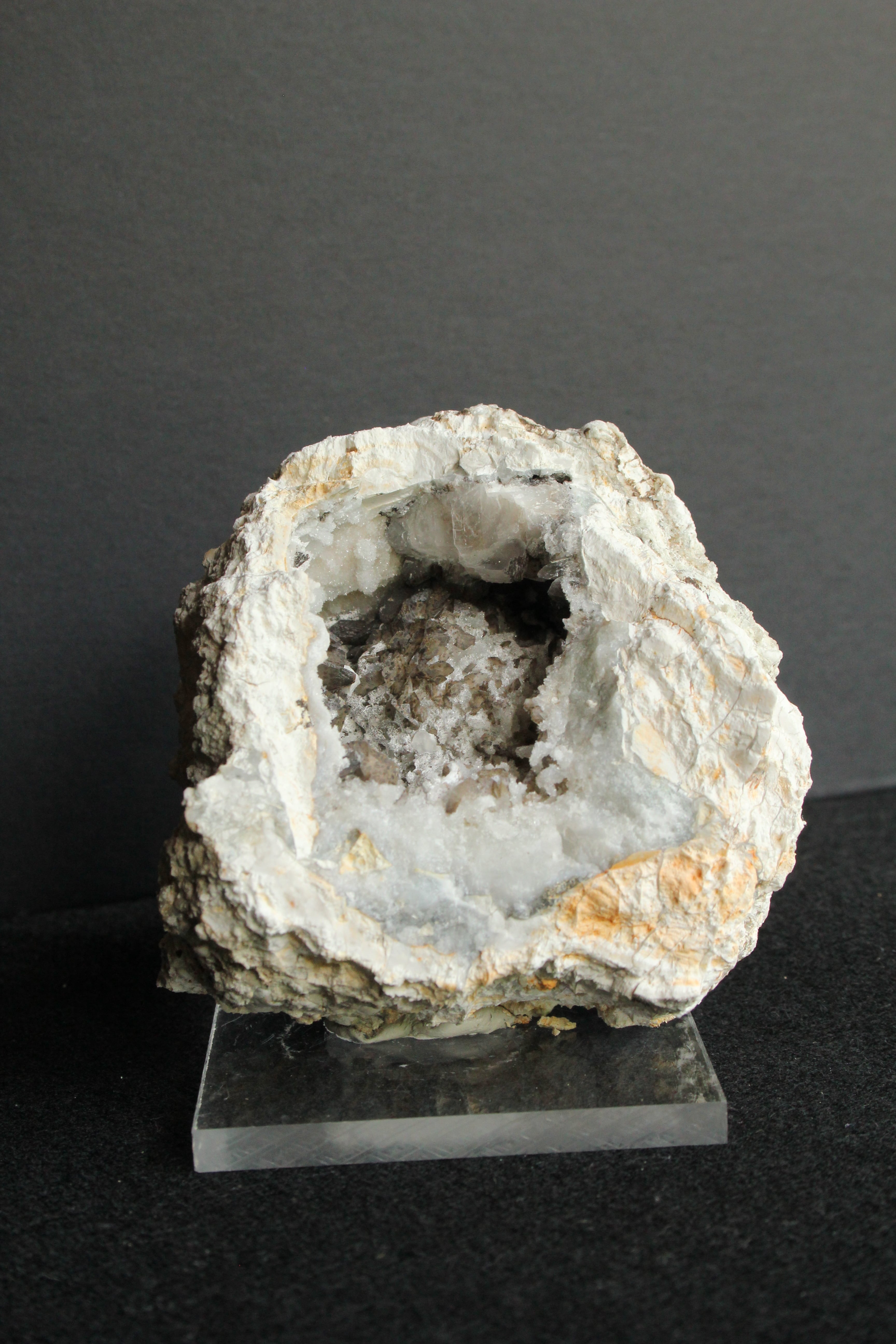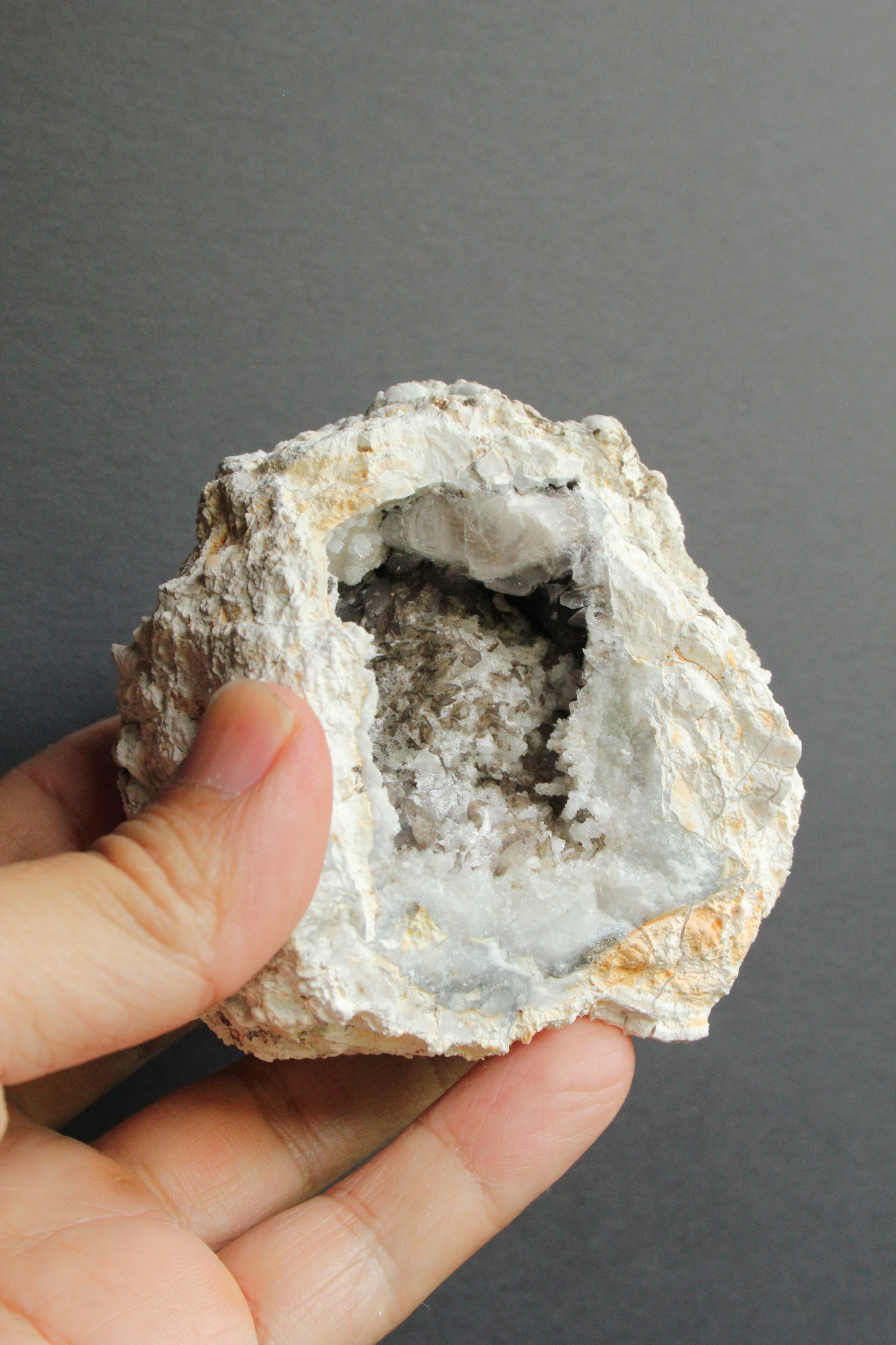 【商品説明】:ジオードの原石オンリー。日本ではとても珍しい球顆流紋岩のジオード。空洞の中、全体にキラキラ水晶または方解石が見られます。
