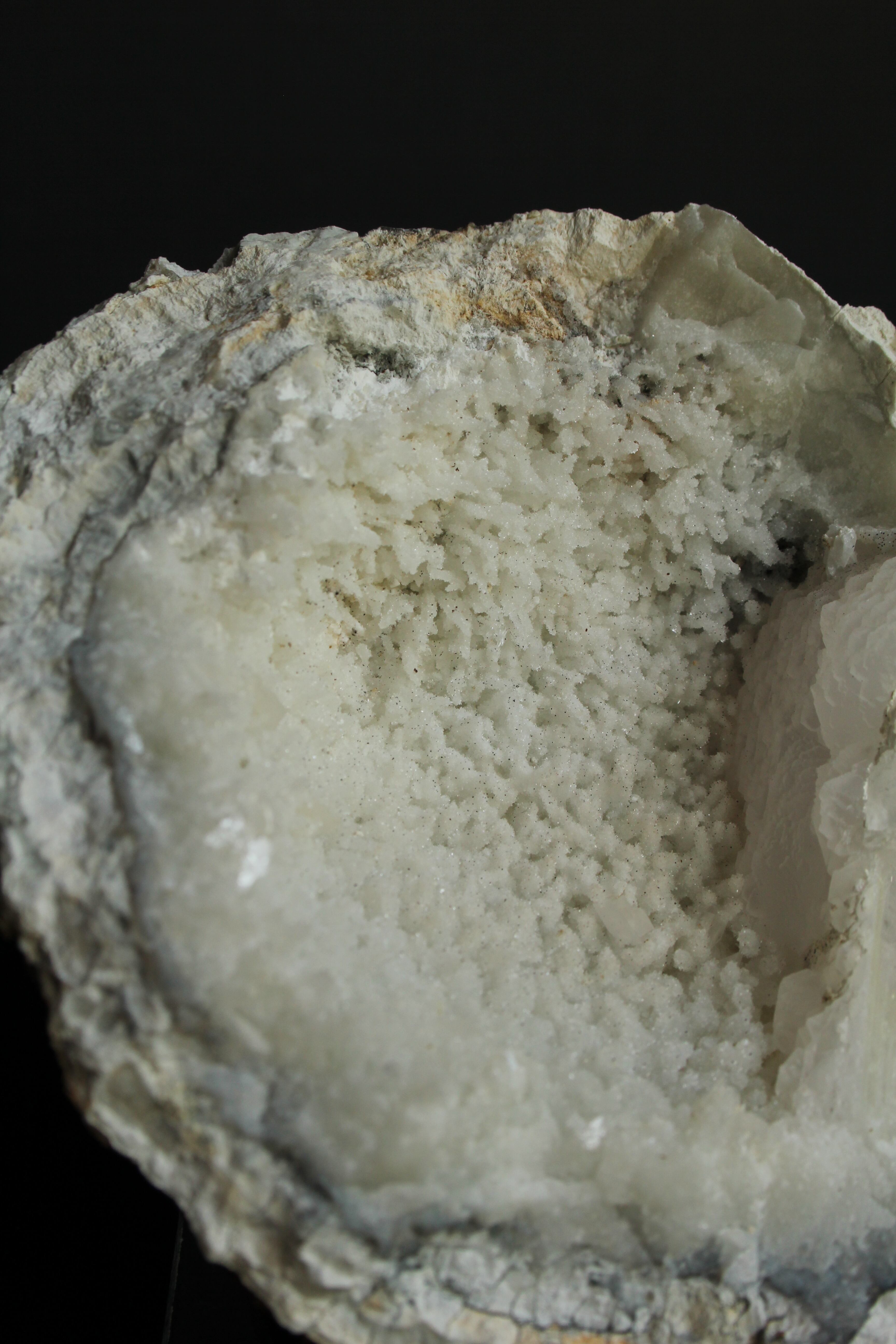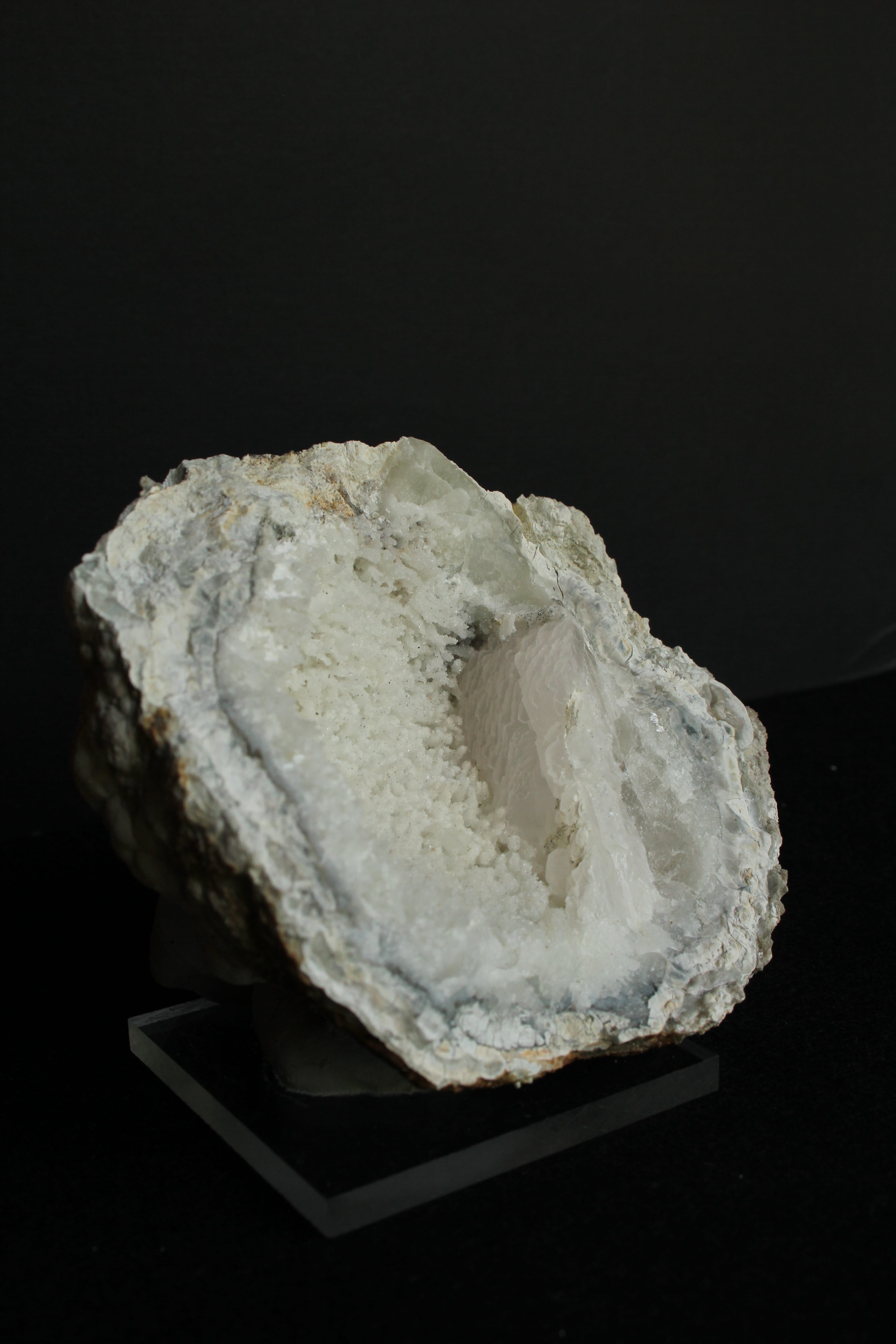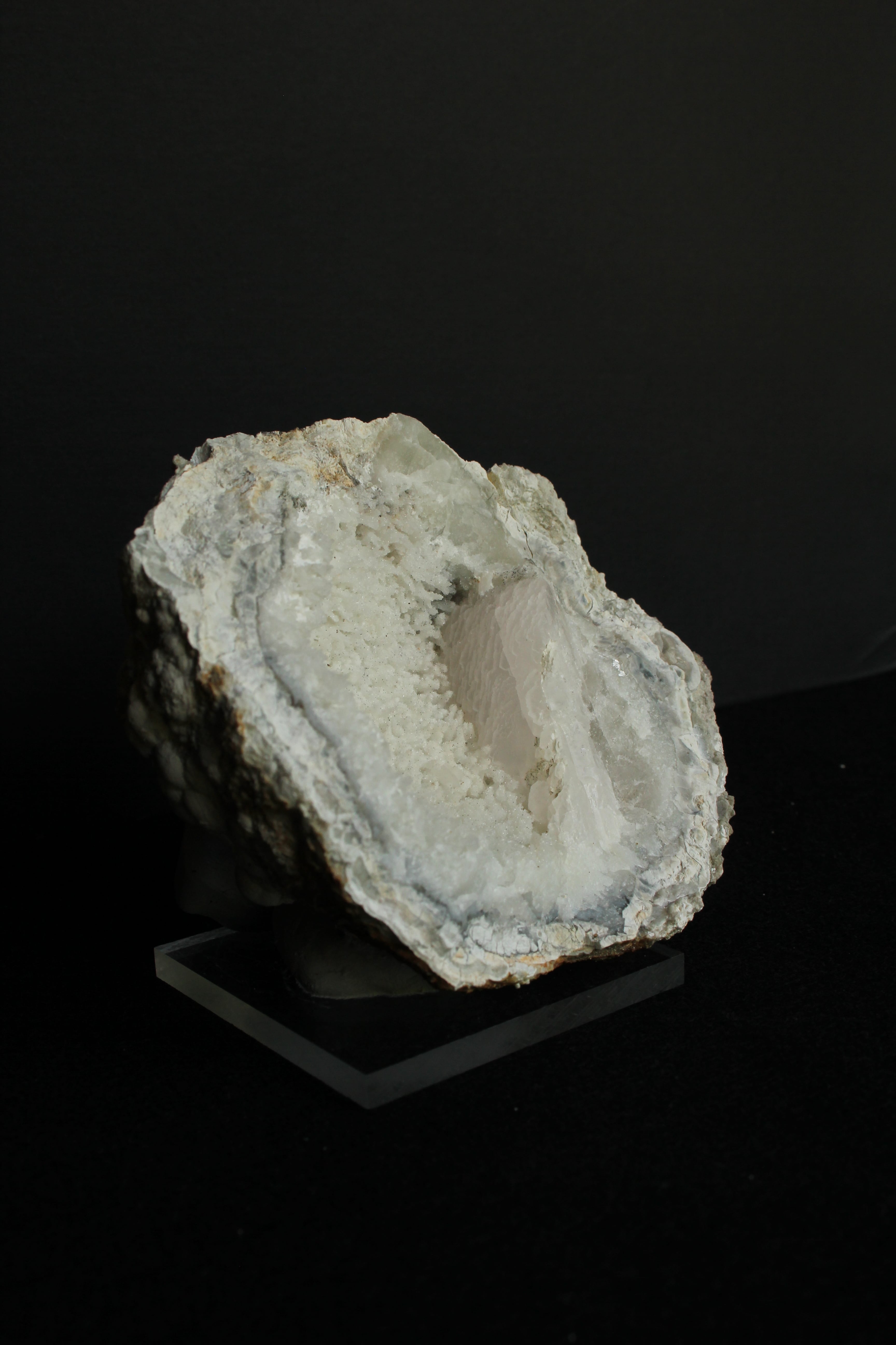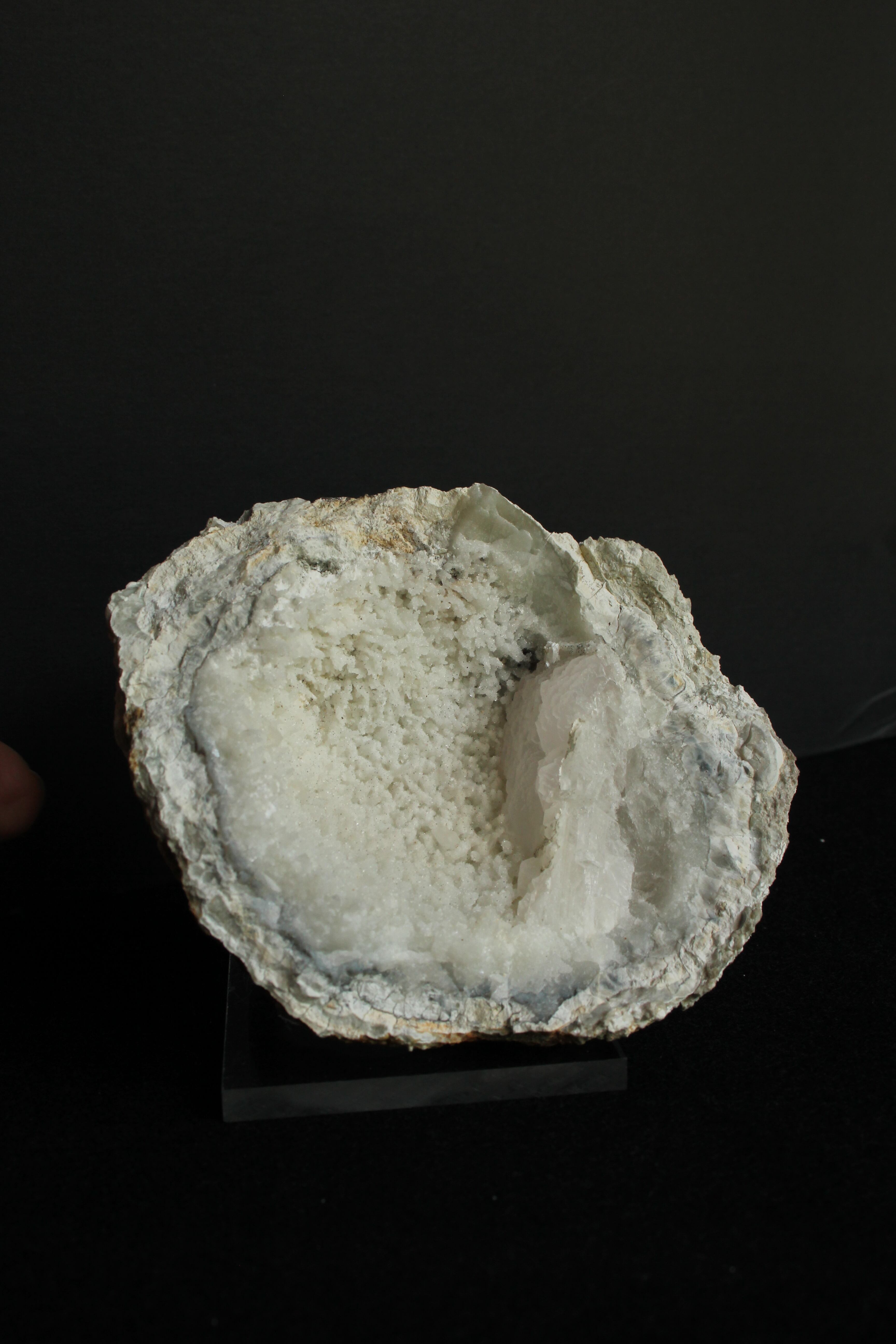 【商品説明】:ジオードの原石オンリー。日本ではとても珍しい球顆流紋岩のジオード。空洞の中、全体にキラキラ水晶または方解石が見られます。