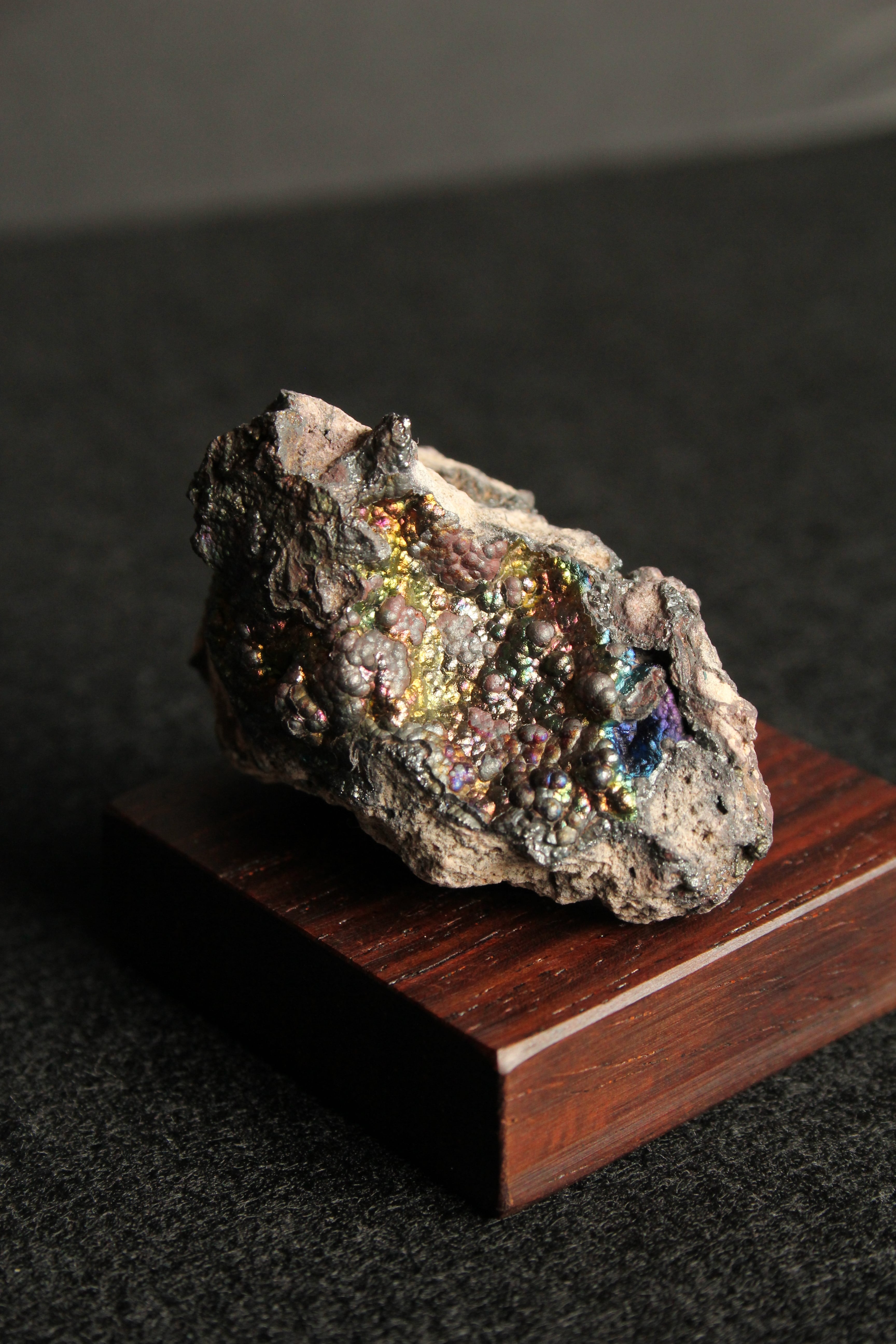 【商品説明】:宮崎産赤鉄鉱の原石と高級木材のローズウッドを使用した置物。赤鉄鋼の表面に酸化皮膜がコーティングされ、光の回折・干渉作用によって遊色に輝く天然のレインボーヘマタイトです。スペインなどの海外産のものは、NETなどでたまに見かけますが、国産のレインボーヘマタイトは非常に珍しいです。形状はブツブツした葡萄状と、ミルフィーユのように層になったものがありますが、こちらは葡萄状です。黄色、銀色、青色などが出ているとてもキレイなレインボーヘマタイトです。ローズウッドベースの大きさ(約40x40x12mm)原石を置く部分には「座ぐり」と呼ばれる円形の溝を掘っております。簡単のように見えますが、硬い木材のローズウッドに、一定の深さの溝を掘るには、非常に高度な技術を用います。木工歴50年の職人が成せる技です