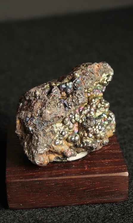 【商品説明】:宮崎産赤鉄鉱の原石と高級木材のローズウッドを使用した置物。赤鉄鋼の表面に酸化皮膜がコーティングされ、光の回折・干渉作用によって遊色に輝く天然のレインボーヘマタイトです。スペインなどの海外産のものは、NETなどでたまに見かけますが、国産のレインボーヘマタイトは非常に珍しいです。形状はブツブツした葡萄状と、ミルフィーユのように層になったものがありますが、こちらは葡萄状です。銀色、青色、黄色などが出ているとてもキレイなレインボーヘマタイトです。ローズウッドベースの大きさ(約40x40x12mm)原石を置く部分には「座ぐり」と呼ばれる円形の溝を掘っております。簡単のように見えますが、硬い木材のローズウッドに、一定の深さの溝を掘るには、非常に高度な技術を用います。木工歴50年の職人が成せる技です