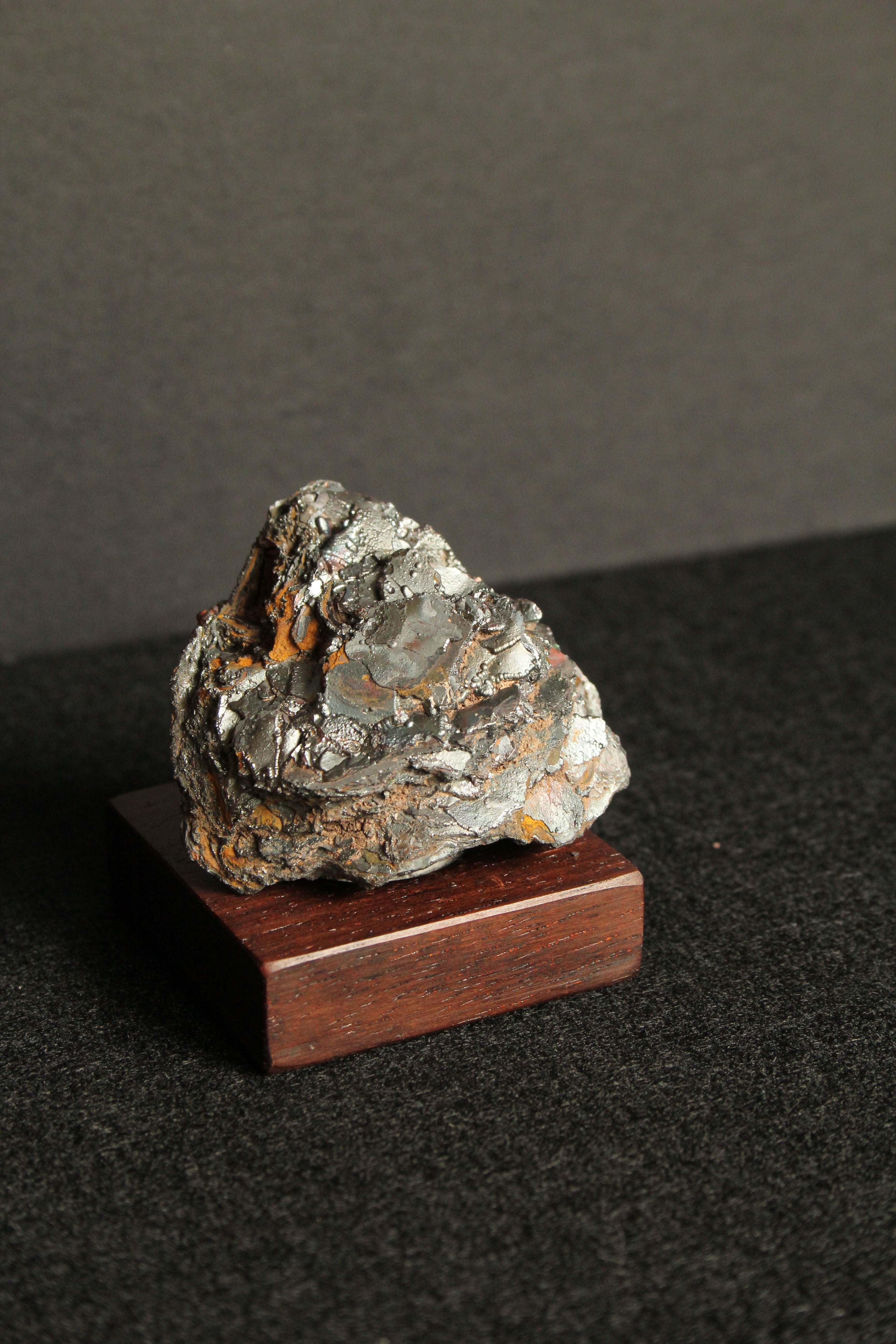 【商品説明】:宮崎産赤鉄鉱の原石と高級木材のローズウッドを使用した置物。赤鉄鋼の表面に酸化皮膜がコーティングされ、光の回折・干渉作用によって遊色に輝く天然のレインボーヘマタイトです。スペインなどの海外産のものは、NETなどでたまに見かけますが、国産のレインボーヘマタイトは非常に珍しいです。形状はブツブツした葡萄状と、ミルフィーユのように層になったものがありますが、こちらはミルフィーユ状です。銀色が全面に出ているとてもキレイなレインボーヘマタイトです。ローズウッドベースの大きさ(約40x40x12mm)原石を置く部分には「座ぐり」と呼ばれる円形の溝を掘っております。簡単のように見えますが、硬い木材のローズウッドに、一定の深さの溝を掘るには、非常に高度な技術を用います。木工歴50年の職人が成せる技です