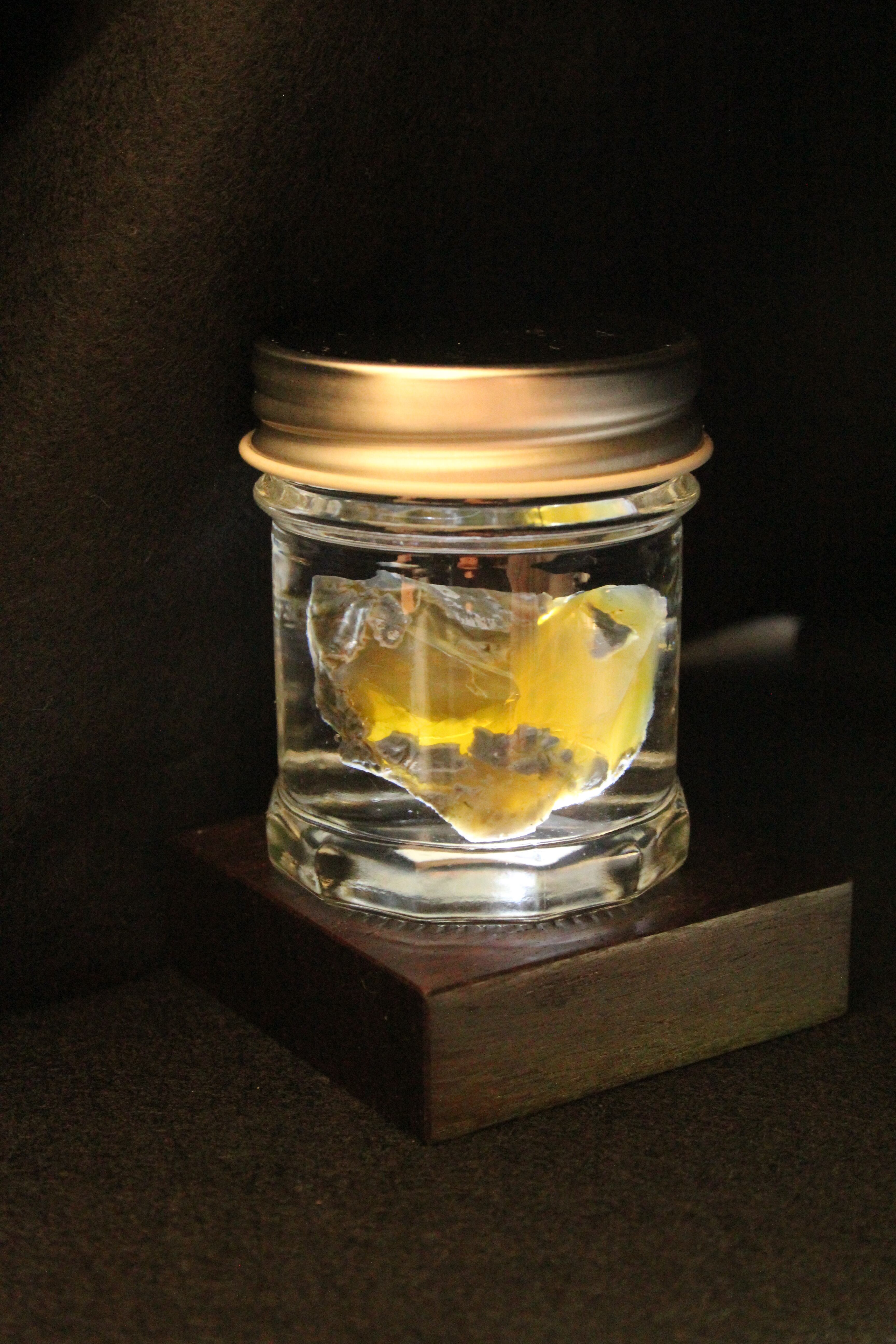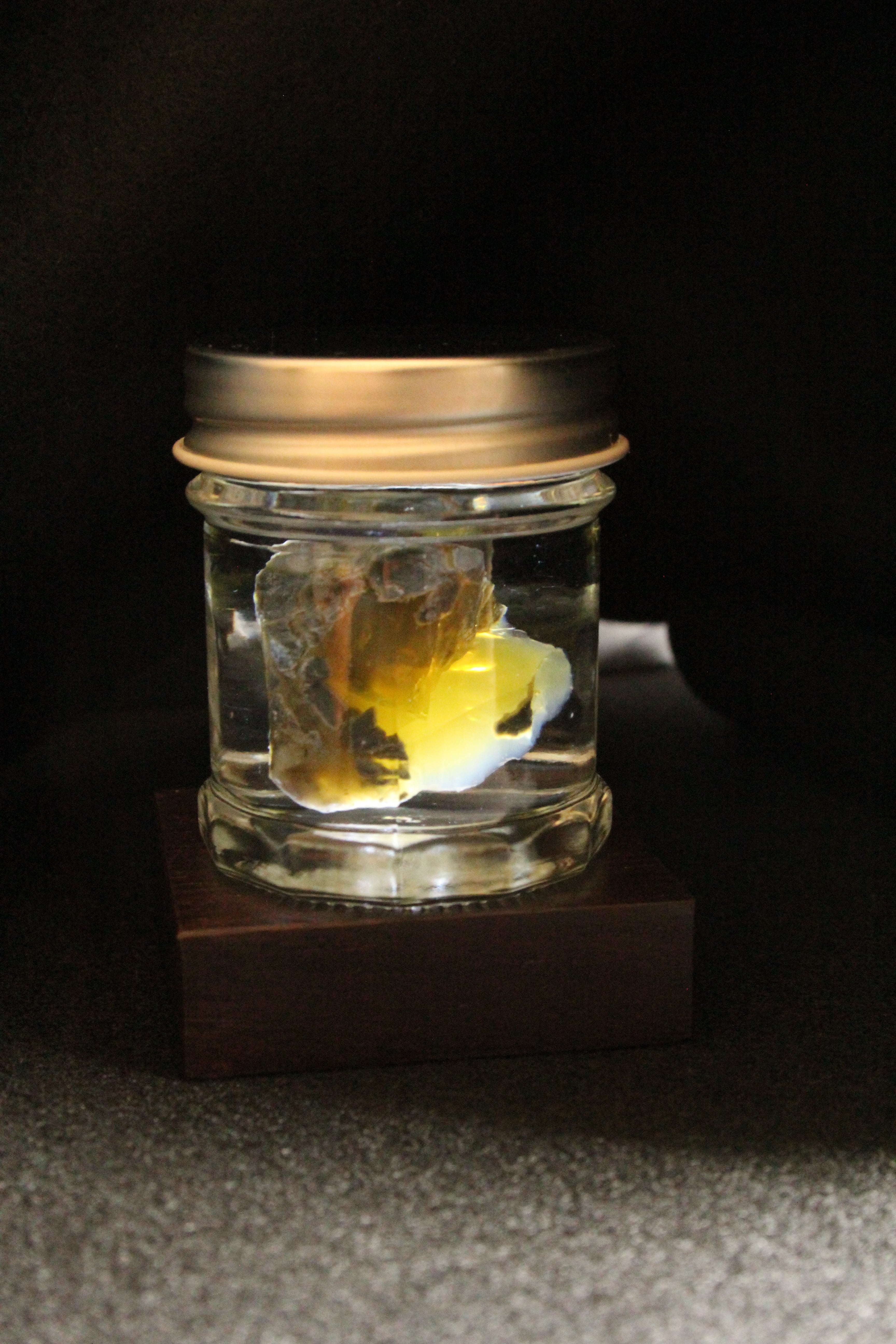 【商品説明】:オパールの原石を使ったアクアリウム。ローズウッドのベースには、LEDが付いており、下から光を当てることができます。このオパールの色は淡い緑色をしている。オパールは、化学式でもわかるように(SIO2・nH2O)多くの水分を含くむ石なので、水につけたままの保管を推奨いたします。