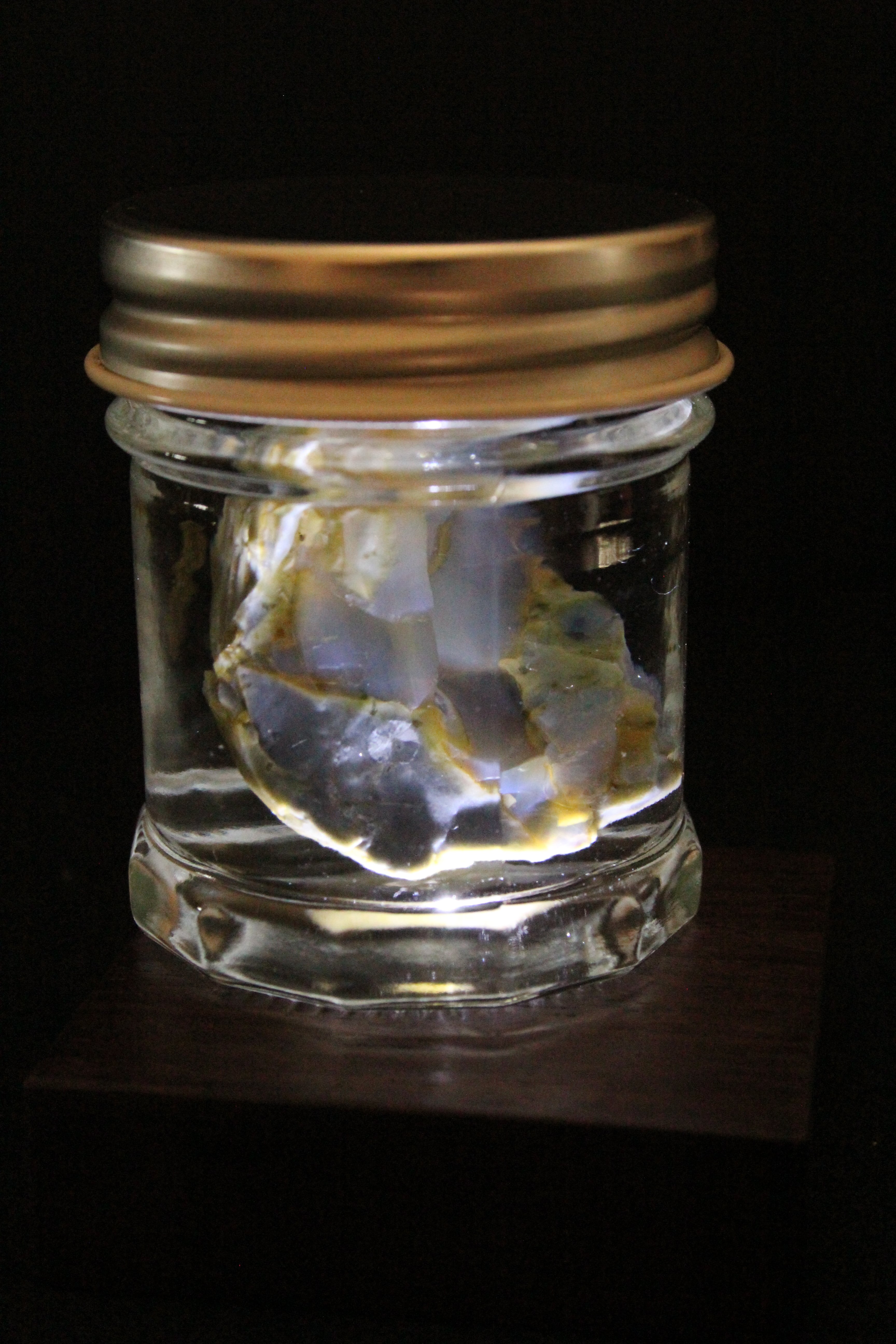 【商品説明】:オパールの原石を使ったアクアリウム。ローズウッドのベースには、LEDが付いており、下から光を当てることができます。このオパールの色は、白~薄い緑色をしている。オパールは、化学式でもわかるように(SIO2・nH2O)多くの水分を含くむ石なので、水につけたままの保管を推奨いたします。