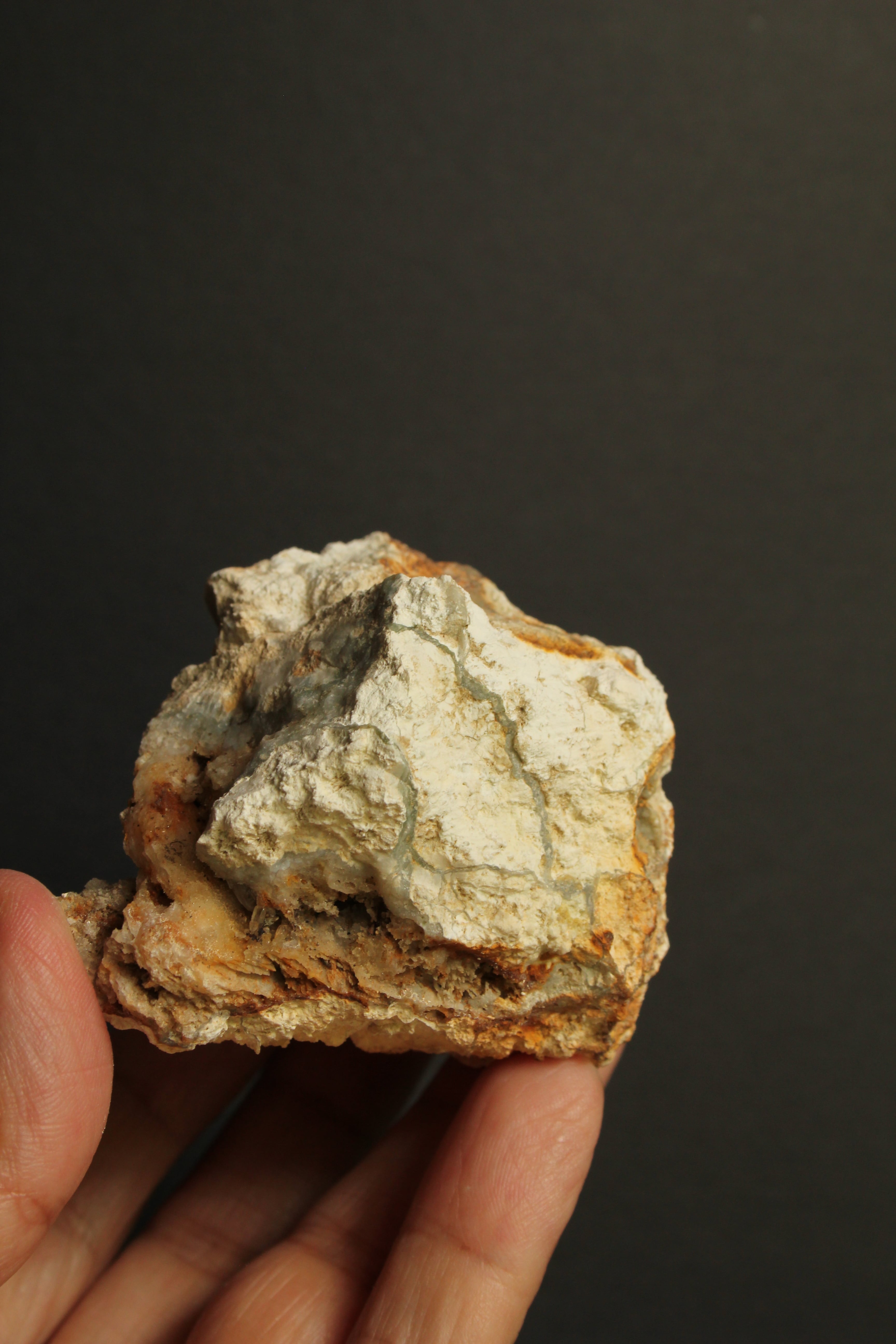 【産地の特徴】:日本では数少ないジオードが見つかる産地。白っぽい粘土質の崖から丸い玉石が出てくる。この石は、球顆流紋岩。流紋岩は花崗岩と同じような成分だが、花崗岩はマグマが地下深くでくゆっくり固まってできるのに対し,流紋岩は地表付近で急に冷えて固まる。ここの球顆流紋岩は、中が空洞になるものがあり、そこから水晶や方解石が出てくる。丸い石の全て空洞になっている訳では無く、空洞でも水晶が出てくるか、方解石が出てくるかはわかない。
