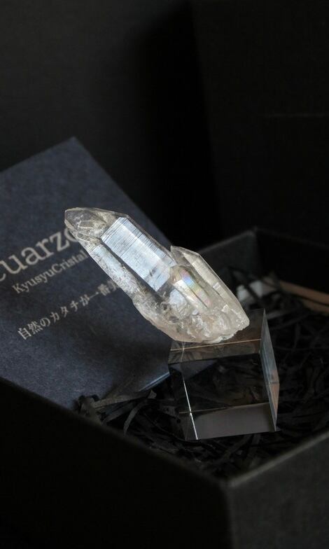 【商品説明】:水晶の原石とアクリルキューブを使用した置物。コロンビアレムリアンを彷彿させるような透明度が高い宮崎県西米良産水晶。この産地の特徴でもあるスパっと切ったような頭をしています。アクリルキューブの大きさ(約15x15x15mm)