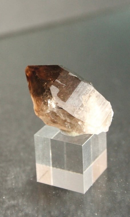 【商品説明】:煙水晶の原石とアクリルキューブを使用した置物。モリオンに近い感じの透明感溢れる宮崎産の煙水晶です。頭は綺麗な六角錐をしています。アクリルキューブの大きさ(約15x15x15mm)