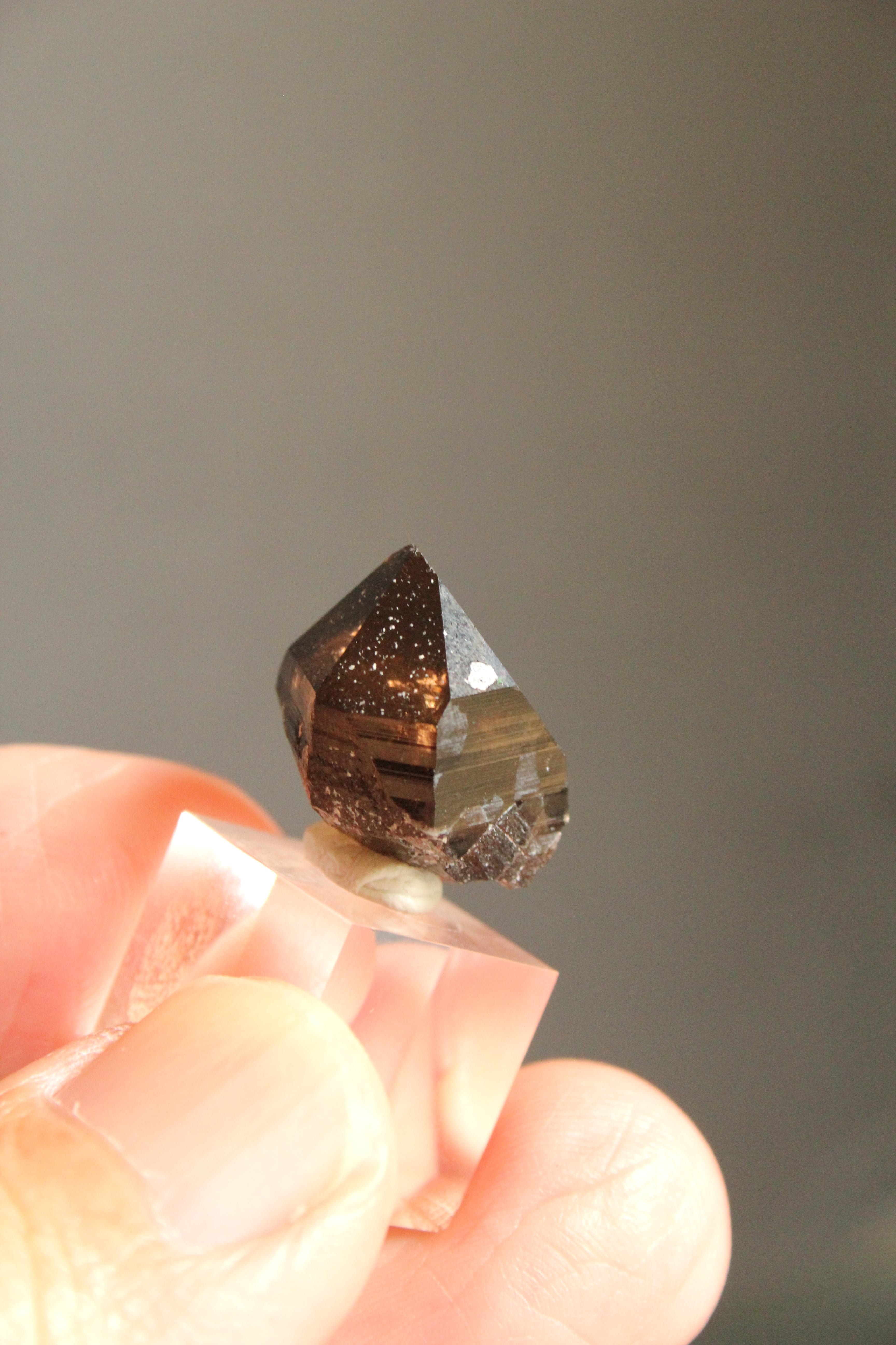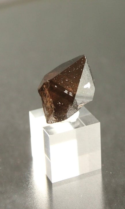 【商品説明】:煙水晶の原石とアクリルキューブを使用した置物。ほぼモリオンのように黒く、小さいですが、コロンとしたかわいい感じの宮崎産の煙水晶です。アクリルキューブの大きさ(約15x15x15mm)