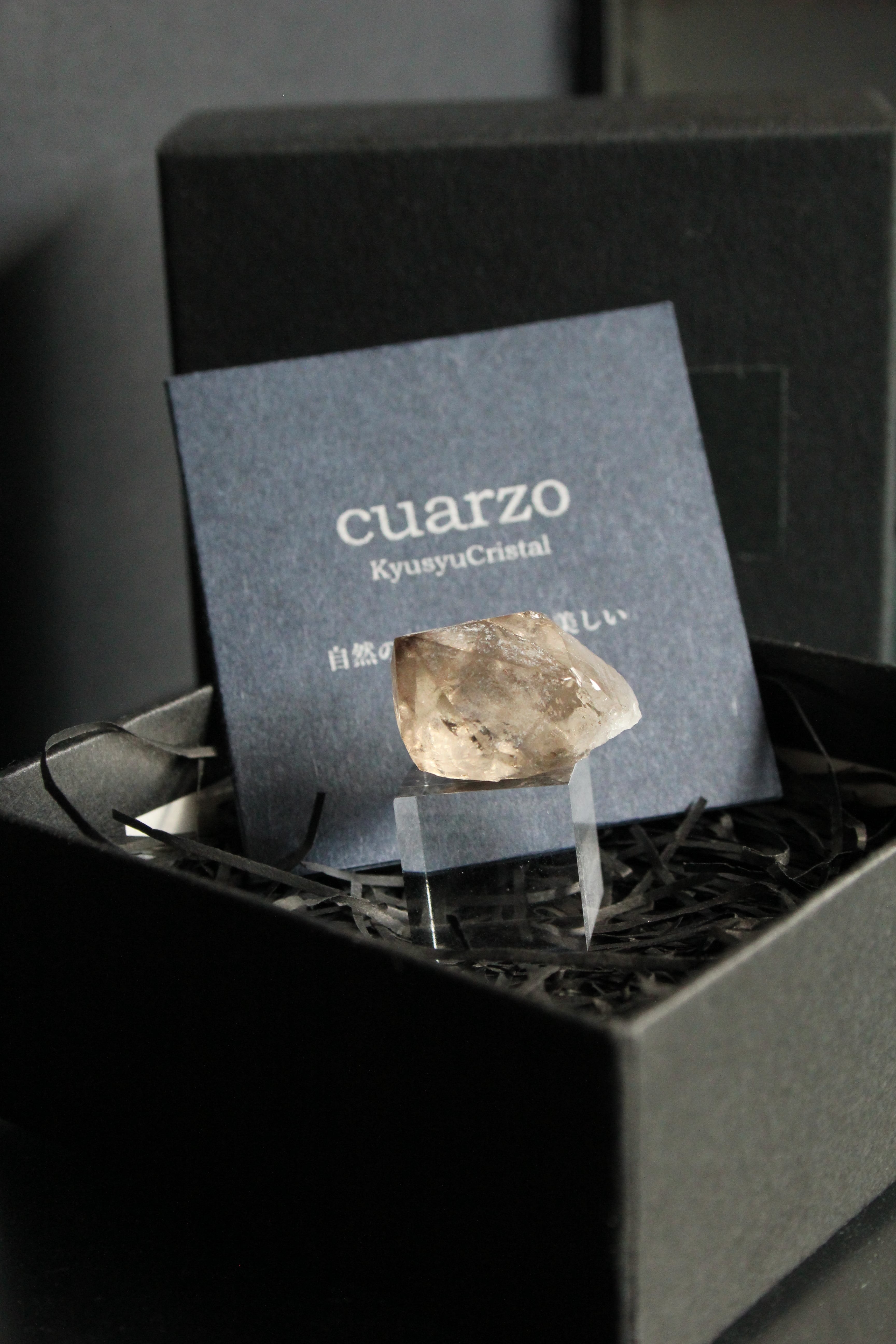 【商品説明】:煙水晶の原石とアクリルキューブを使用した置物。どちらかというとグレーに近い感じの透明感溢れる宮崎産の煙水晶です。アクリルキューブの大きさ(約15x15x15mm)