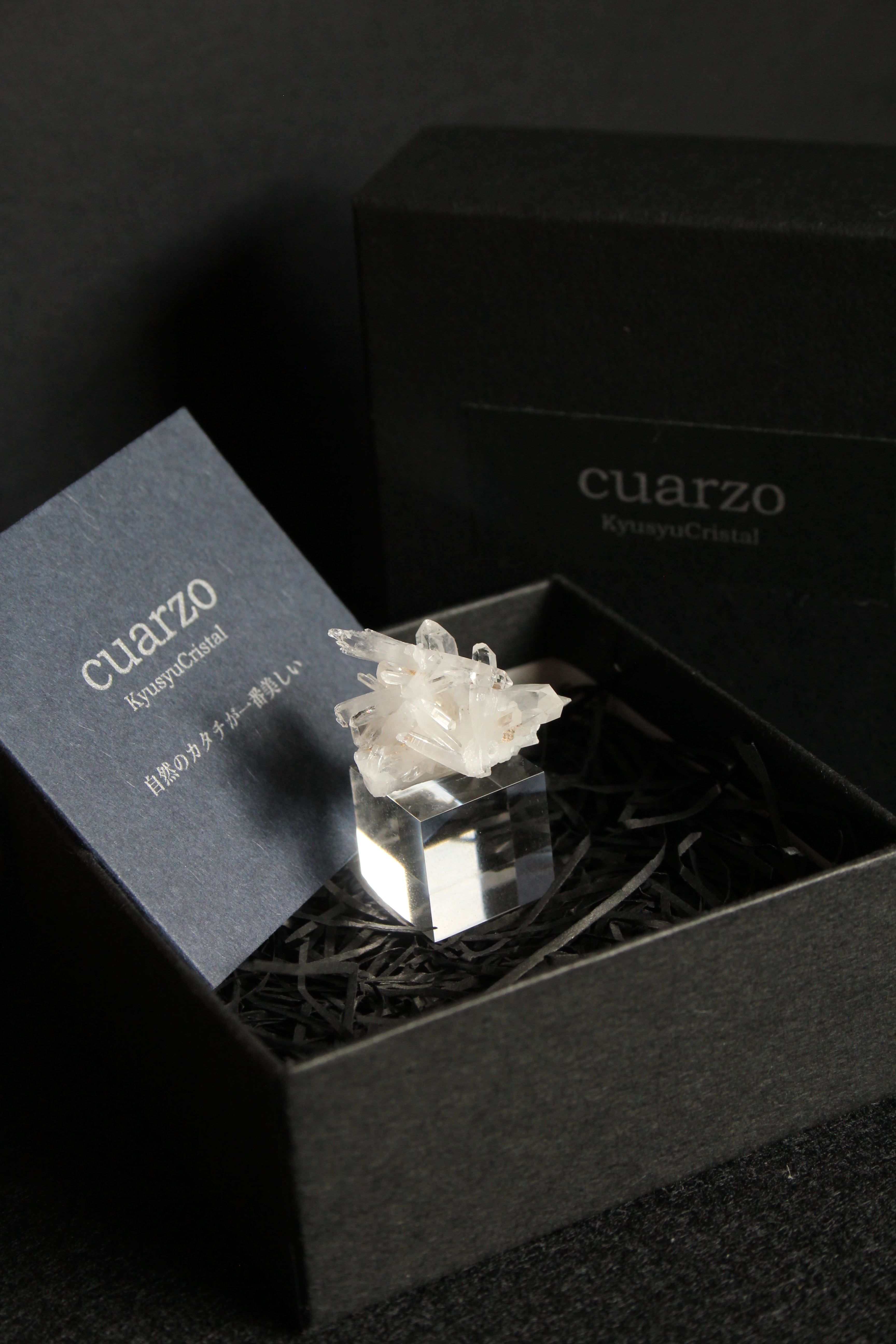 【商品説明】:クラスター水晶の原石とアクリルキューブを使用した置物。様々な方向に自由気ままに伸びている大分産のミニ水晶クラスターです。各ポイントの先はとても透明度が高いです。ここの水晶は、スパっと輪切りにカットすると、断面が桜の花びらのような模様に見えるらしく、そのことから「桜水晶」と言われています。アクリルキューブの大きさ(約15x15x15mm)