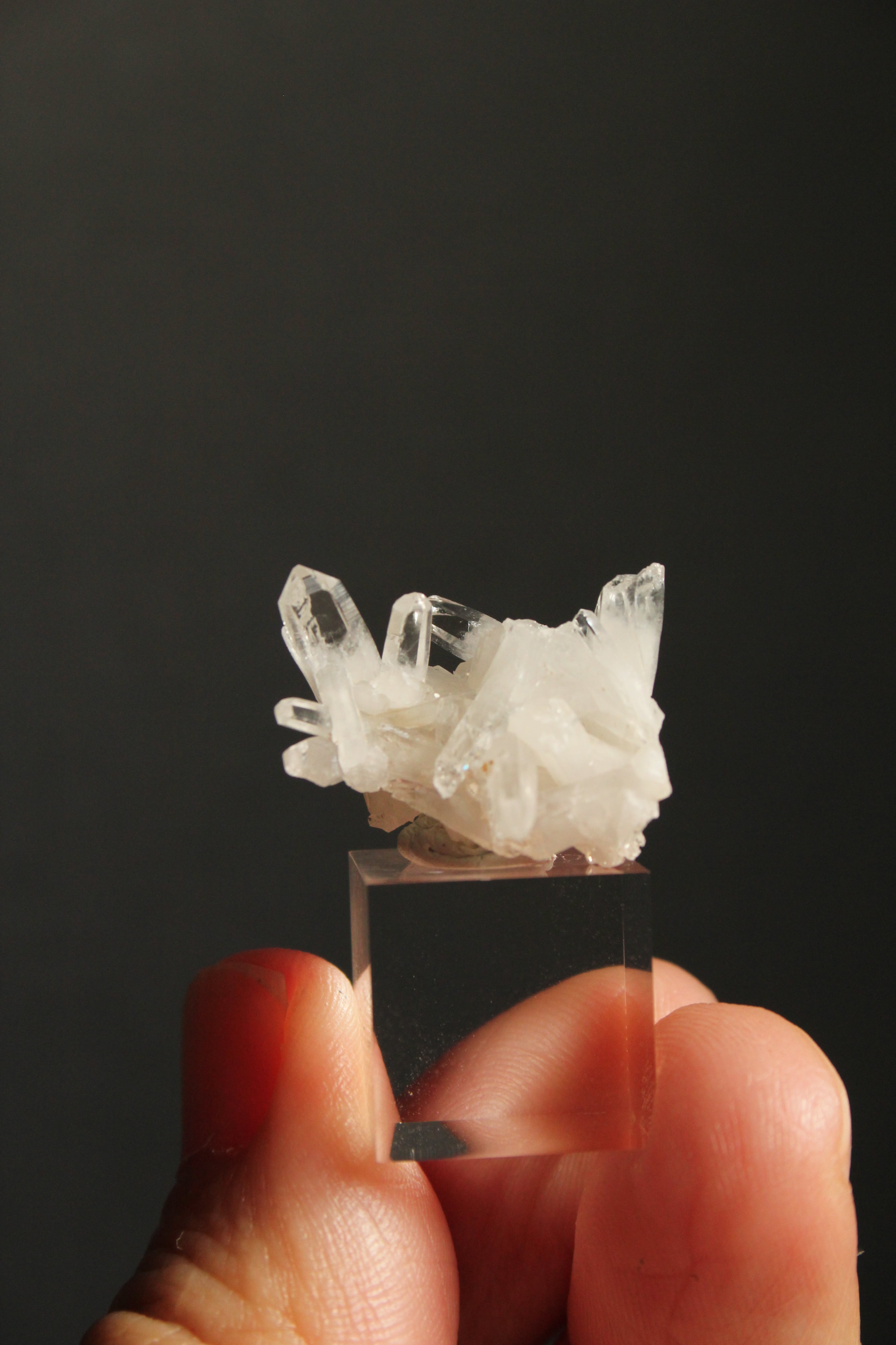 【商品説明】:クラスター水晶の原石とアクリルキューブを使用した置物。様々な方向に自由気ままに伸びている大分産のミニ水晶クラスターです。各ポイントの先はとても透明度が高いです。ここの水晶は、スパっと輪切りにカットすると、断面が桜の花びらのような模様に見えるらしく、そのことから「桜水晶」と言われています。アクリルキューブの大きさ(約15x15x15mm)