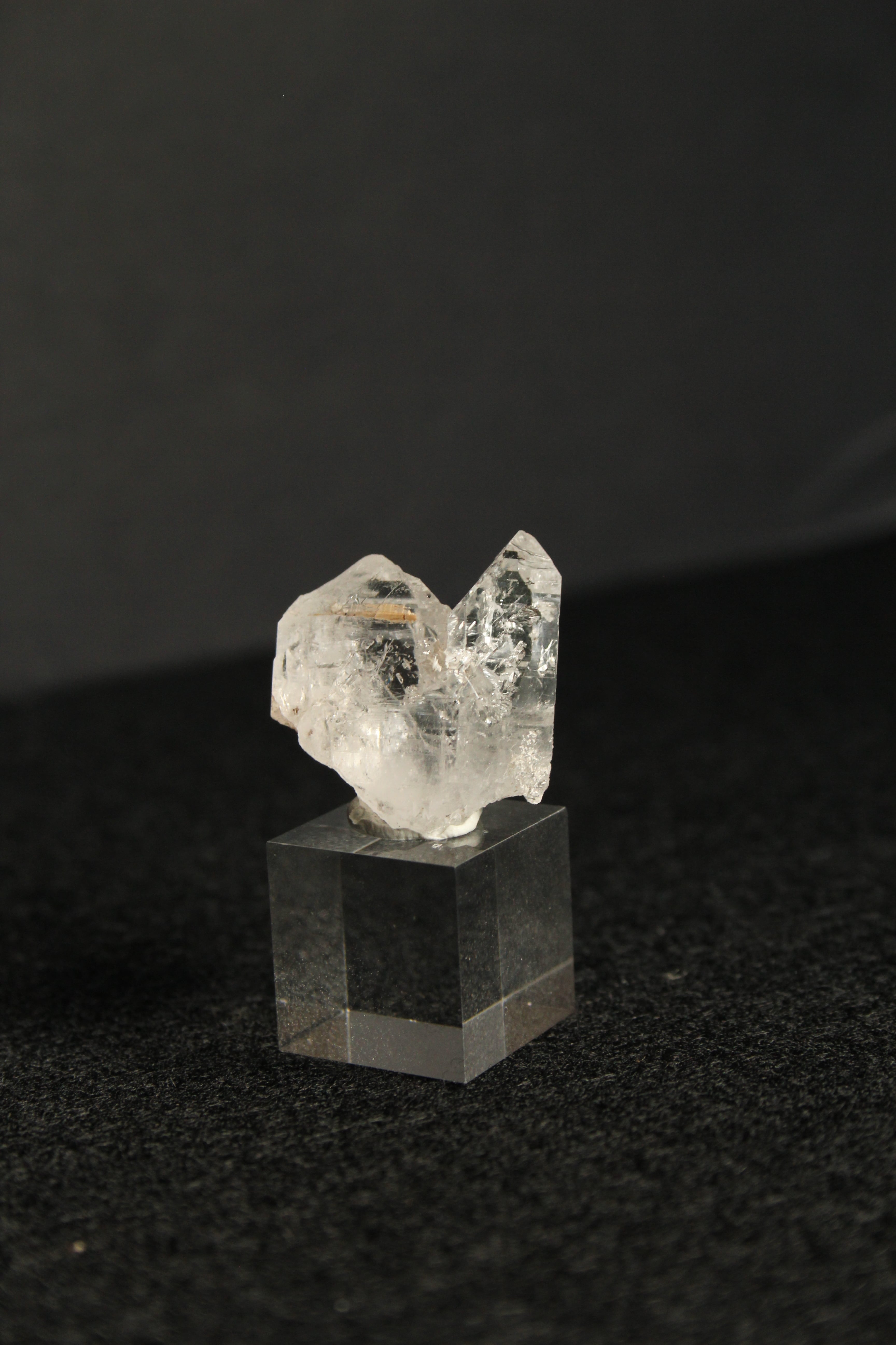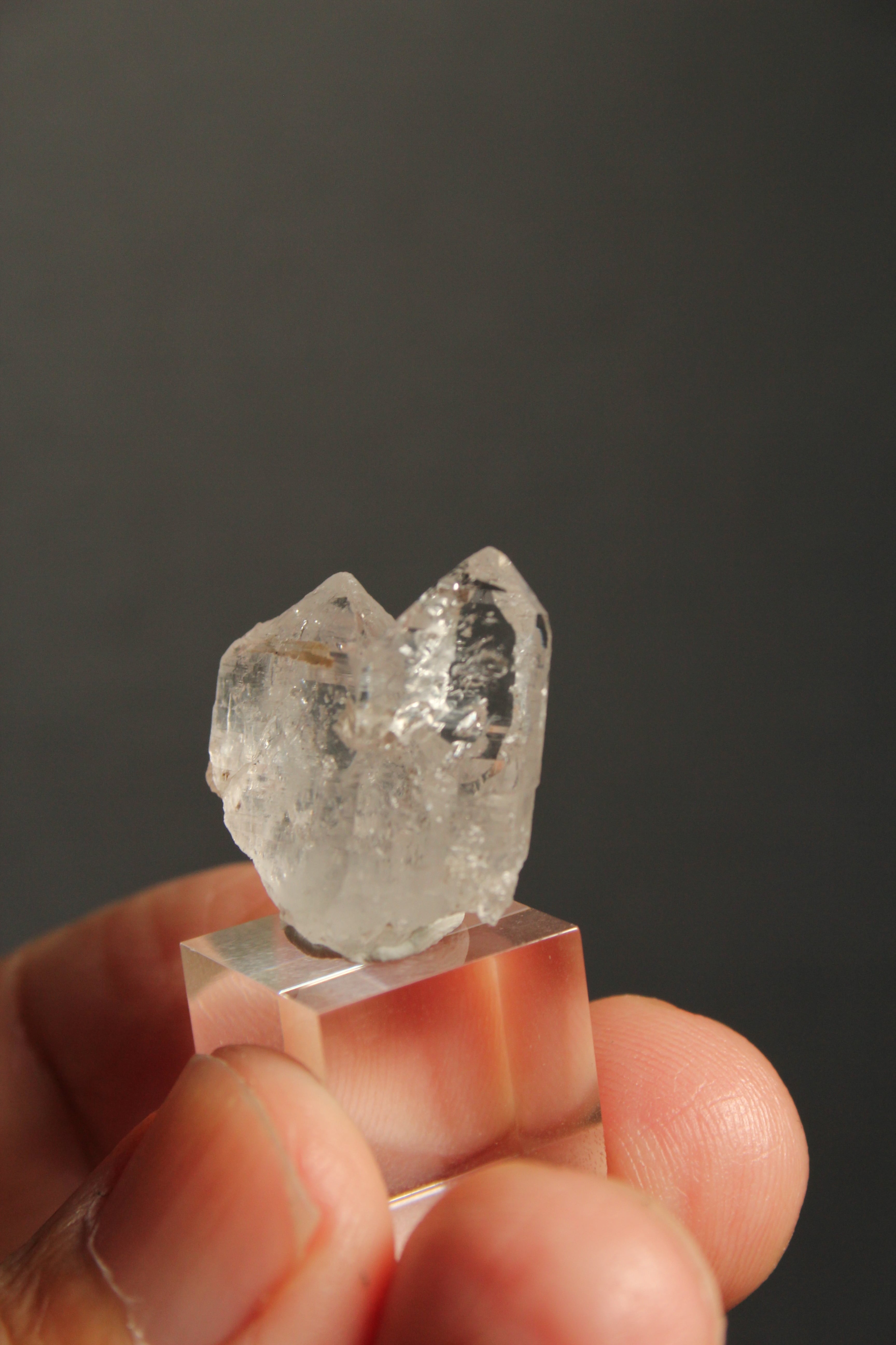 【商品説明】:長崎産水晶の原石とアクリルキューブを使用した置物。この水晶は中に気泡が入ったエレスチャルです。光りを当てるとキラキラ反射してとてもキレイです。パワーストーンでは「水晶の最終形態」「天使からの贈り物」とも呼ばれています。この産地でエレスチャル取れるところは凄く限定的です。太いのと細い水晶が並んだ感じのかわいい水晶です。アクリルキューブの大きさ(約15x15x15mm)