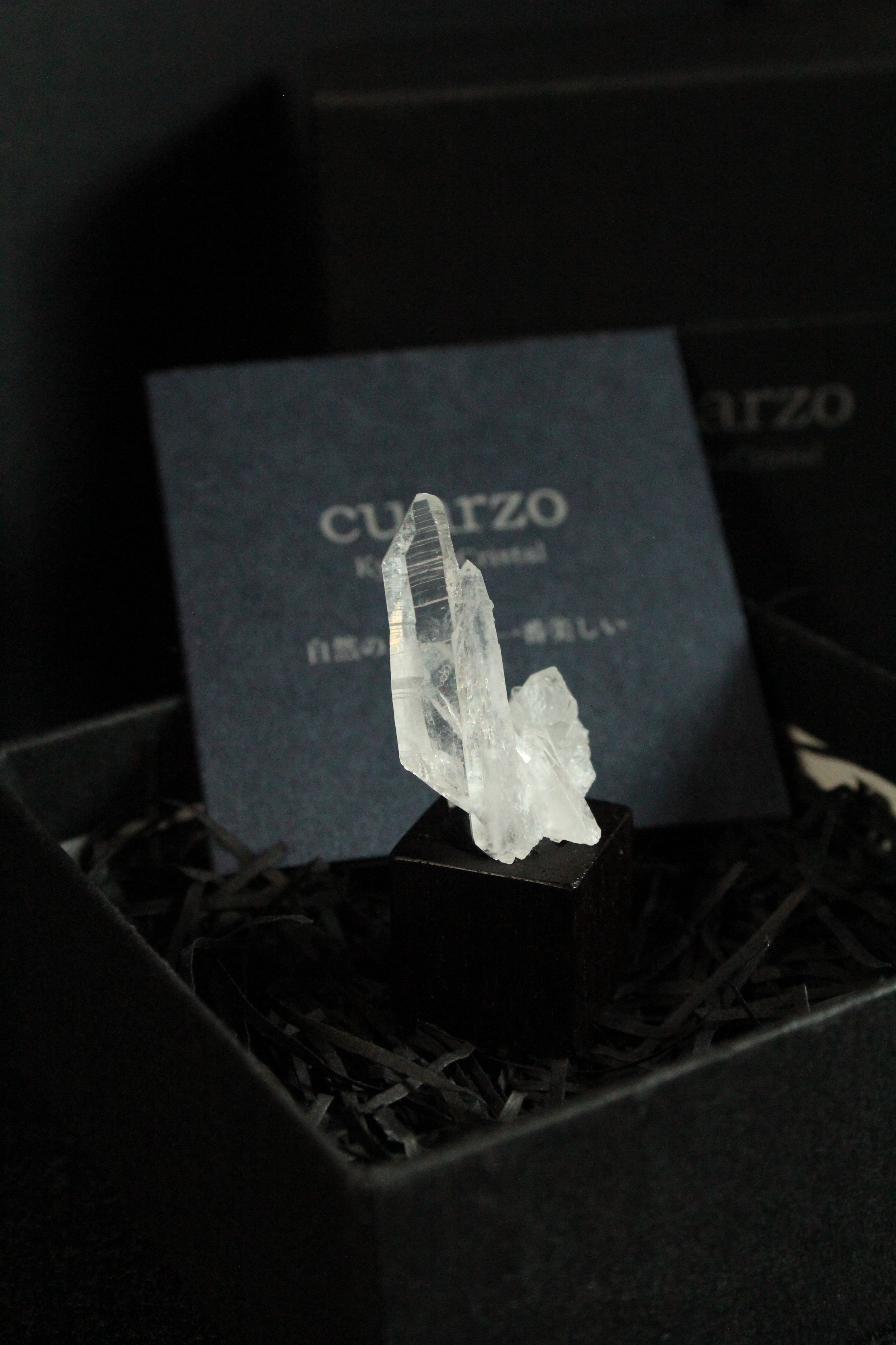【商品説明】:水晶の原石と高級木材のローズウッドを使用した置物。コロンビアレムリアンを彷彿させるような透明度が高い宮崎産水晶。ローズウッドキューブの大きさ(約15x15x15mm)