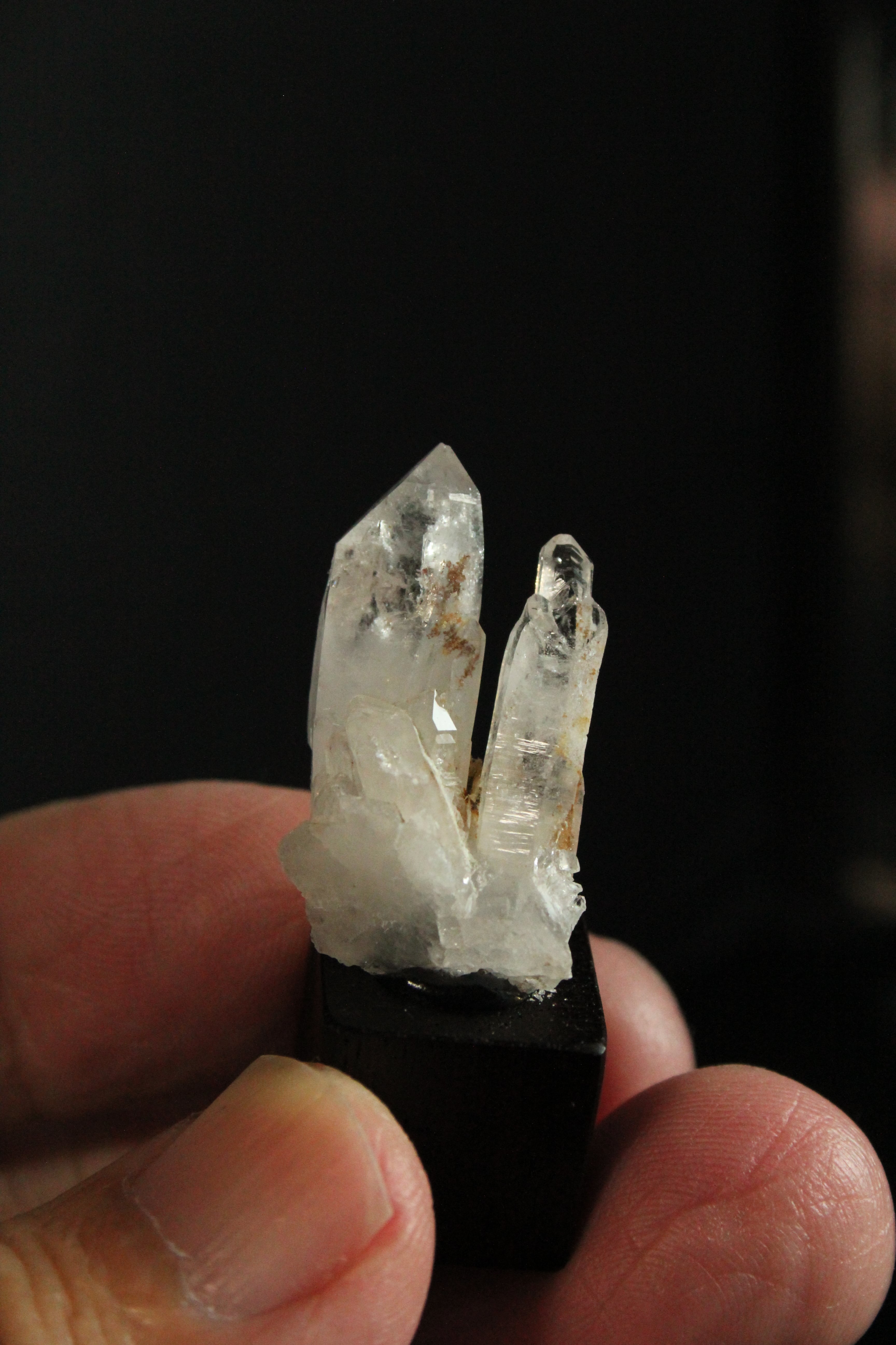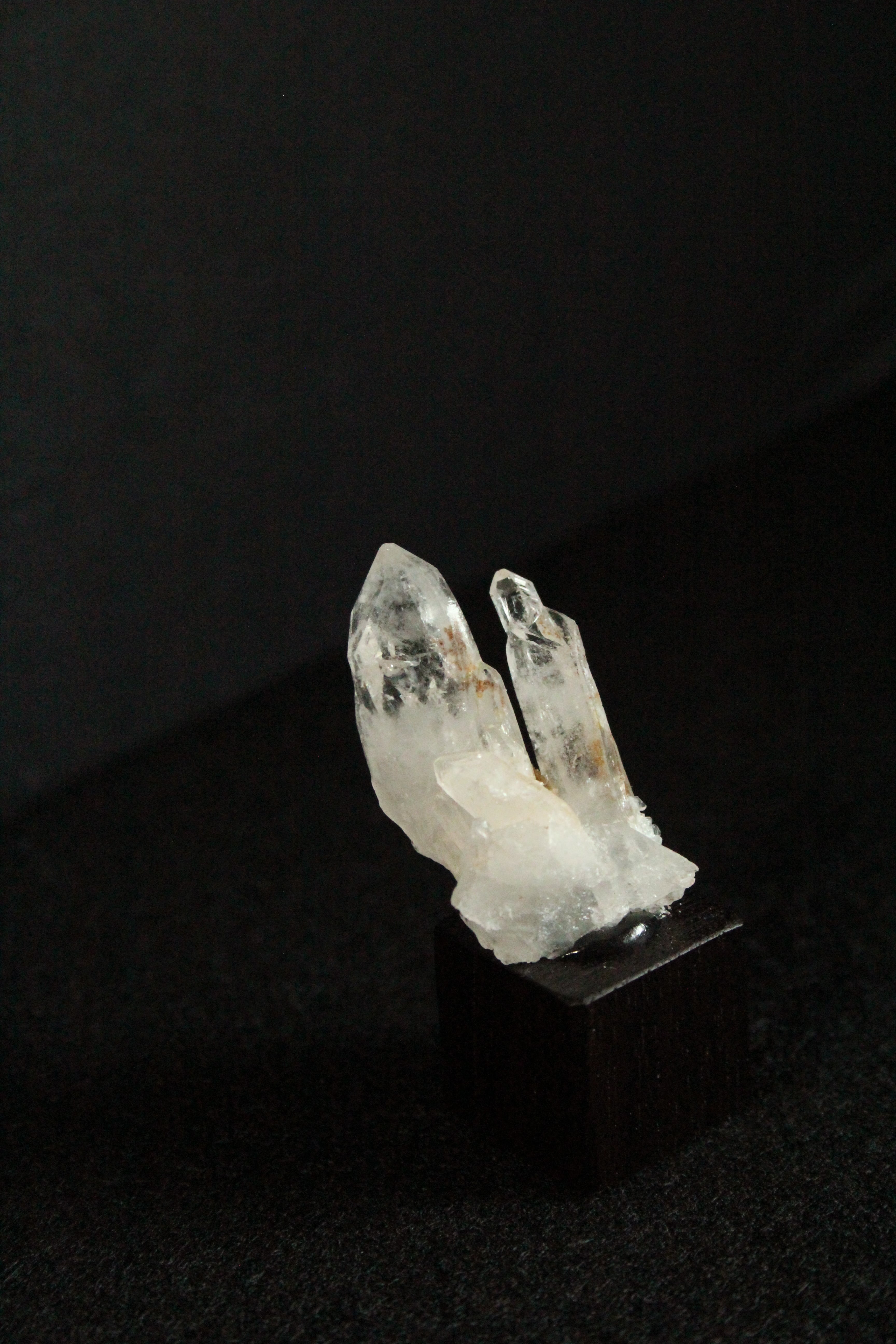 【商品説明】:水晶の原石と高級木材のローズウッドを使用した置物。コロンビアレムリアンを彷彿させるような透明度が高い宮崎産水晶。太さの違う水晶が2つ並んでいるのが特徴的です。ローズウッドキューブの大きさ(約15x15x15mm)