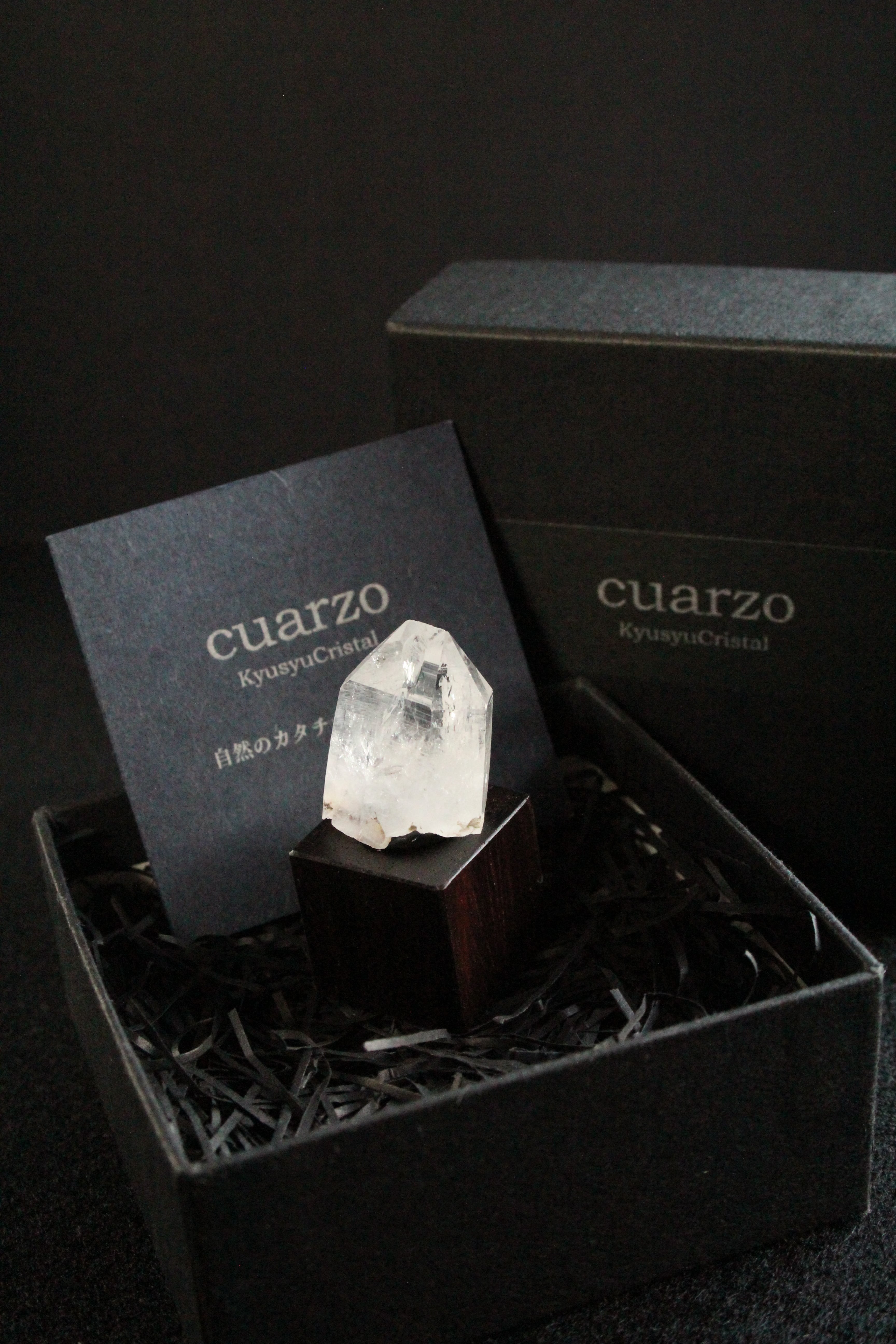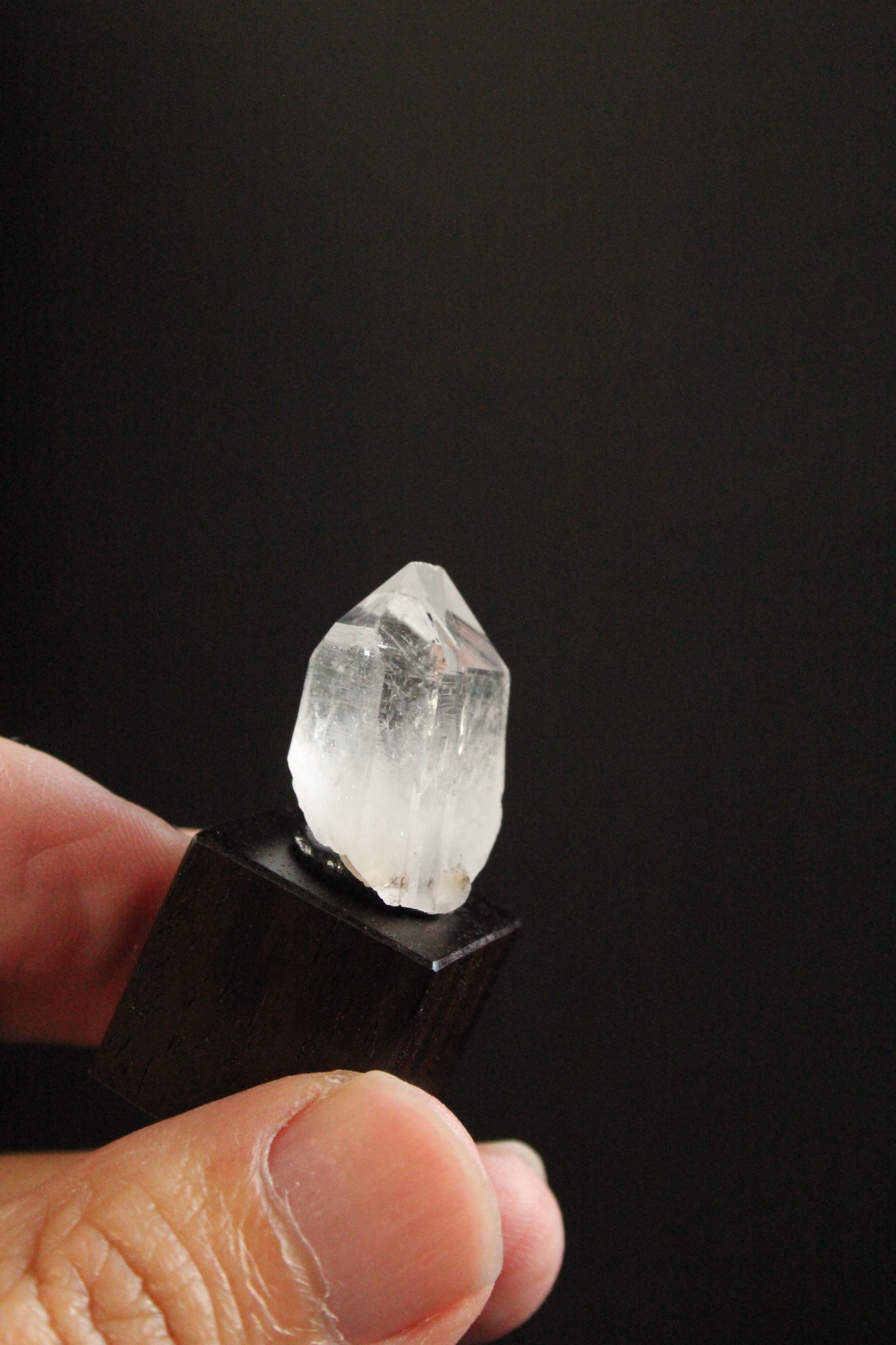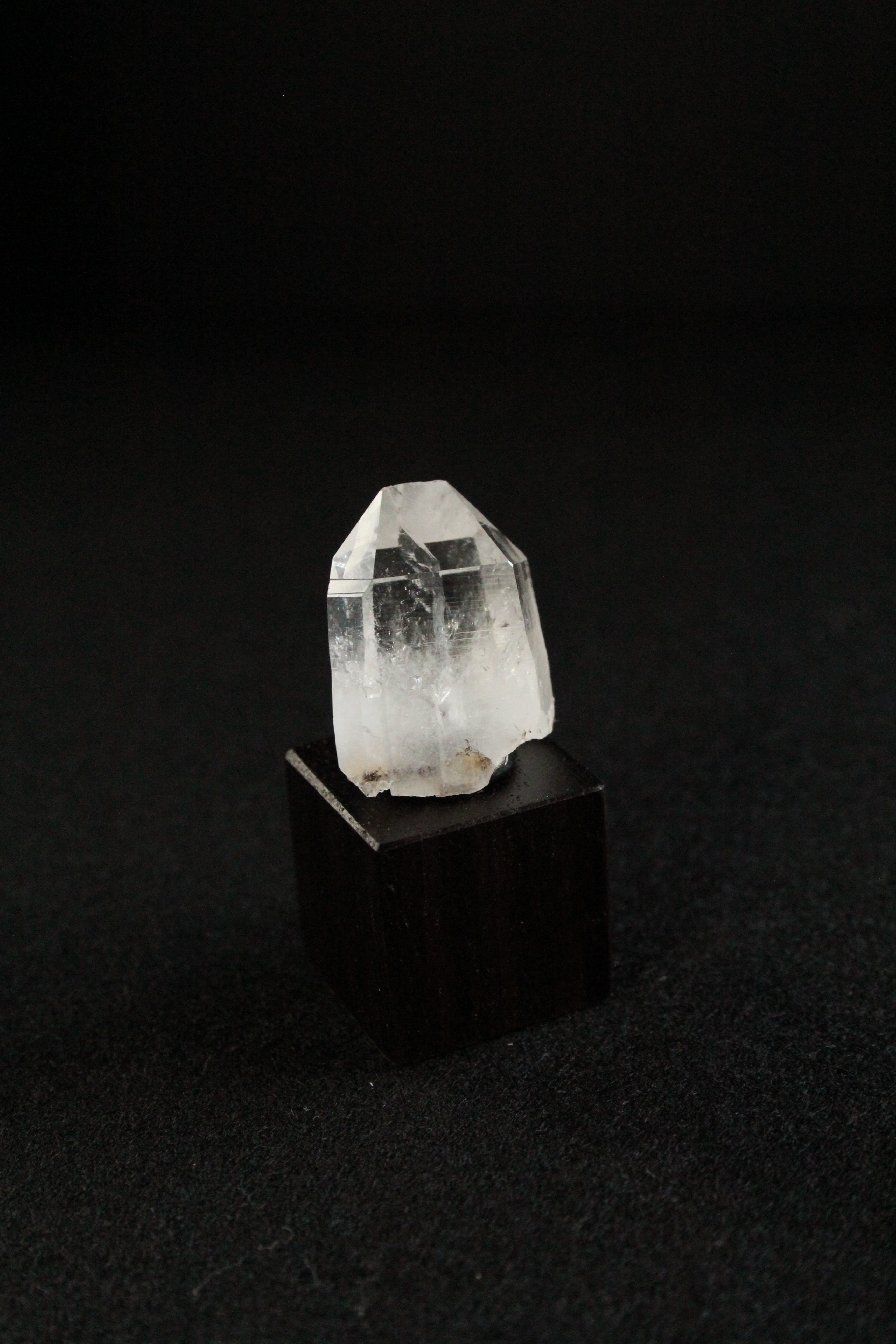 【商品説明】:水晶の原石と高級木材のローズウッドを使用した置物。この水晶は、ここの産地の中でも特に透明度が高く良い形をしています。水晶の中心に伸びるクラックがカッコイイです。ローズウッドキューブの大きさ(約20x20x20mm)