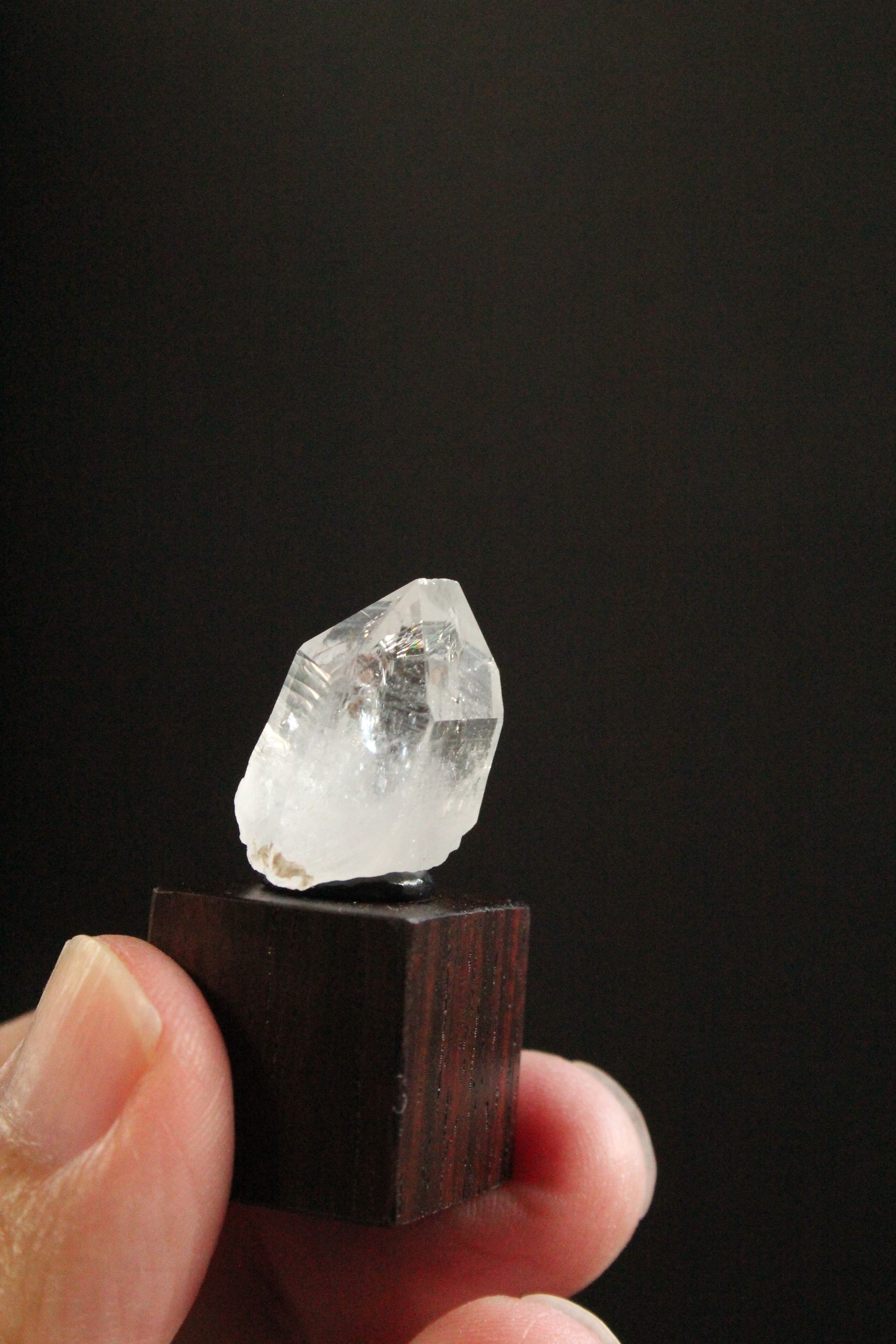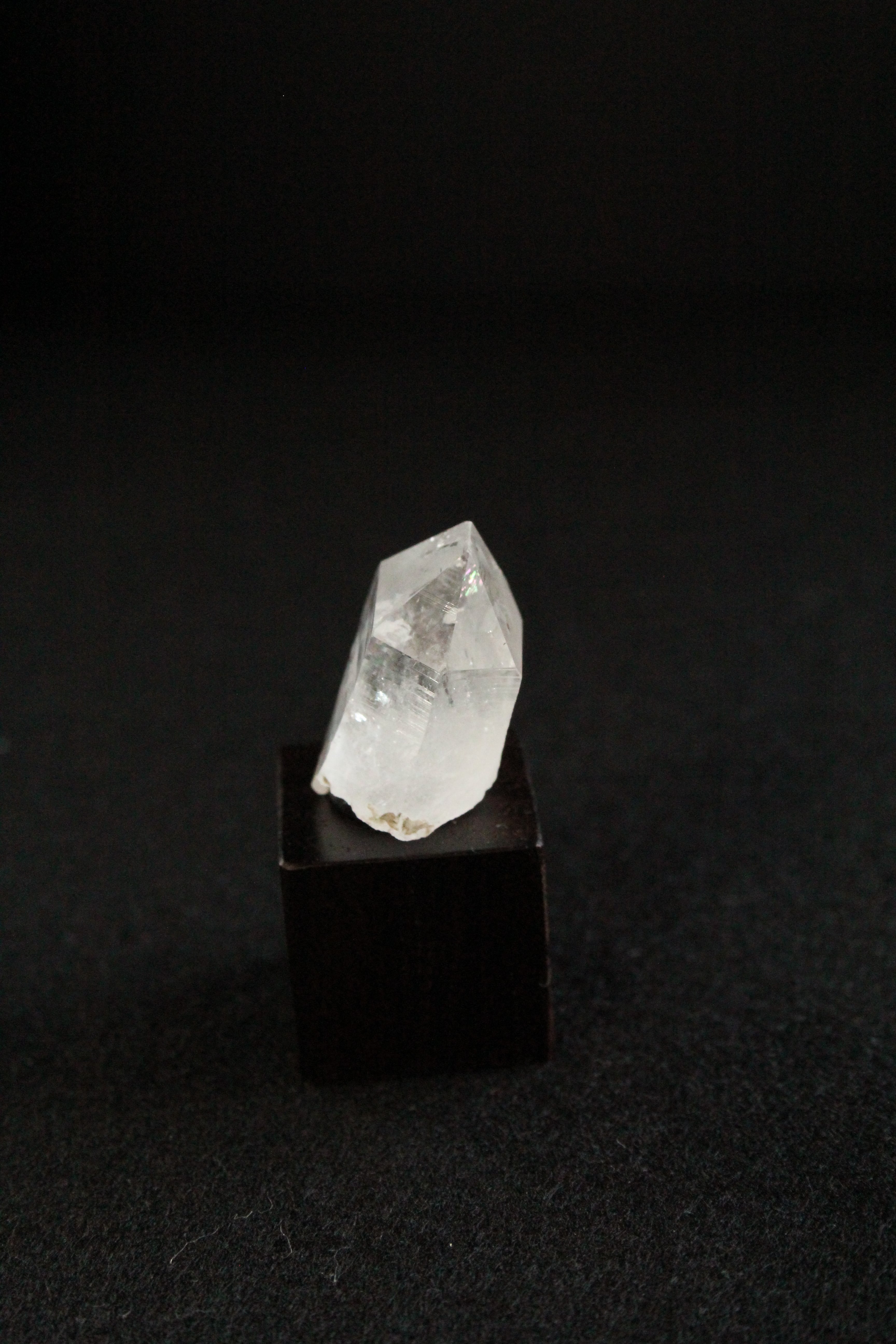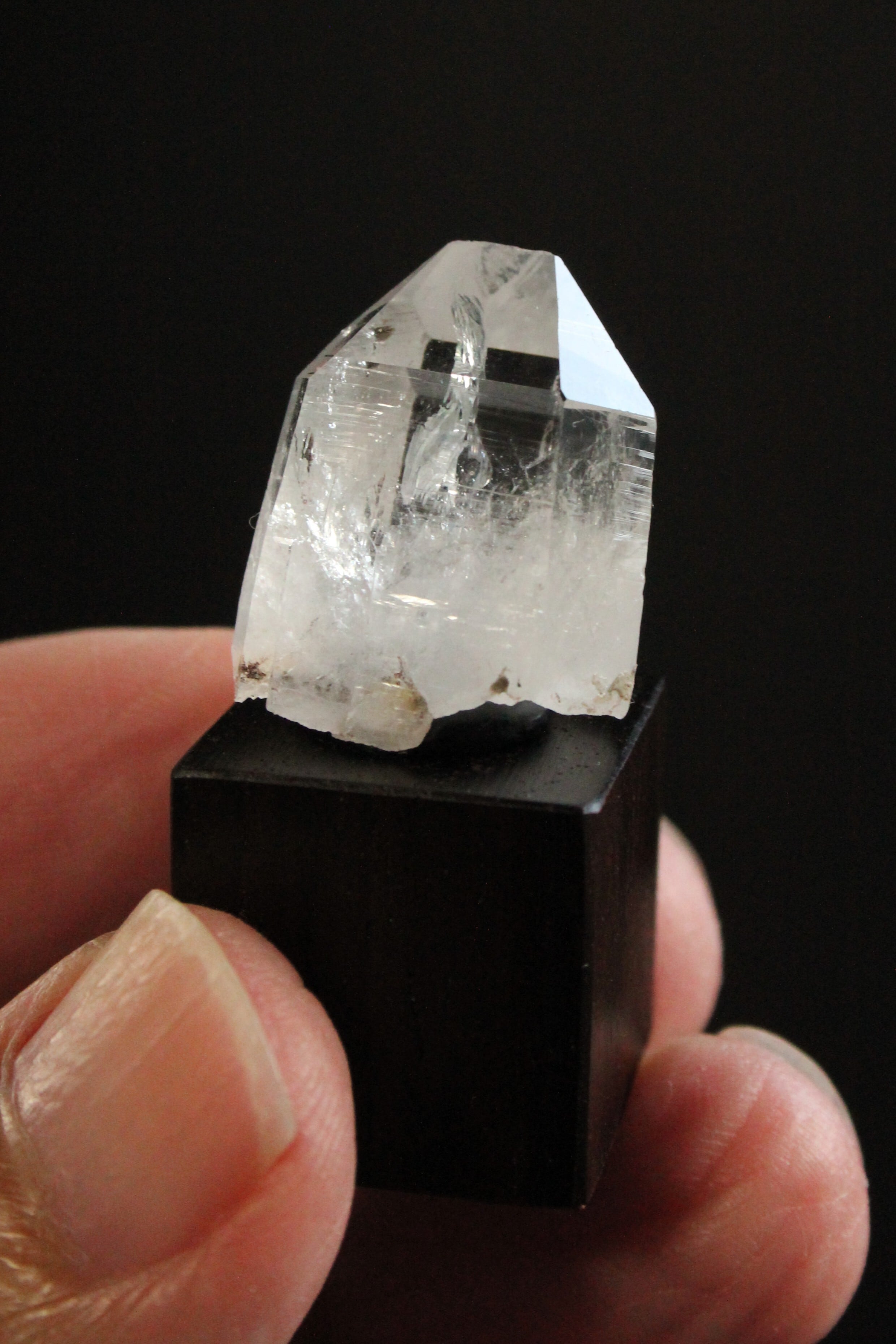 【商品説明】:水晶の原石と高級木材のローズウッドを使用した置物。この水晶は、ここの産地の中でも特に透明度が高く良い形をしています。水晶の中心に伸びるクラックがカッコイイです。ローズウッドキューブの大きさ(約20x20x20mm)