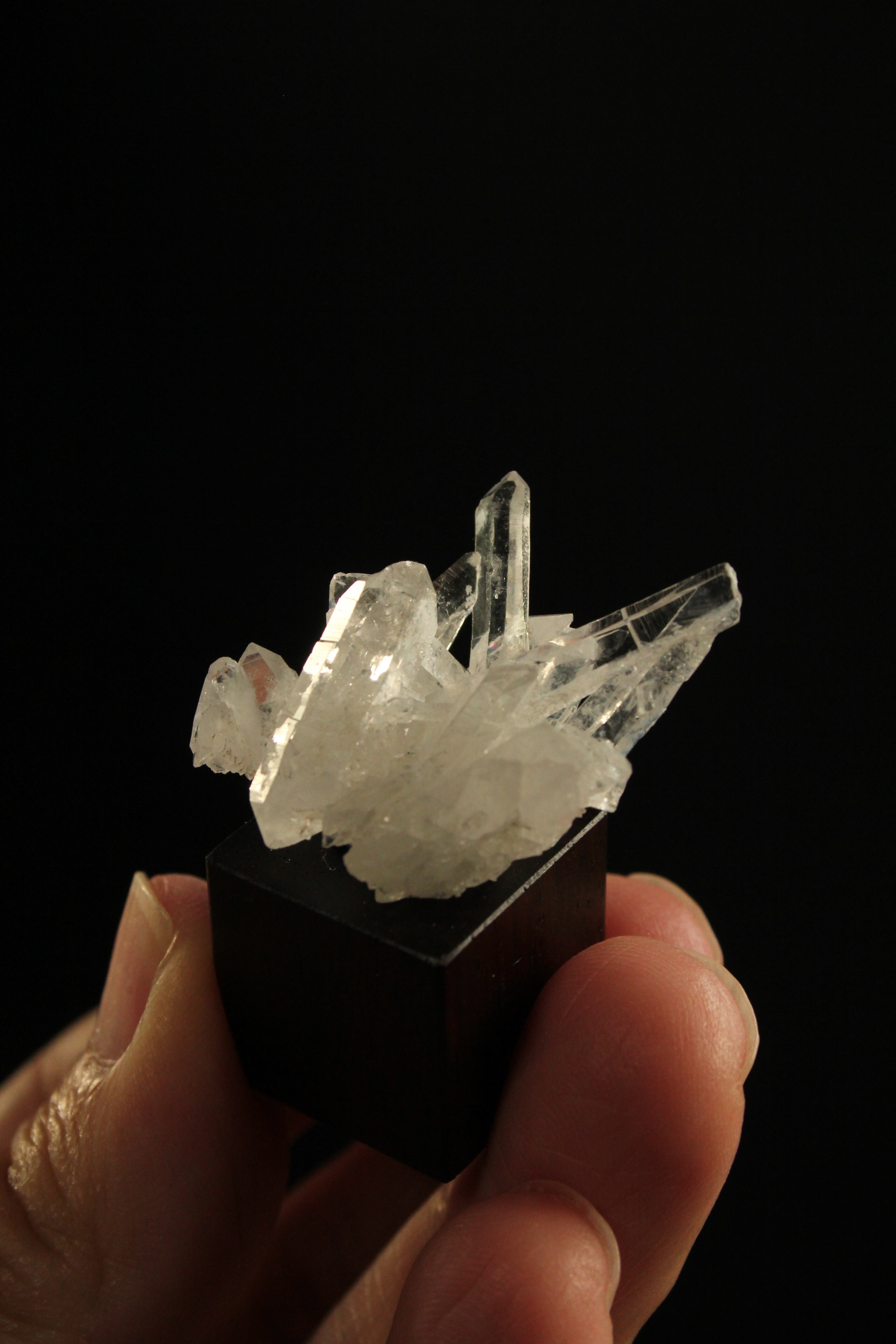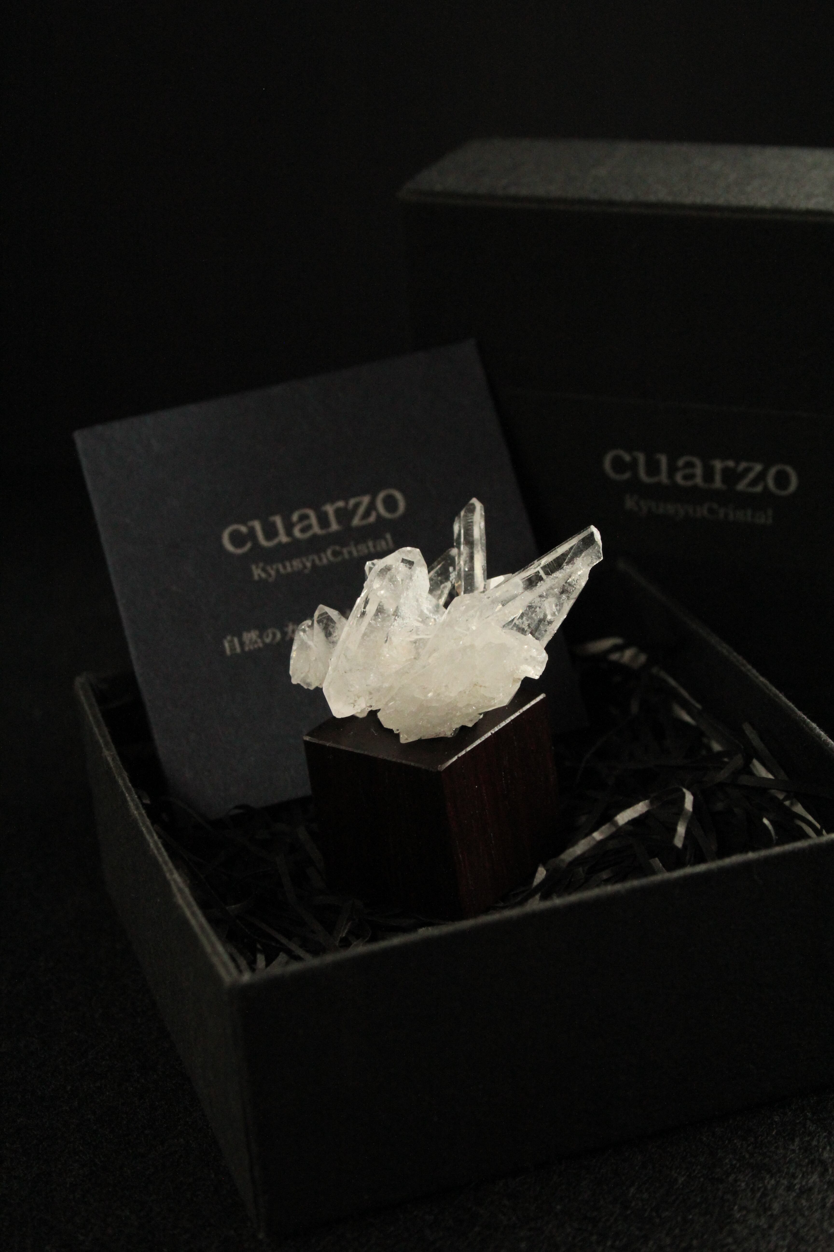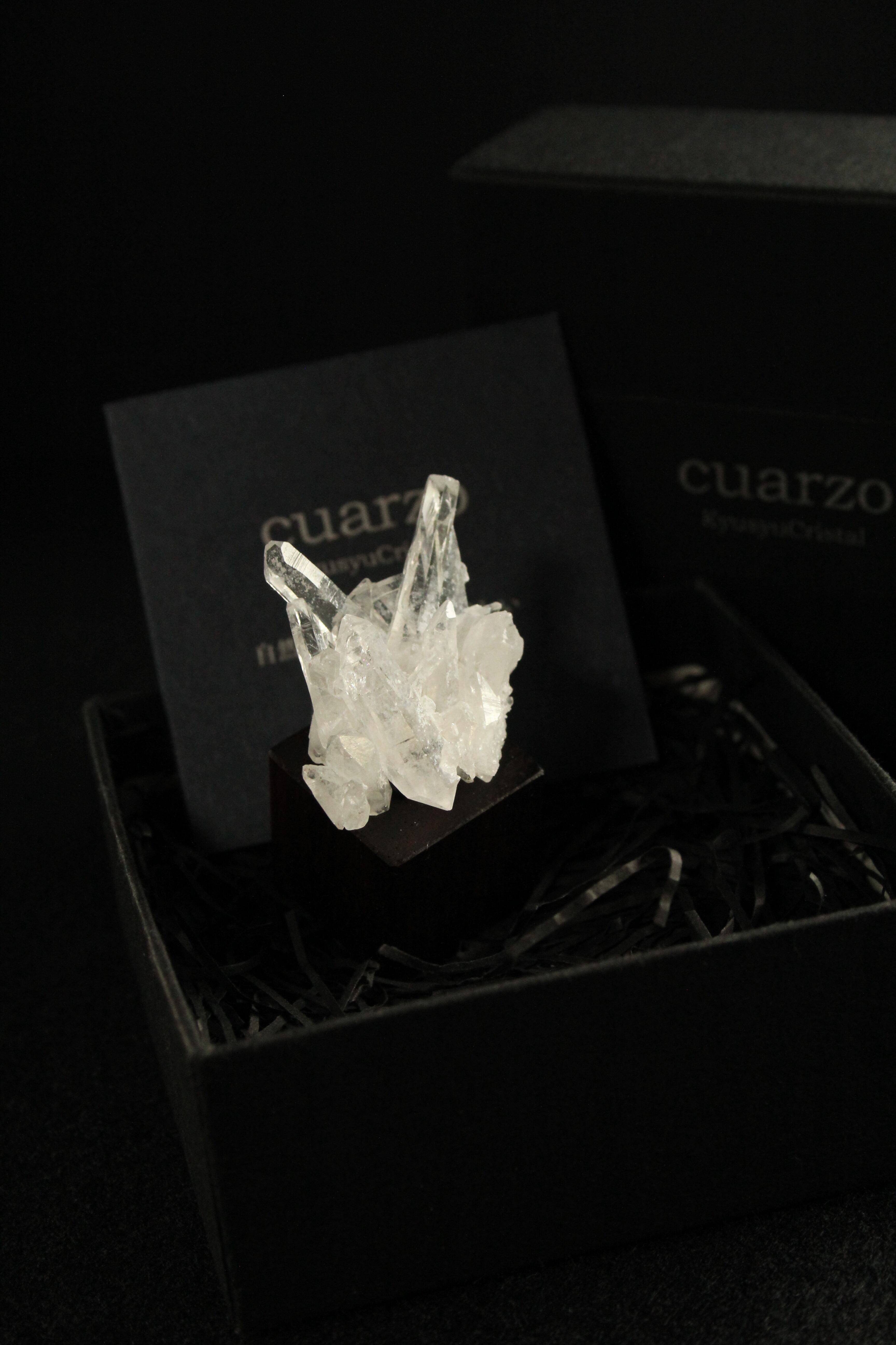 【商品説明】:水晶の原石と高級木材のローズウッドを使用した置物。コロンビアレムリアンを彷彿させるような透明度が高い宮崎県西米良産水晶。かわいいミニクラスターです。手前に両錐の水晶が付いているのが特徴的です。ローズウッドキューブの大きさ(約20x20x20mm)