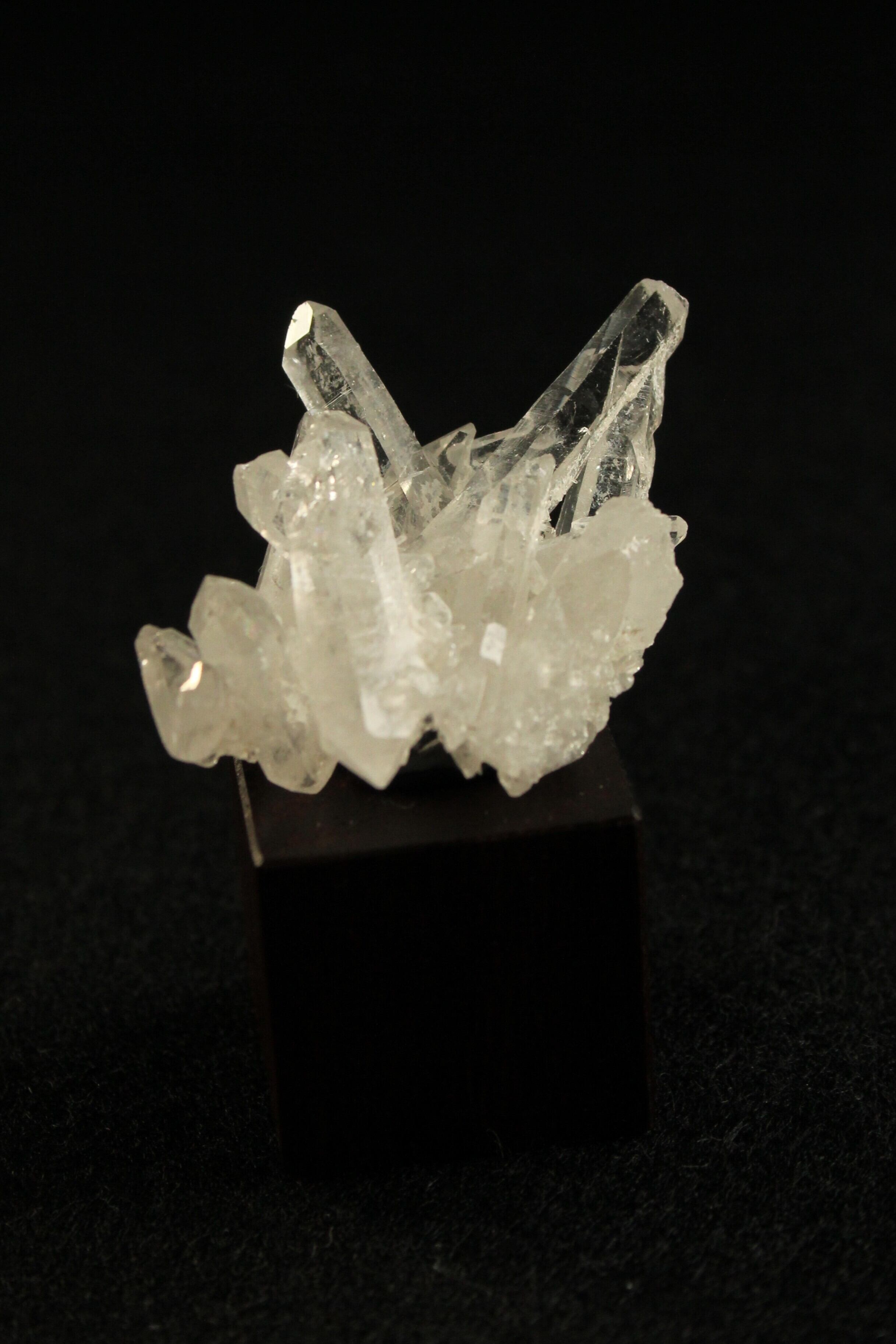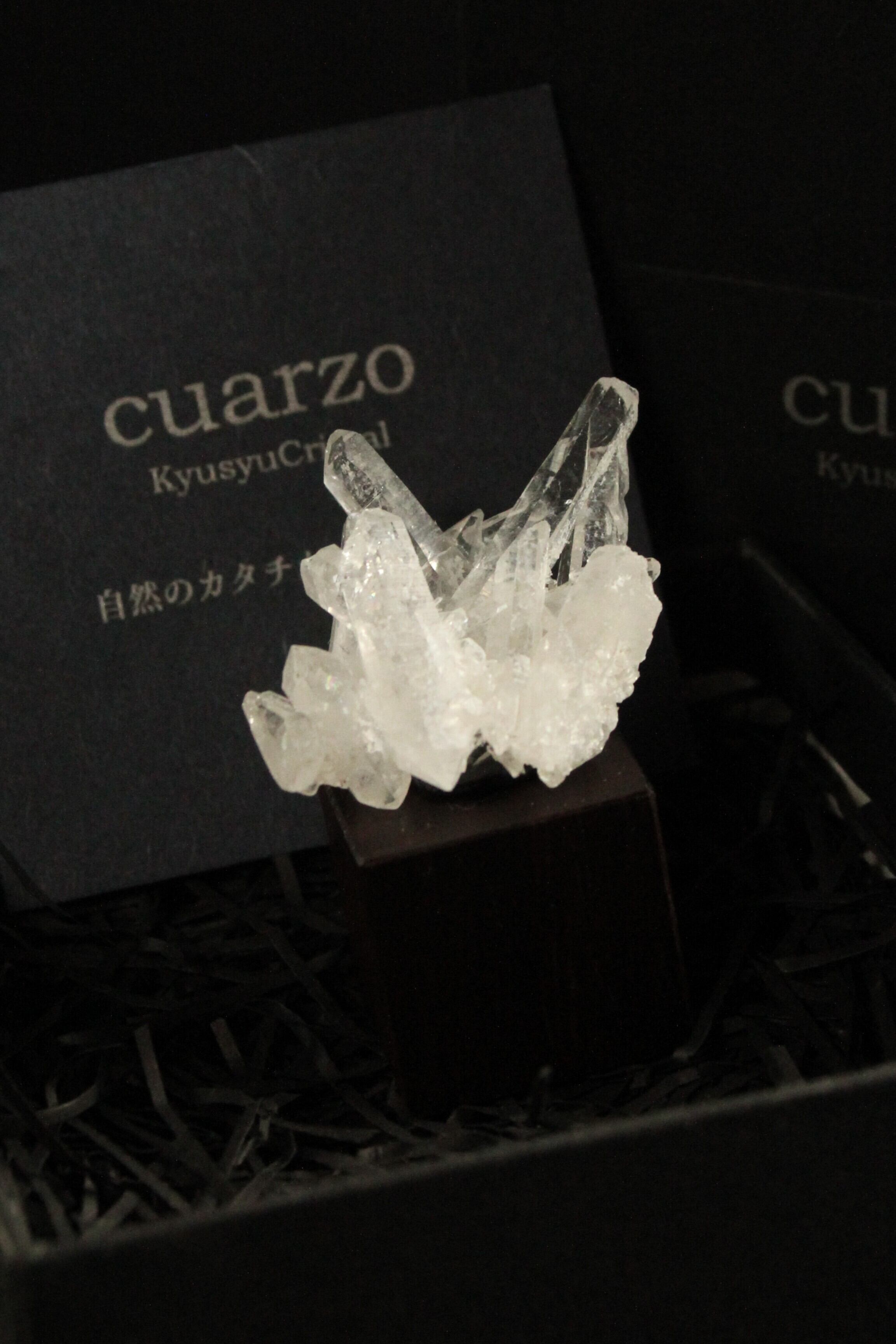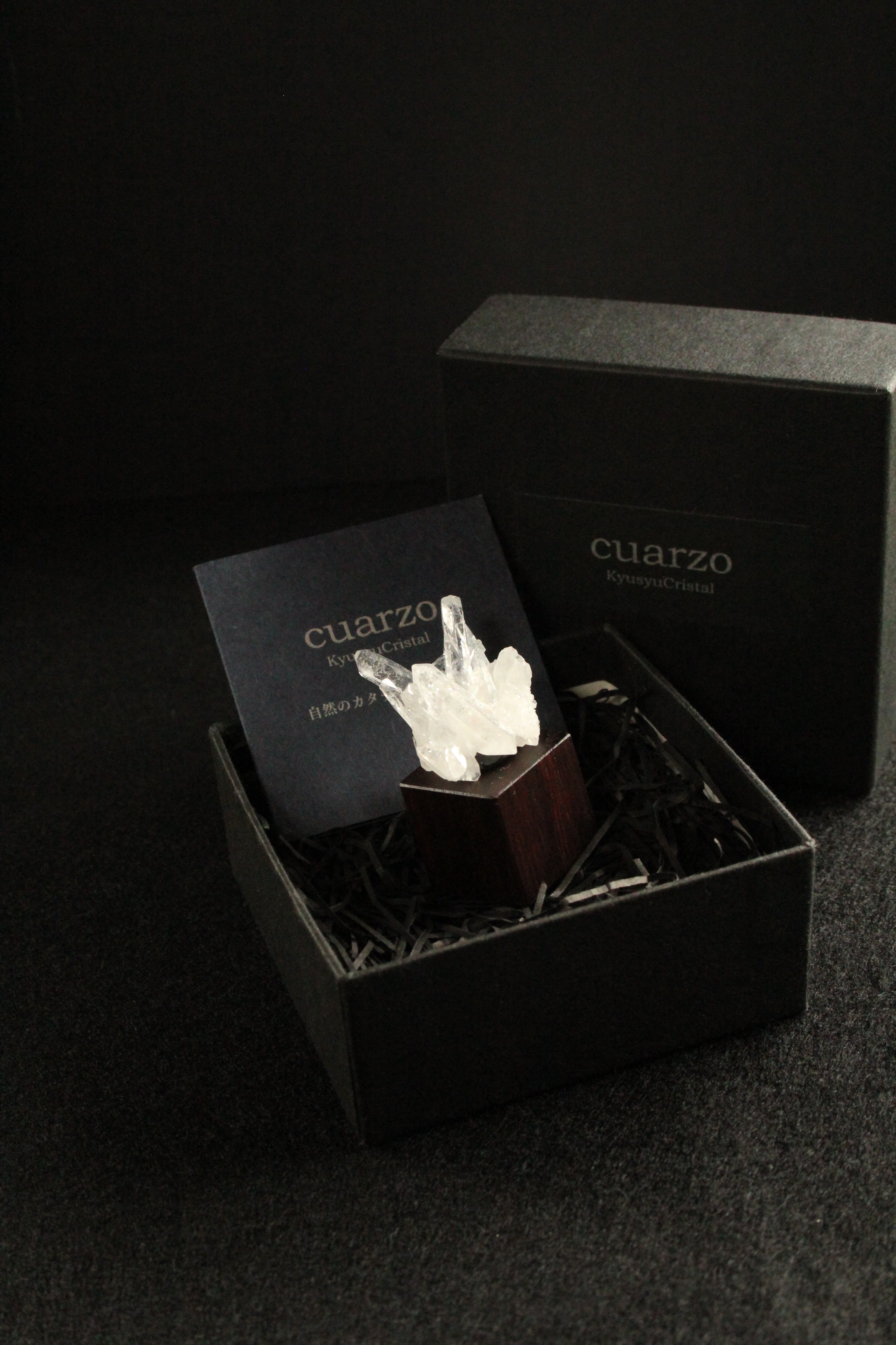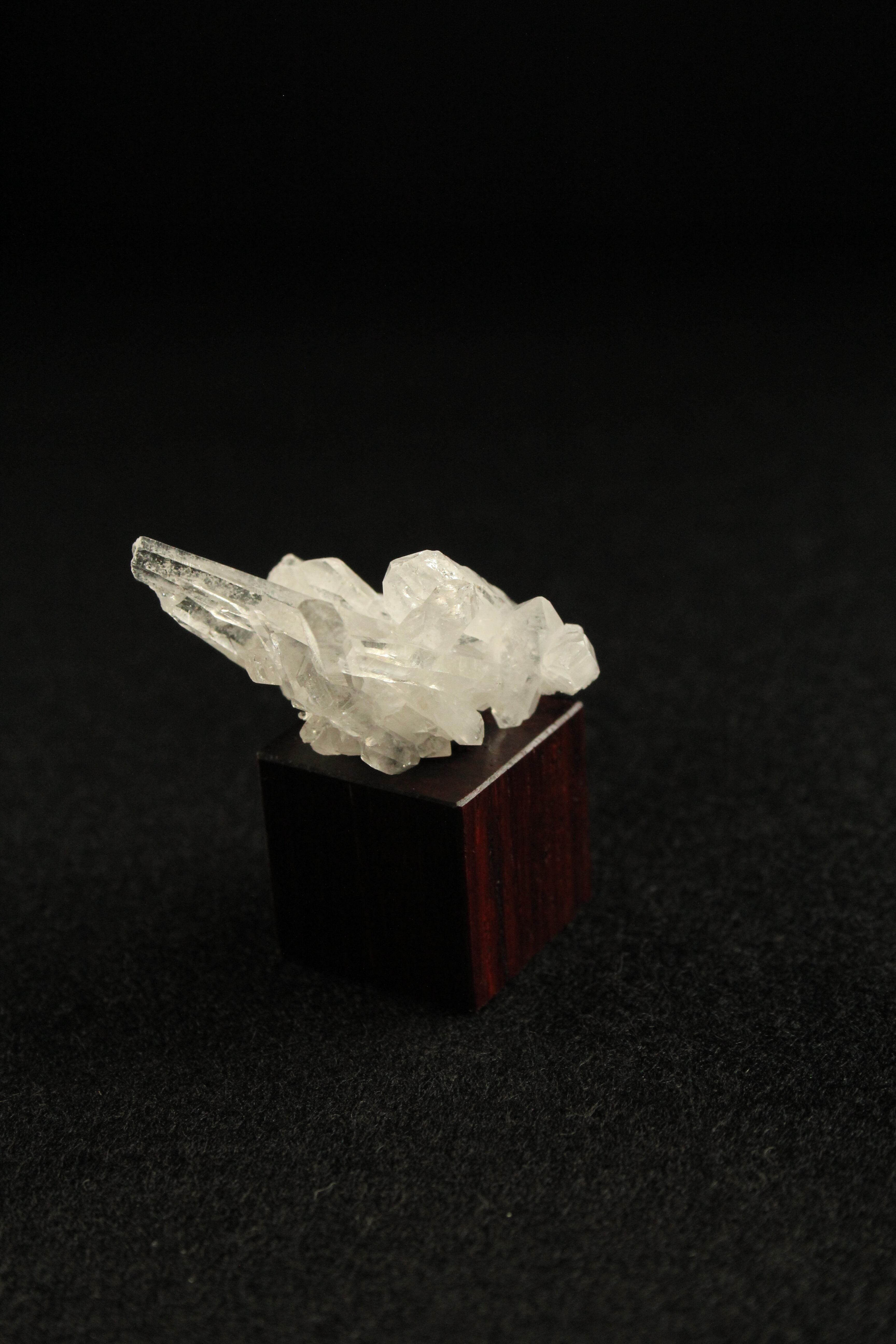 【商品説明】:水晶の原石と高級木材のローズウッドを使用した置物。コロンビアレムリアンを彷彿させるような透明度が高い宮崎県西米良産水晶。かわいいミニクラスターです。手前に両錐の水晶が付いているのが特徴的です。ローズウッドキューブの大きさ(約20x20x20mm)