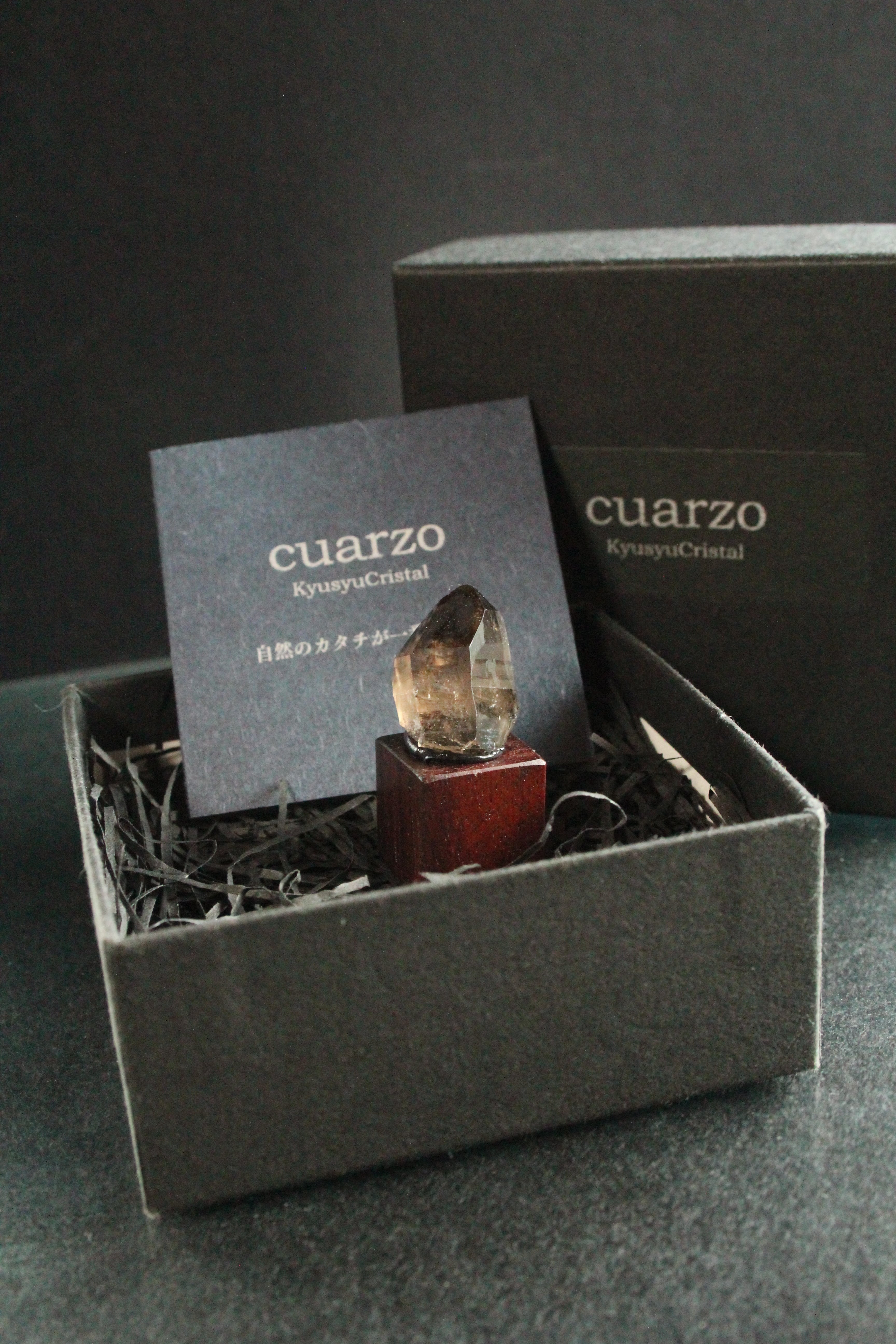 【商品説明】:煙水晶の原石と高級木材のローズウッドを使用した置物。斜め向きの頭、透明感、中のクラック、小さいながらバランスのとれた宮崎産の煙水晶です。ローズウッドキューブの大きさ(約15x15x15mm)