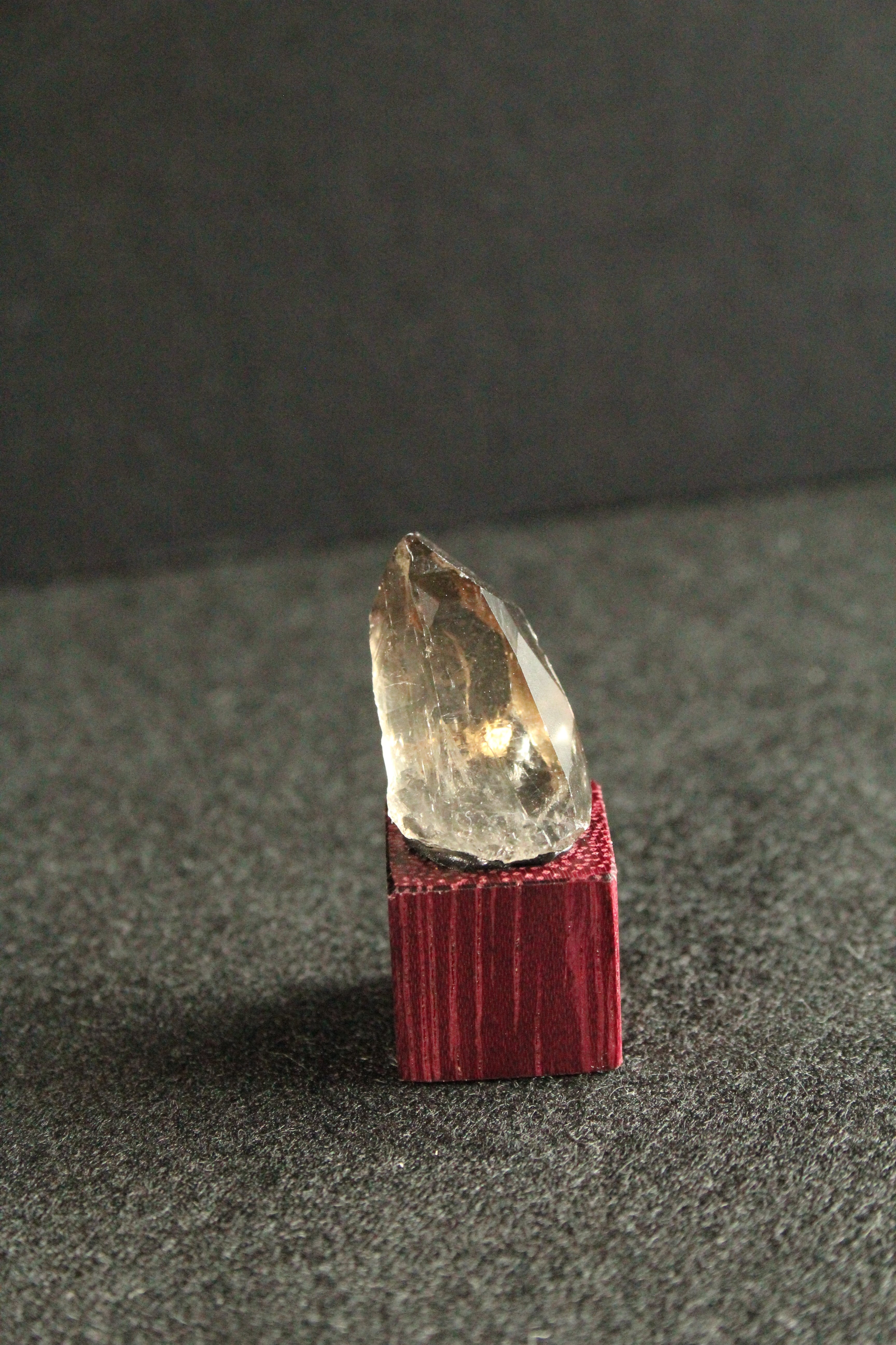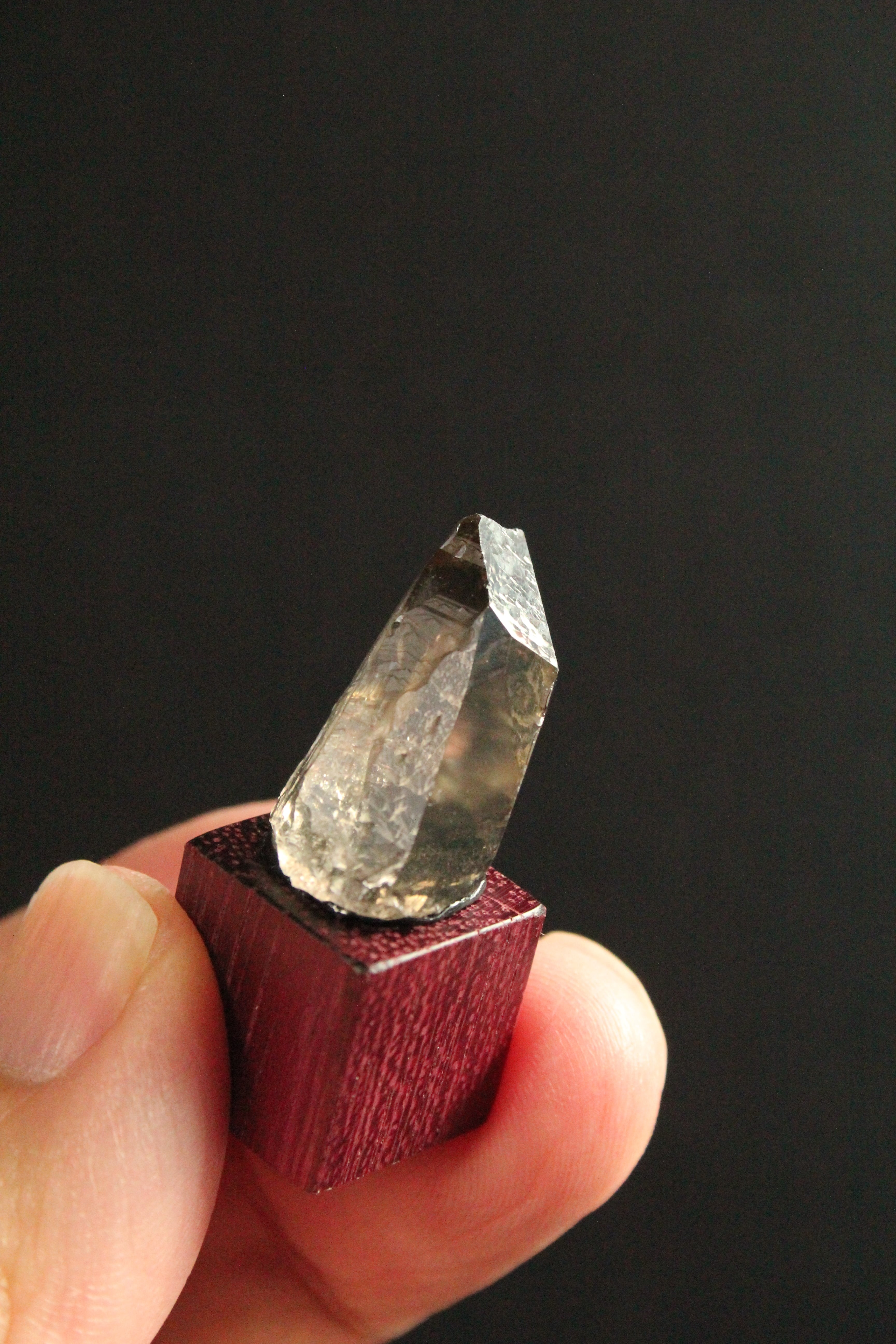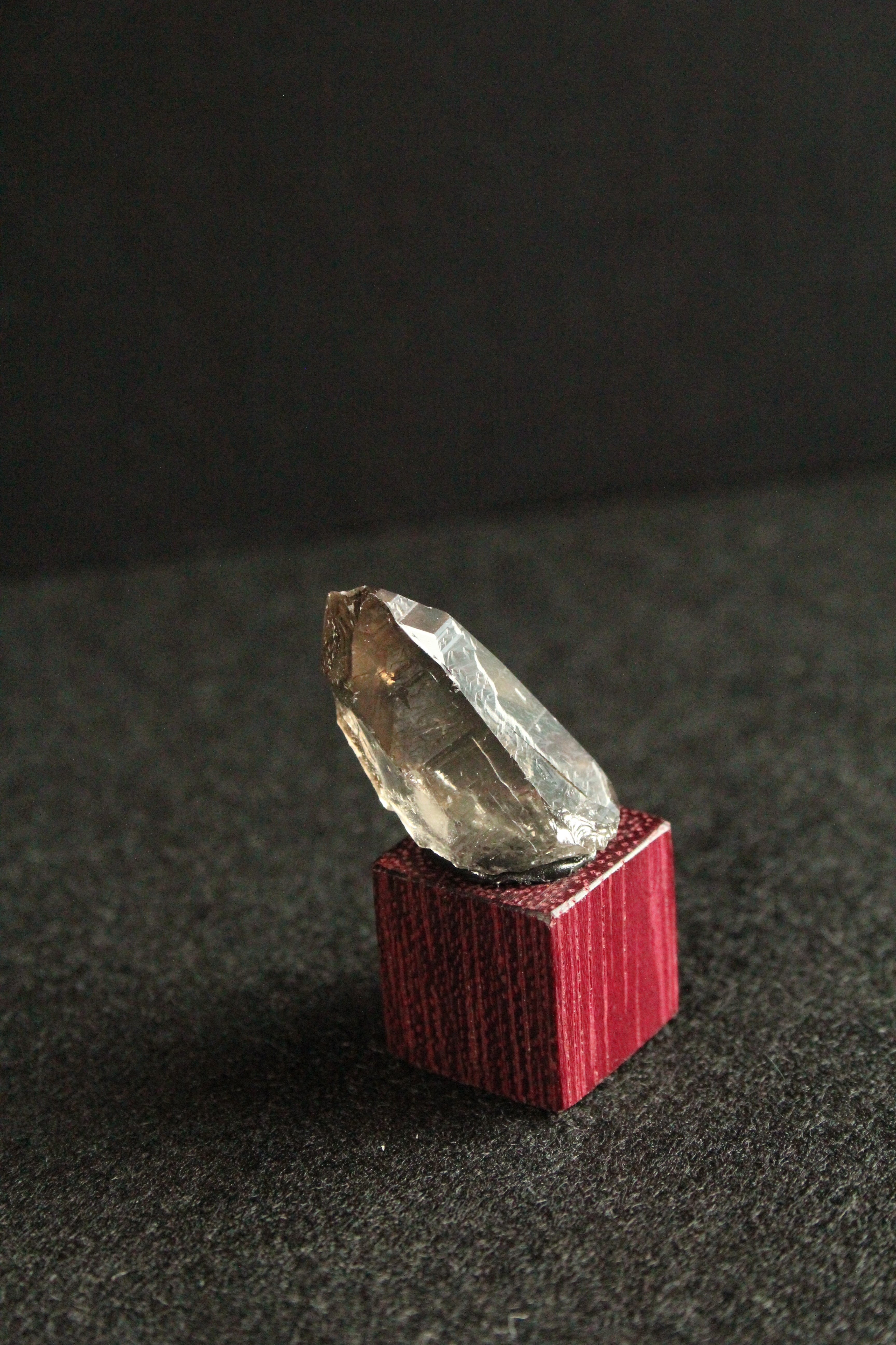 【商品説明】:煙水晶の原石と高級木材のパープルハートキューブを使用した置物。全体的に透明感溢れる煙をまとったような宮崎産の煙水晶です。他の鉱物の干渉によって出来た根元の白みがワイルド感を出しています。パープルハートキューブの大きさ(約15x15x15mm)
