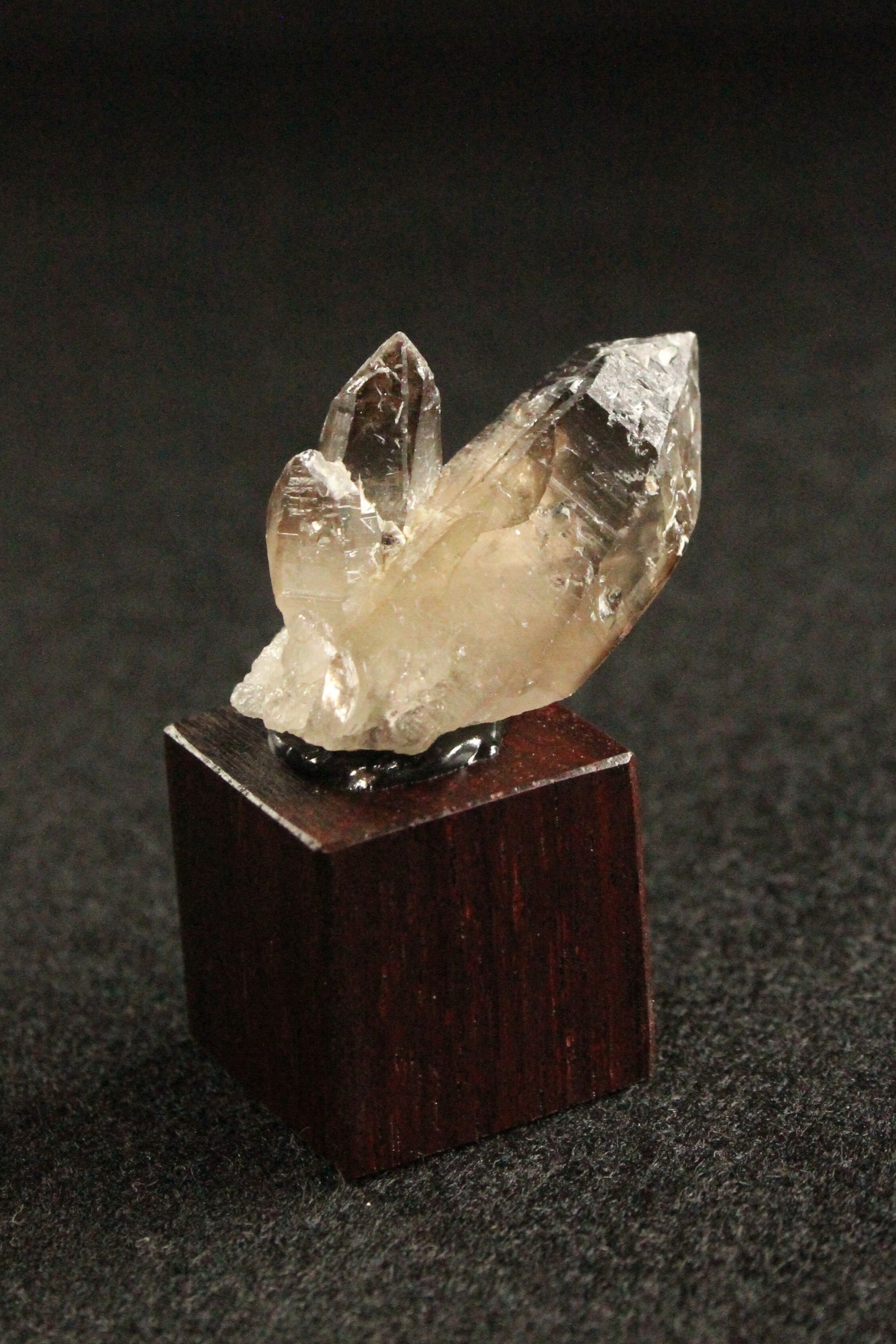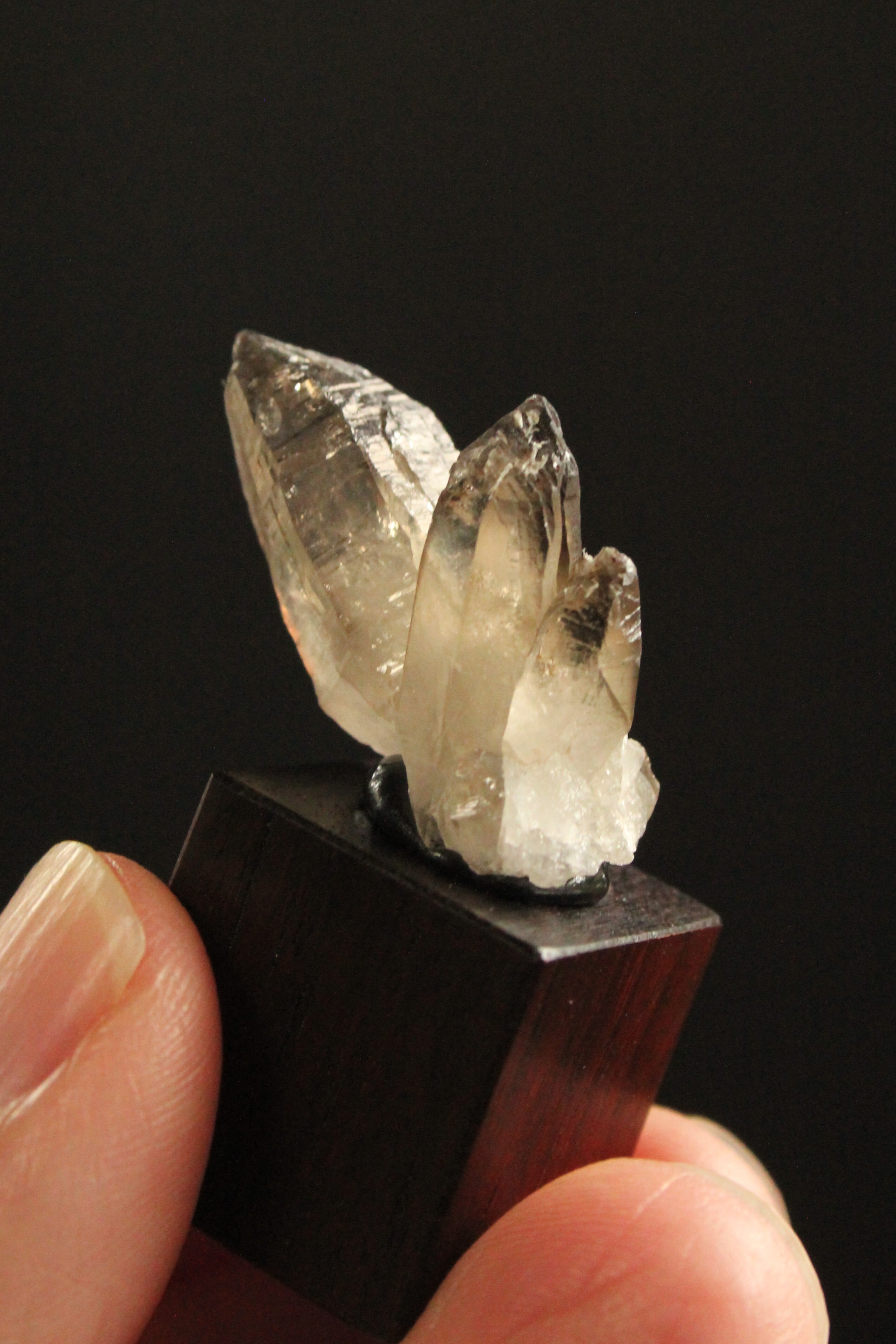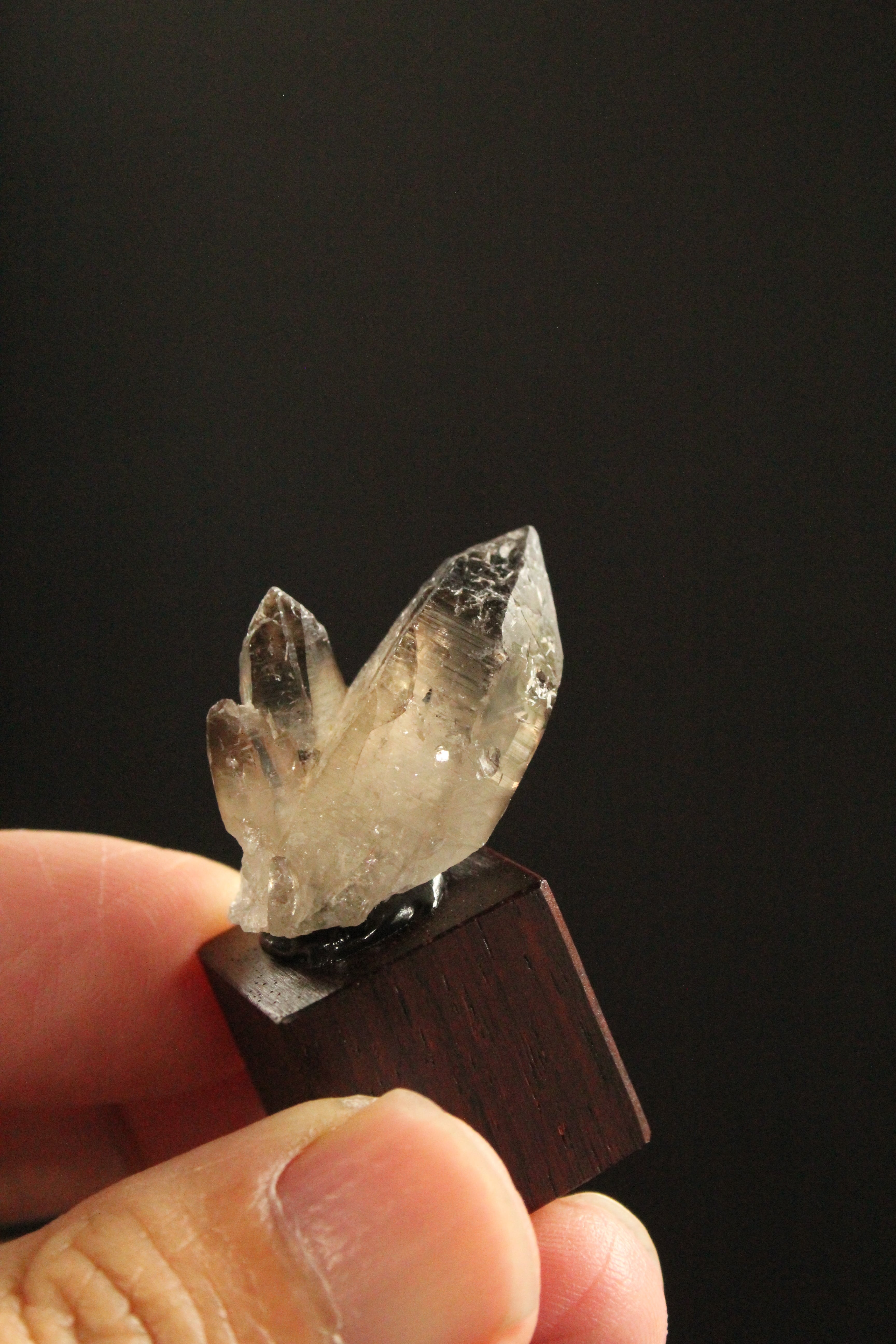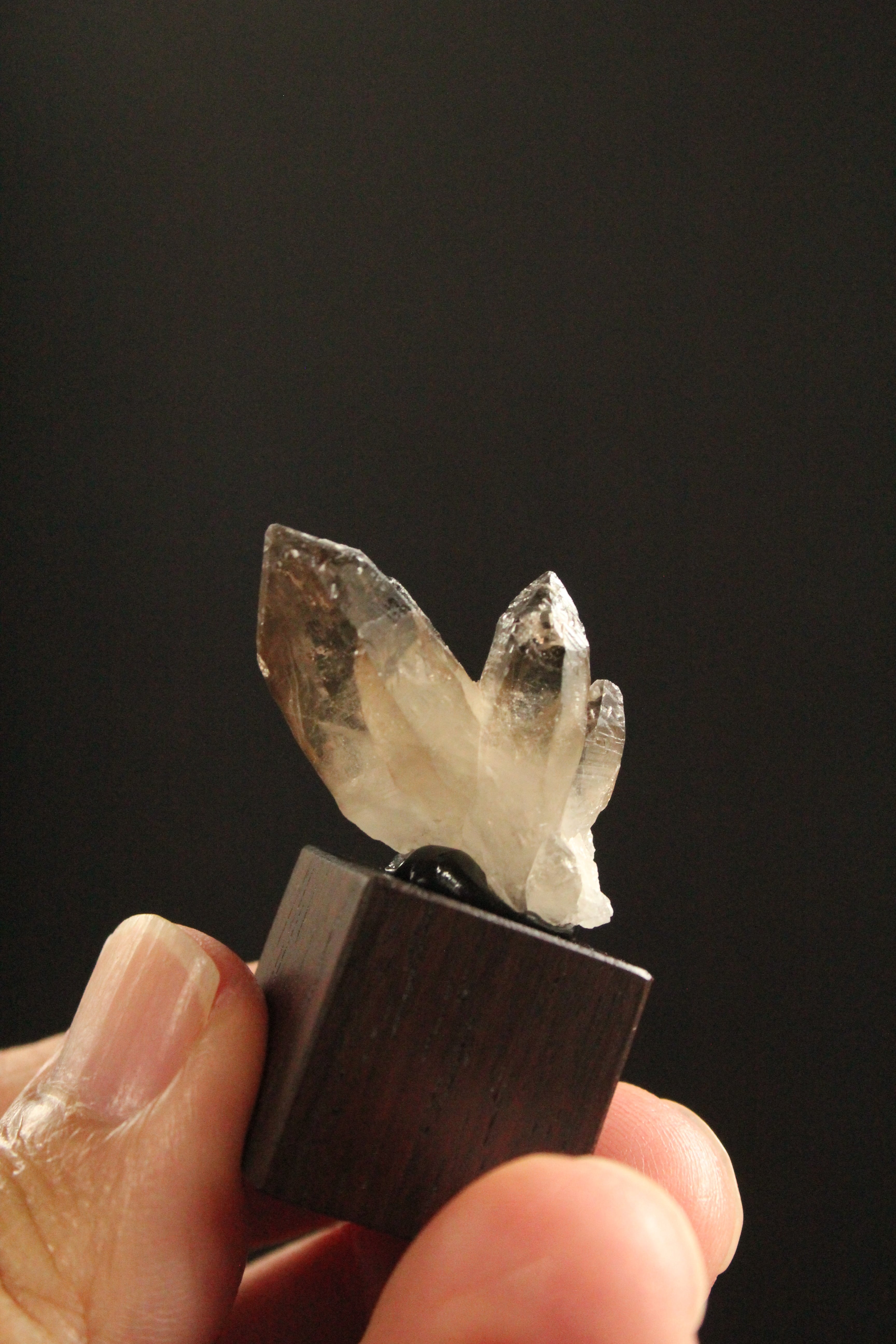 【商品説明】:煙水晶の原石と高級木材のローズウッドを使用した置物。3つの煙水晶がバランスよく並んでいます。ローズウッドキューブの大きさ(約20x20x20mm)