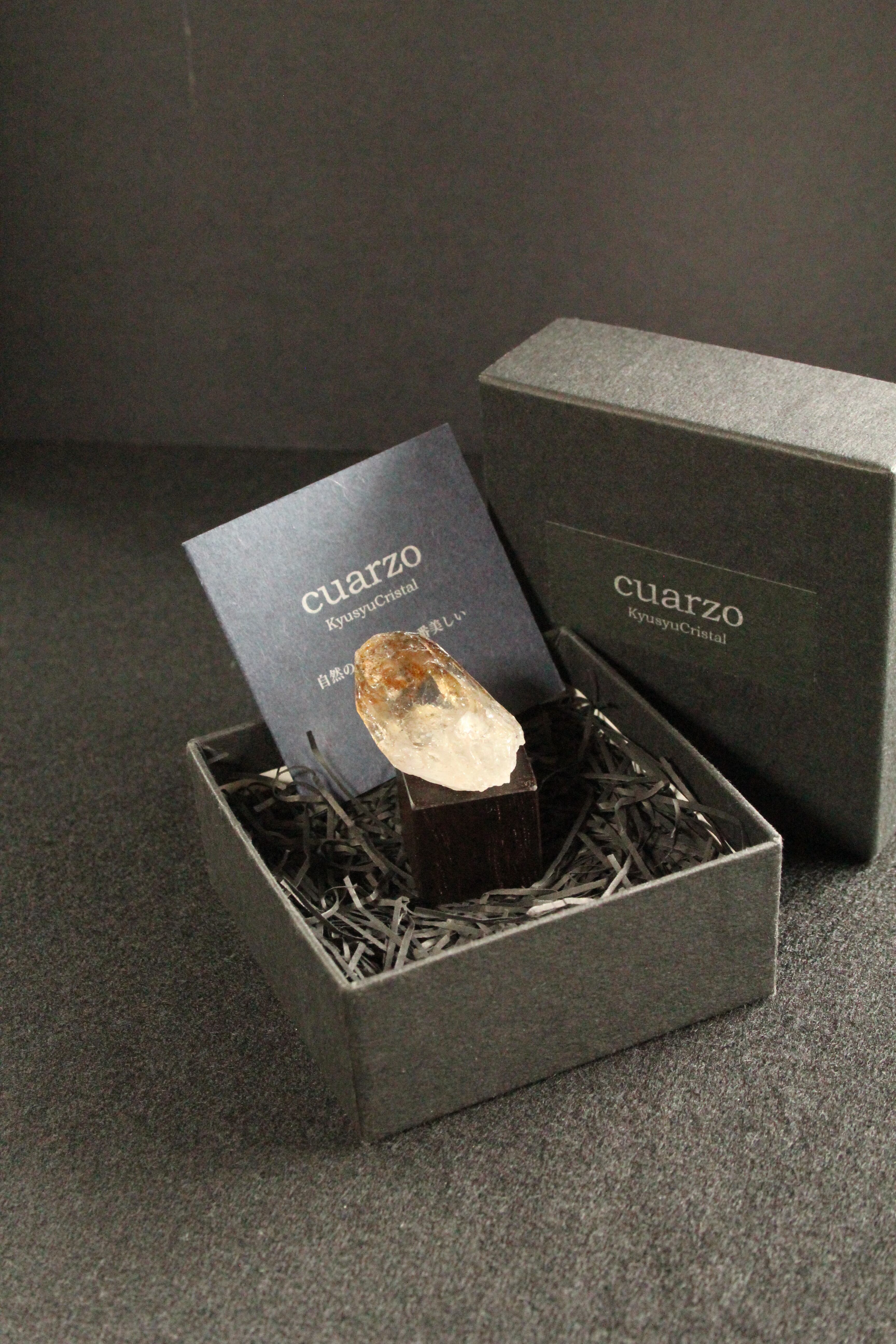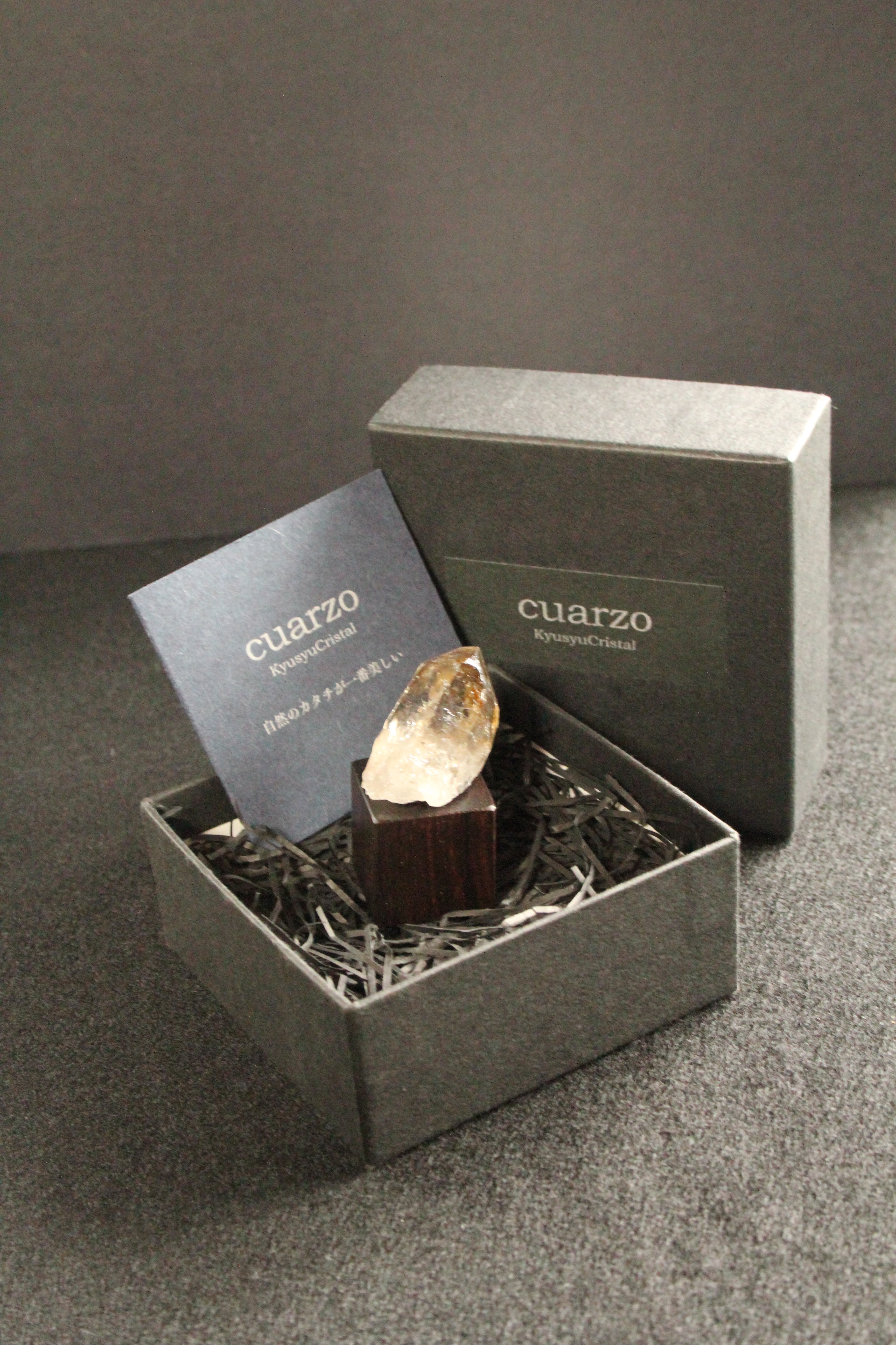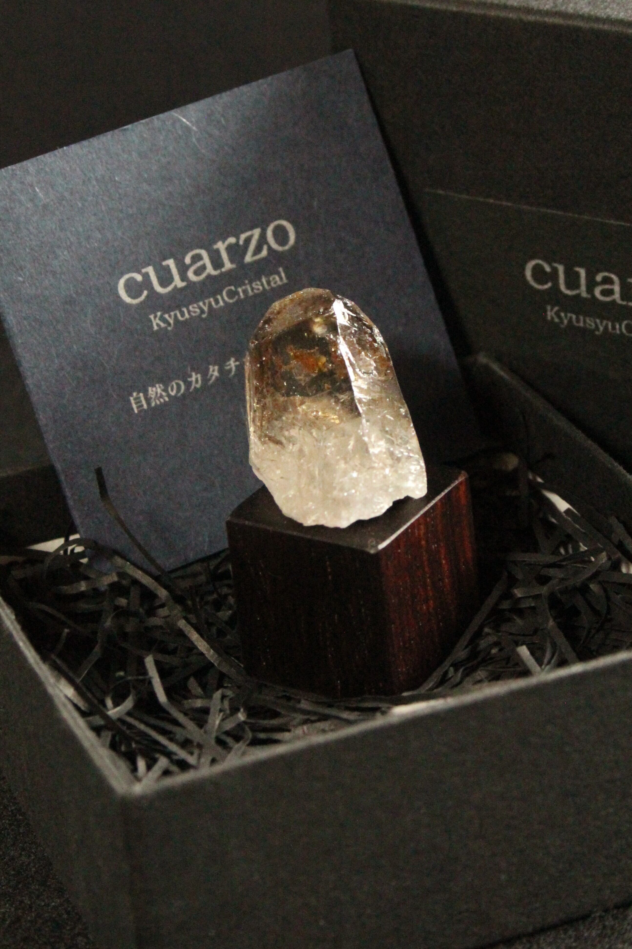 【商品説明】:煙水晶の原石と高級木材のローズウッドを使用した置物。ずっしりとした存在感と、透明感溢れる煙をまとったような宮崎産の煙水晶です。薄く刻まれた条線がとてもキレイです。ローズウッドキューブの大きさ(約20x20x20mm)
