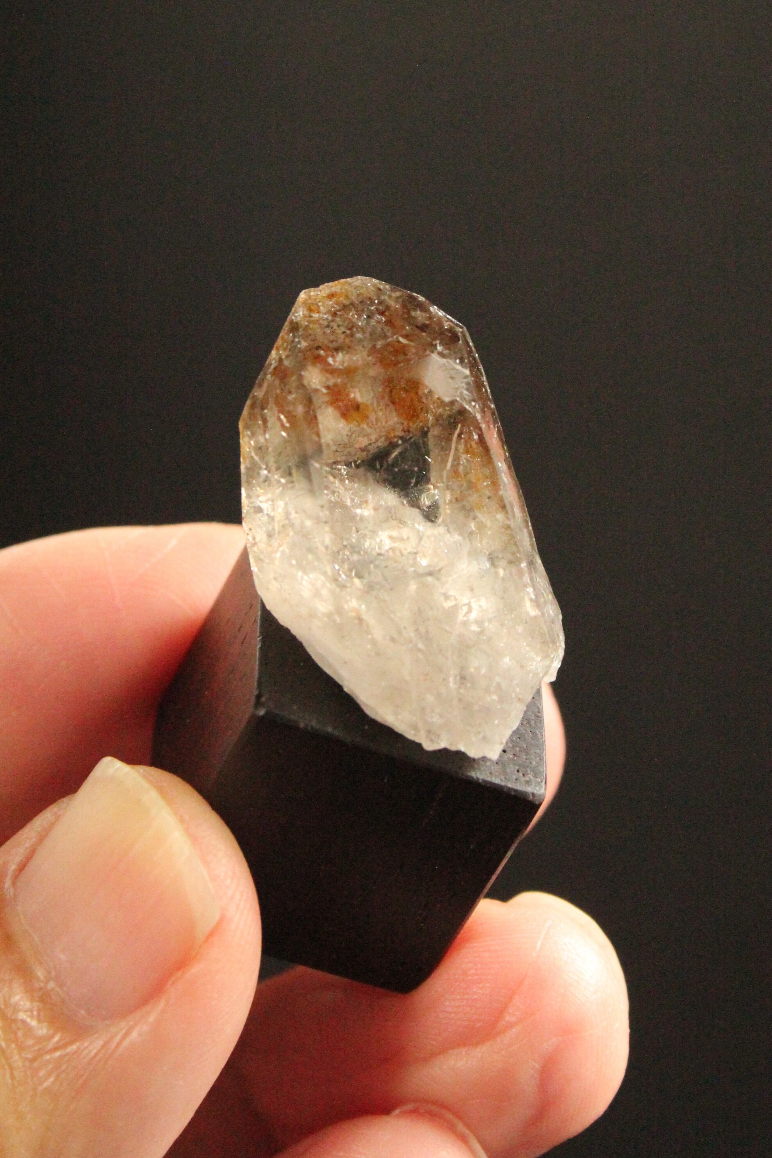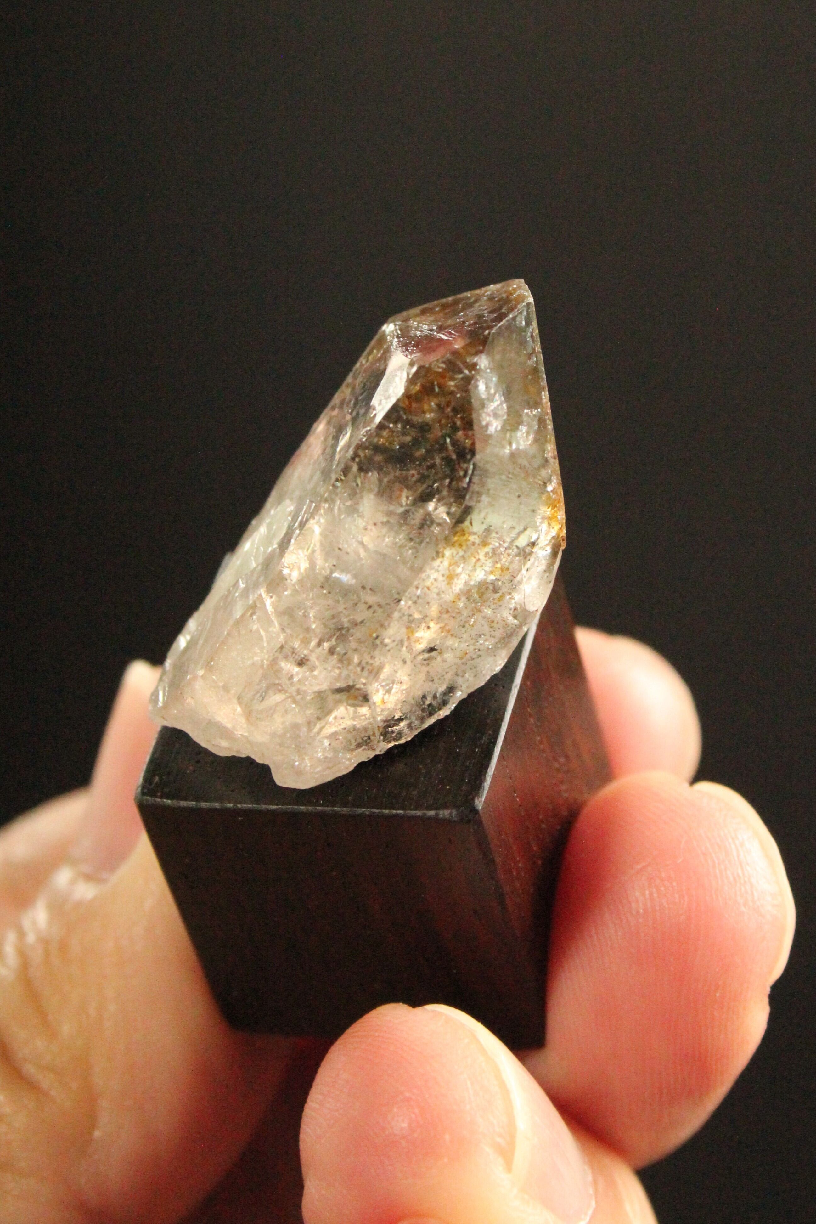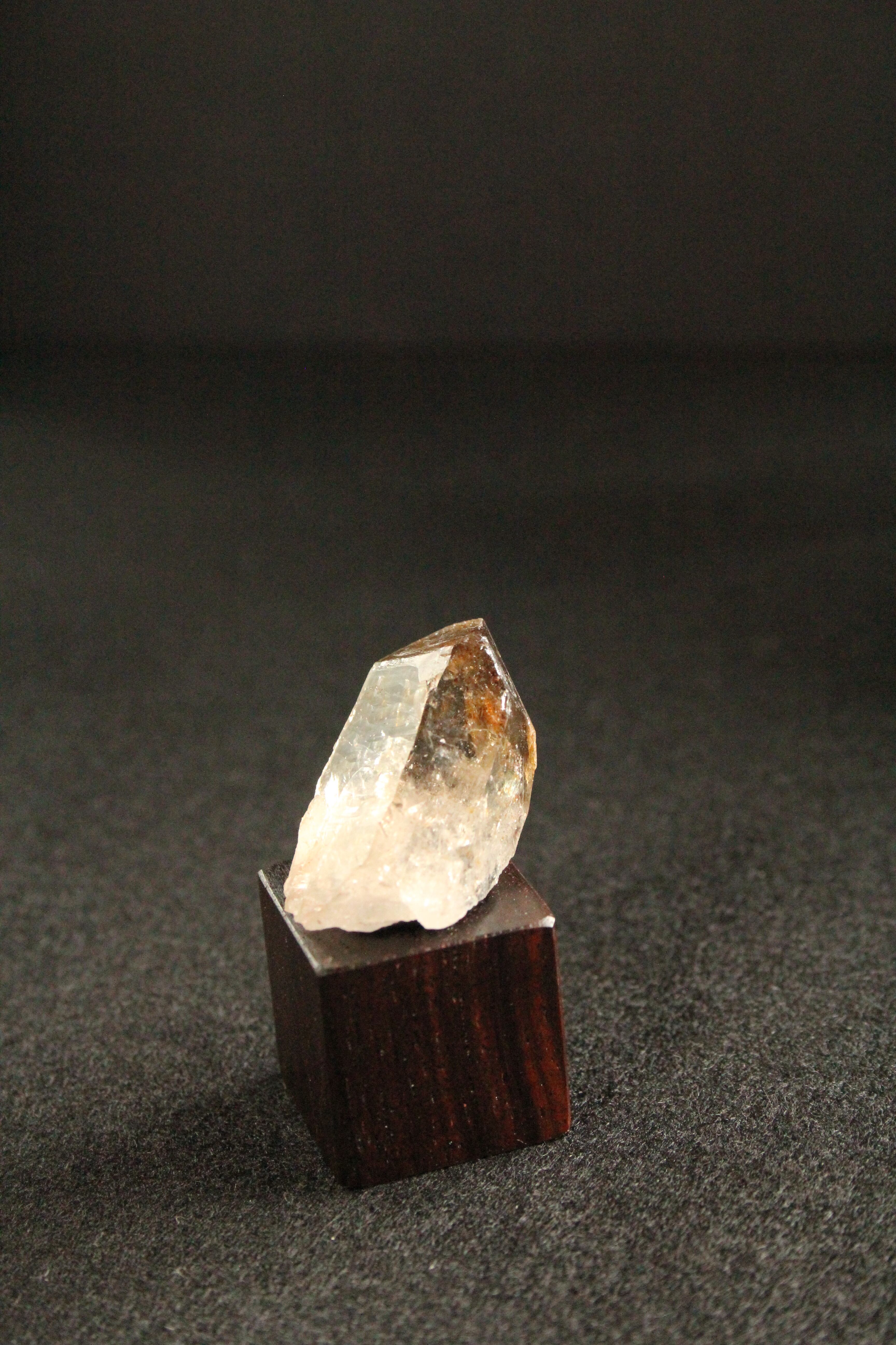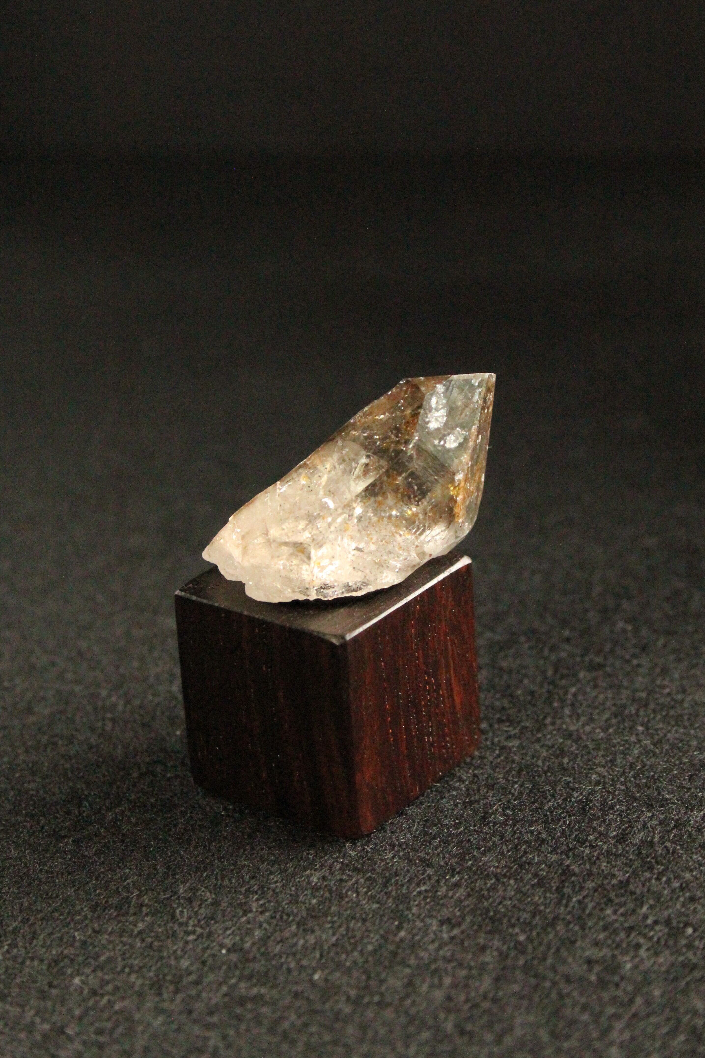 【商品説明】:煙水晶の原石と高級木材のローズウッドを使用した置物。ずっしりとした存在感と、透明感溢れる煙をまとったような宮崎産の煙水晶です。薄く刻まれた条線がとてもキレイです。ローズウッドキューブの大きさ(約20x20x20mm)