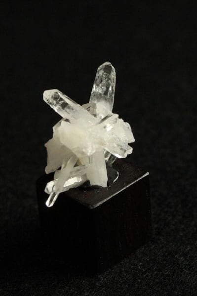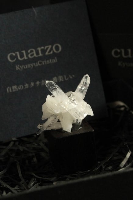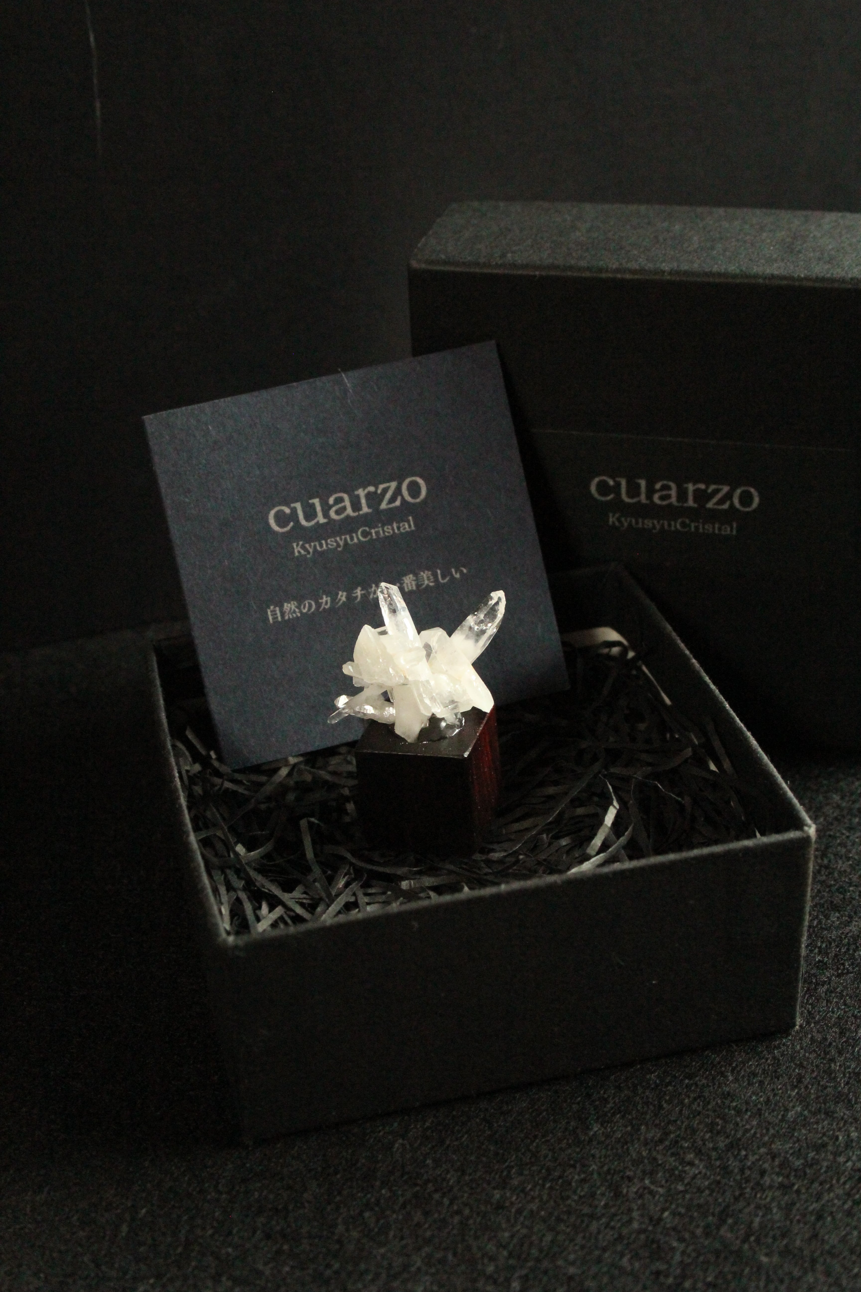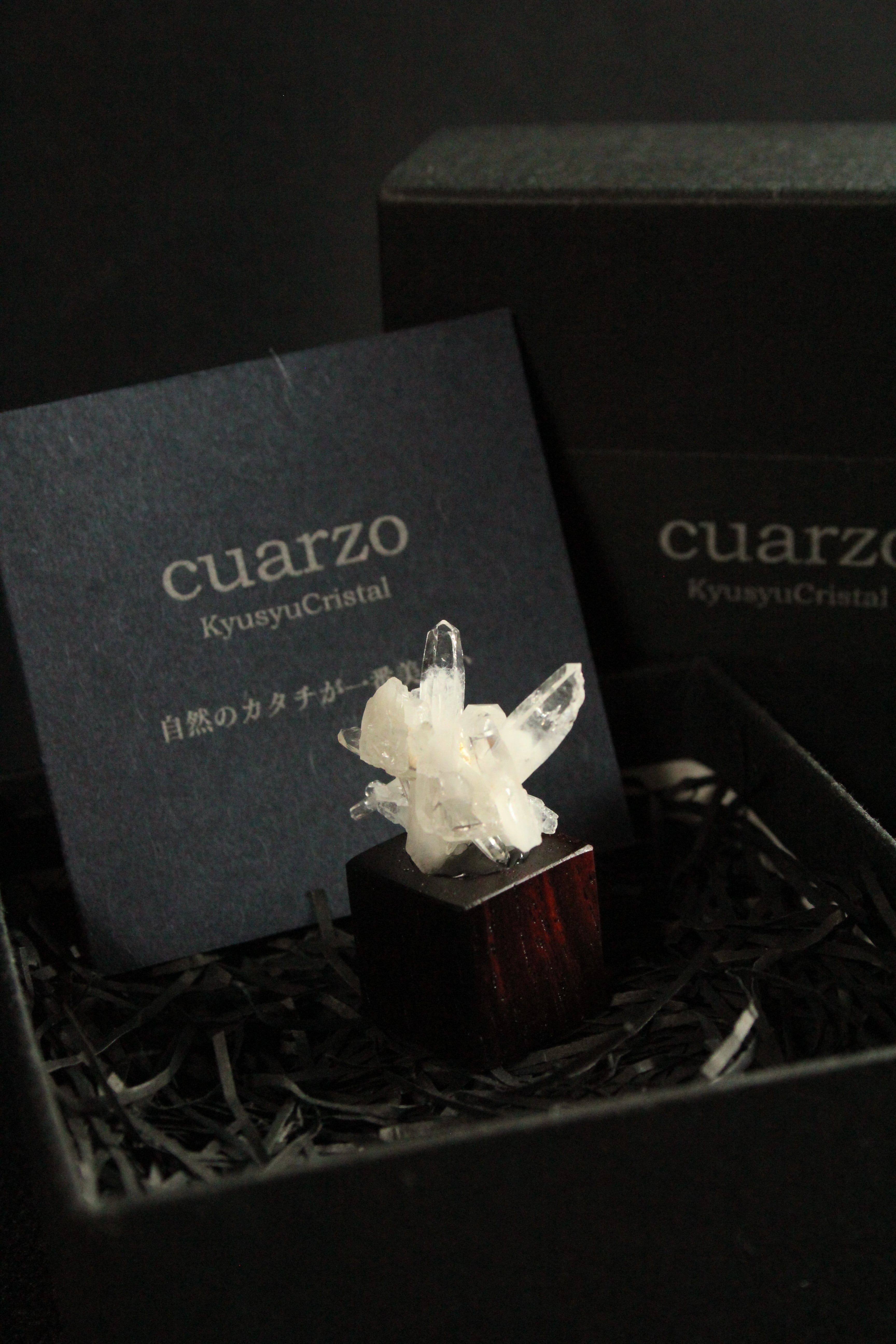 【商品説明】:クラスター水晶の原石と高級木材のローズウッドを使用した置物。様々な方向に自由気ままに伸びている大分産のミニ水晶クラスターです。各ポイントの先はとても透明度が高いです。ここの水晶は、スパっと輪切りにカットすると、断面が桜の花びらのような模様に見えるらしく、そのことから「桜水晶」と言われています。ローズウッドキューブの大きさ(約15x15x15mm)