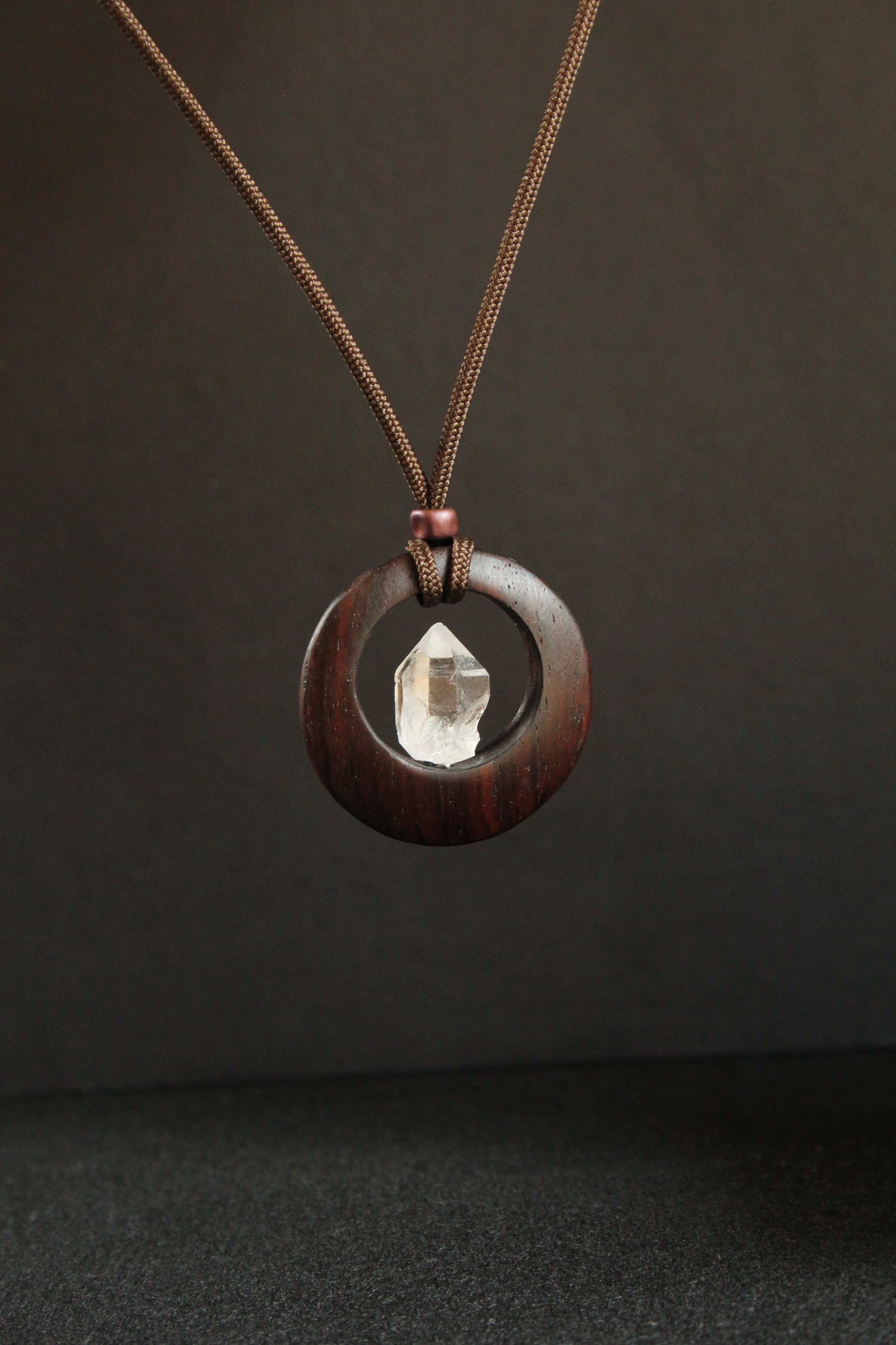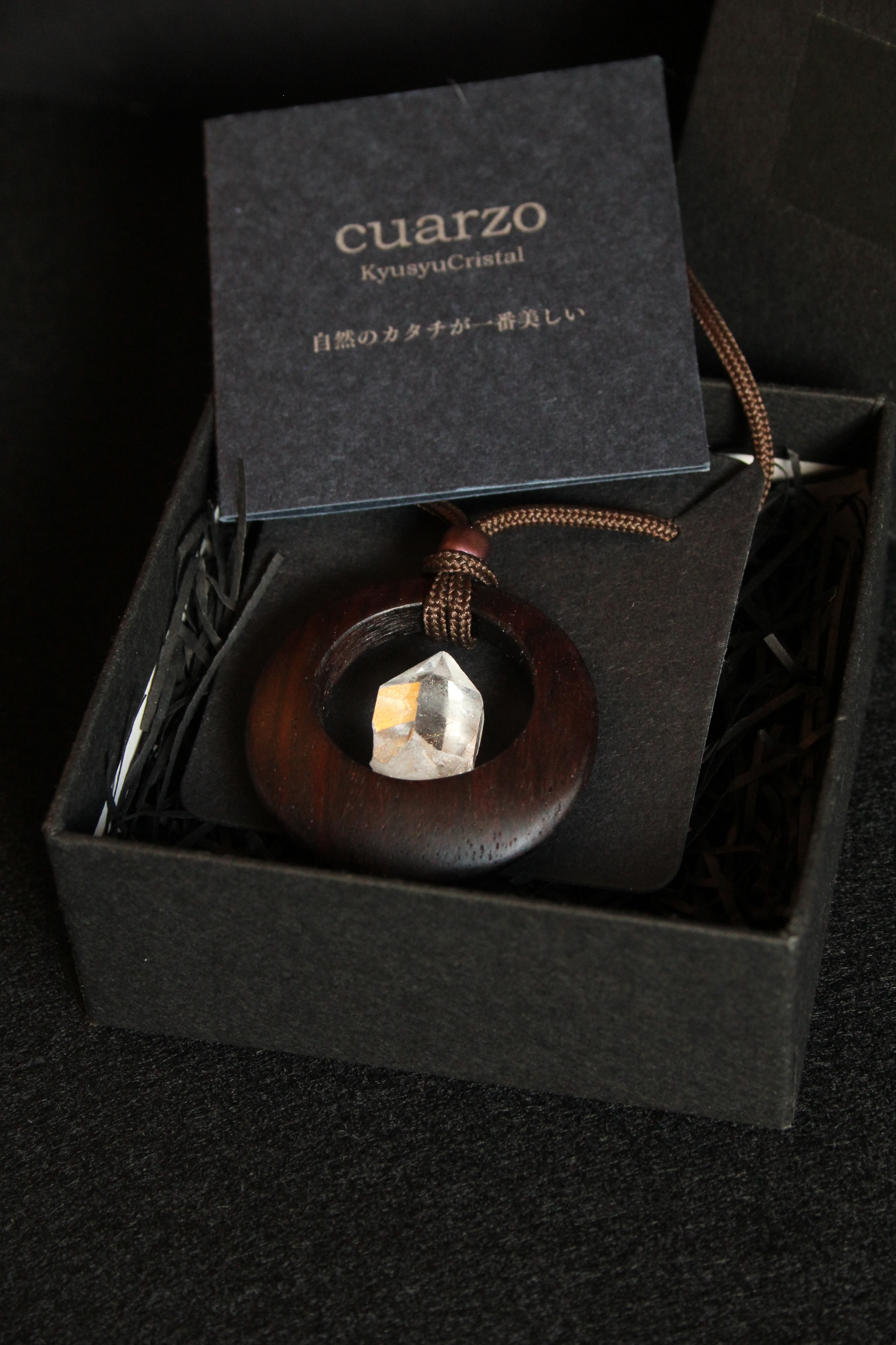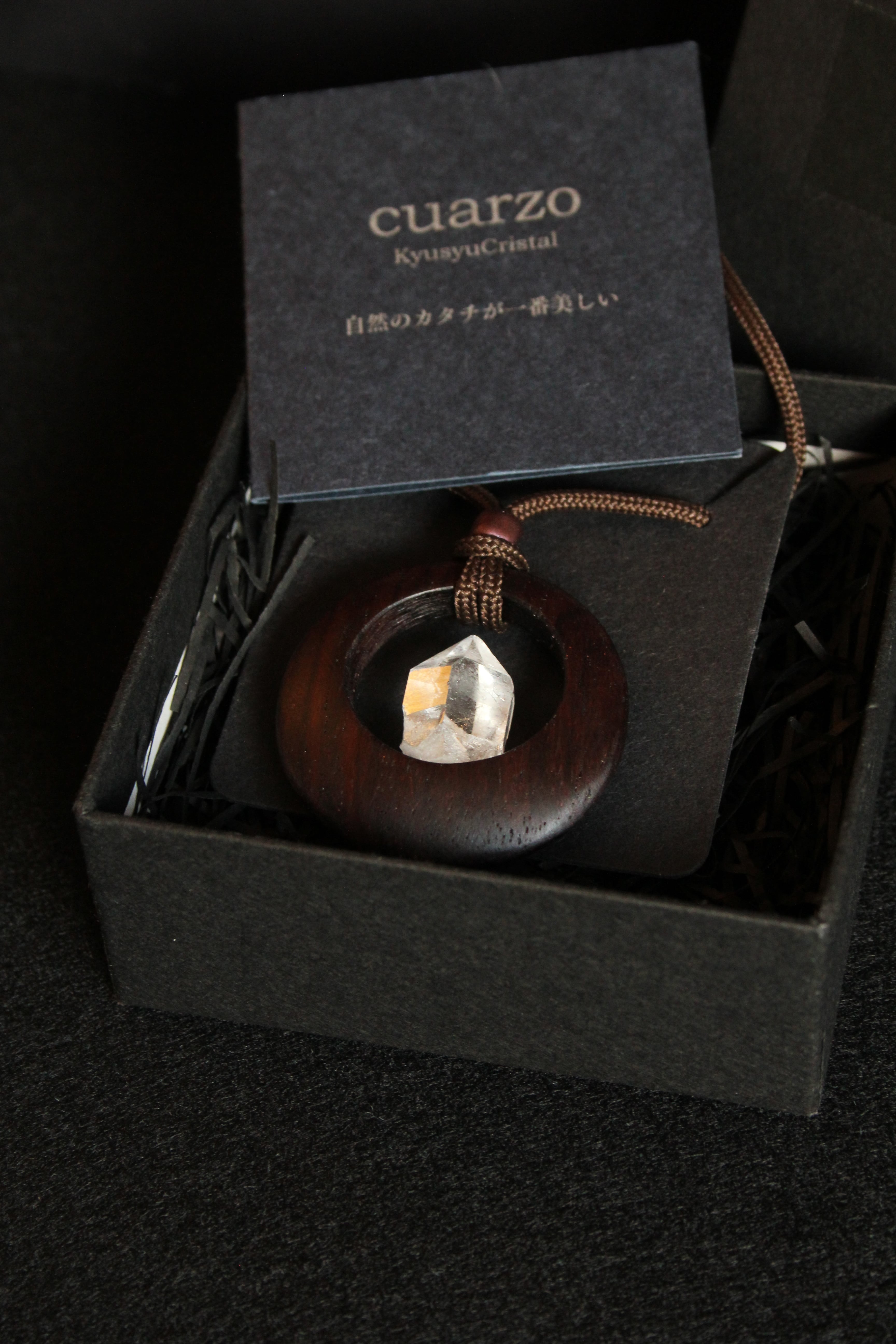 【商品説明】:水晶の原石と高級木材のローズウッドを使用したペンダント。宮崎クリスタルの中でも、抜群のテリと透明感を誇る日之影町産の水晶。ペンダントに使用している水晶は、産出した中でも、選りすぐり美しさを誇るものです。