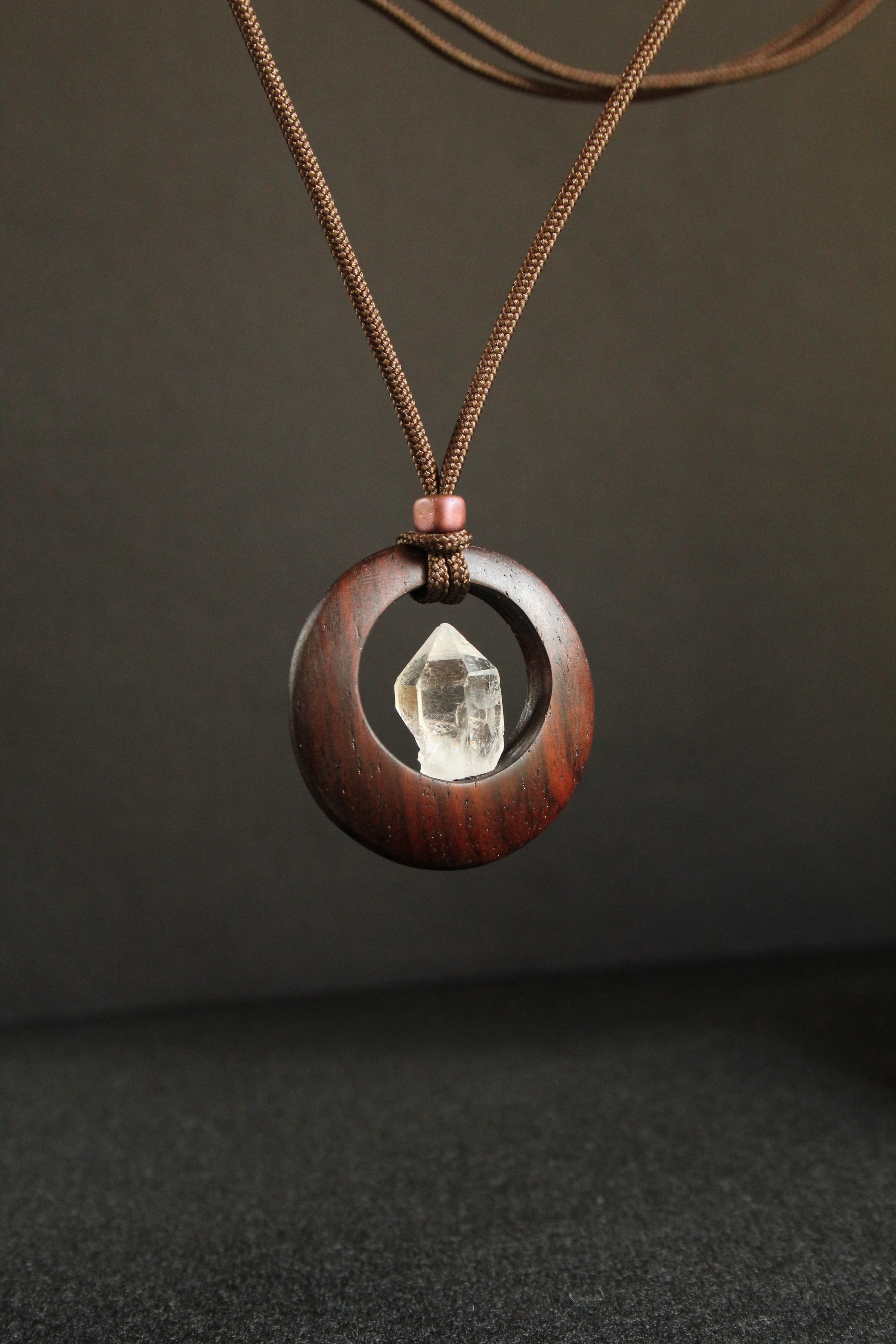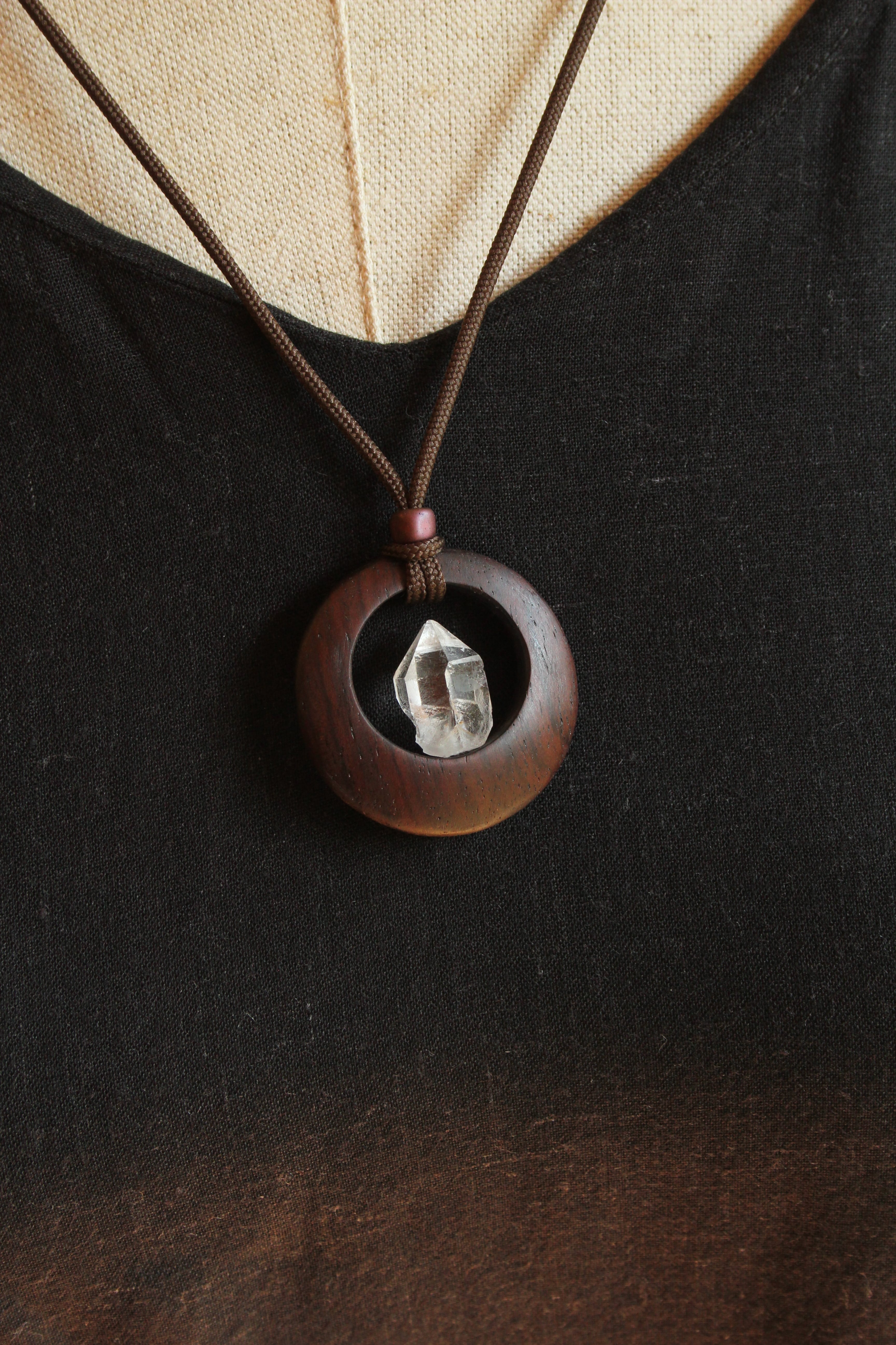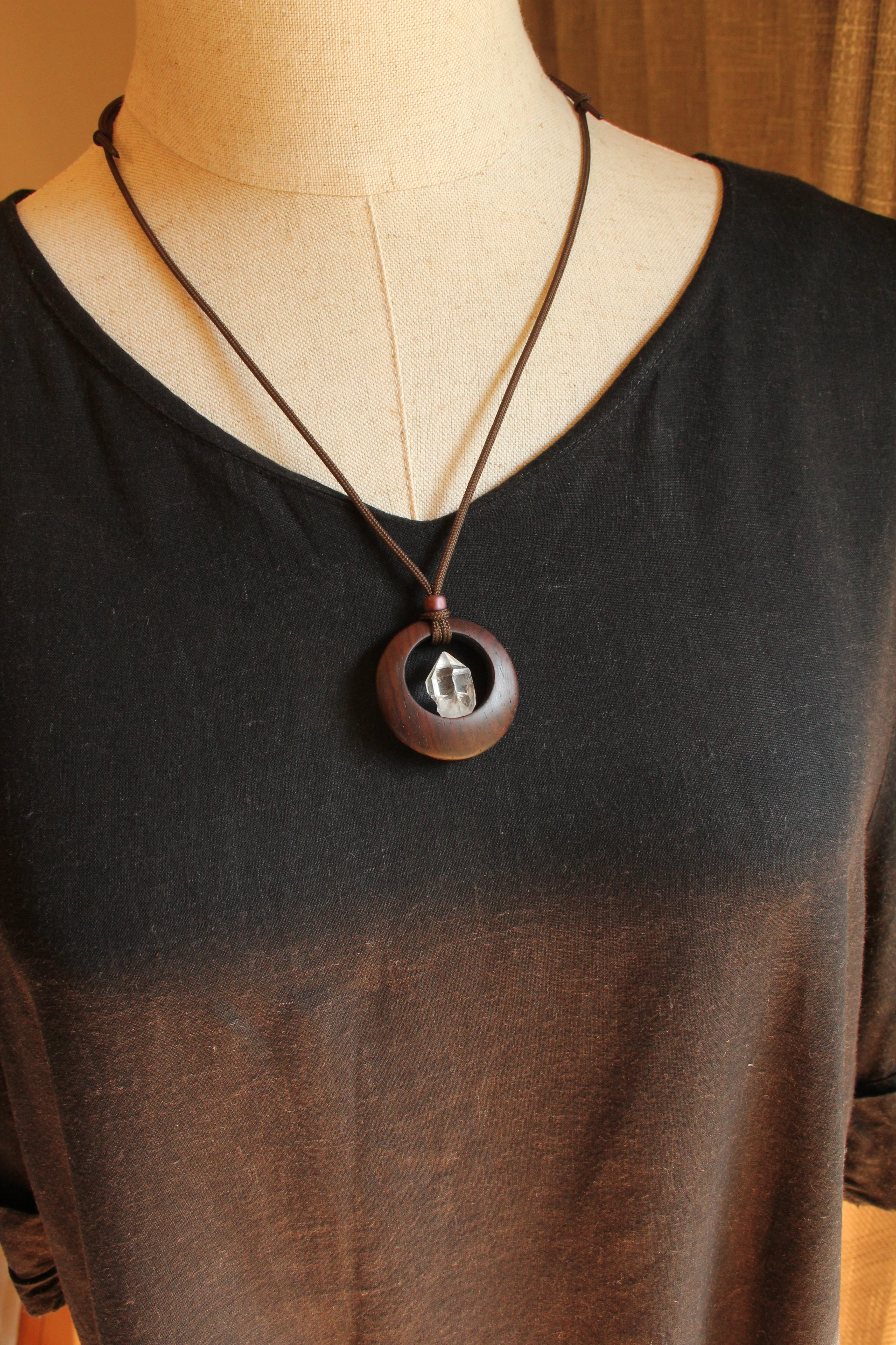 【商品説明】:水晶の原石と高級木材のローズウッドを使用したペンダント。宮崎クリスタルの中でも、抜群のテリと透明感を誇る日之影町産の水晶。ペンダントに使用している水晶は、産出した中でも、選りすぐり美しさを誇るものです。