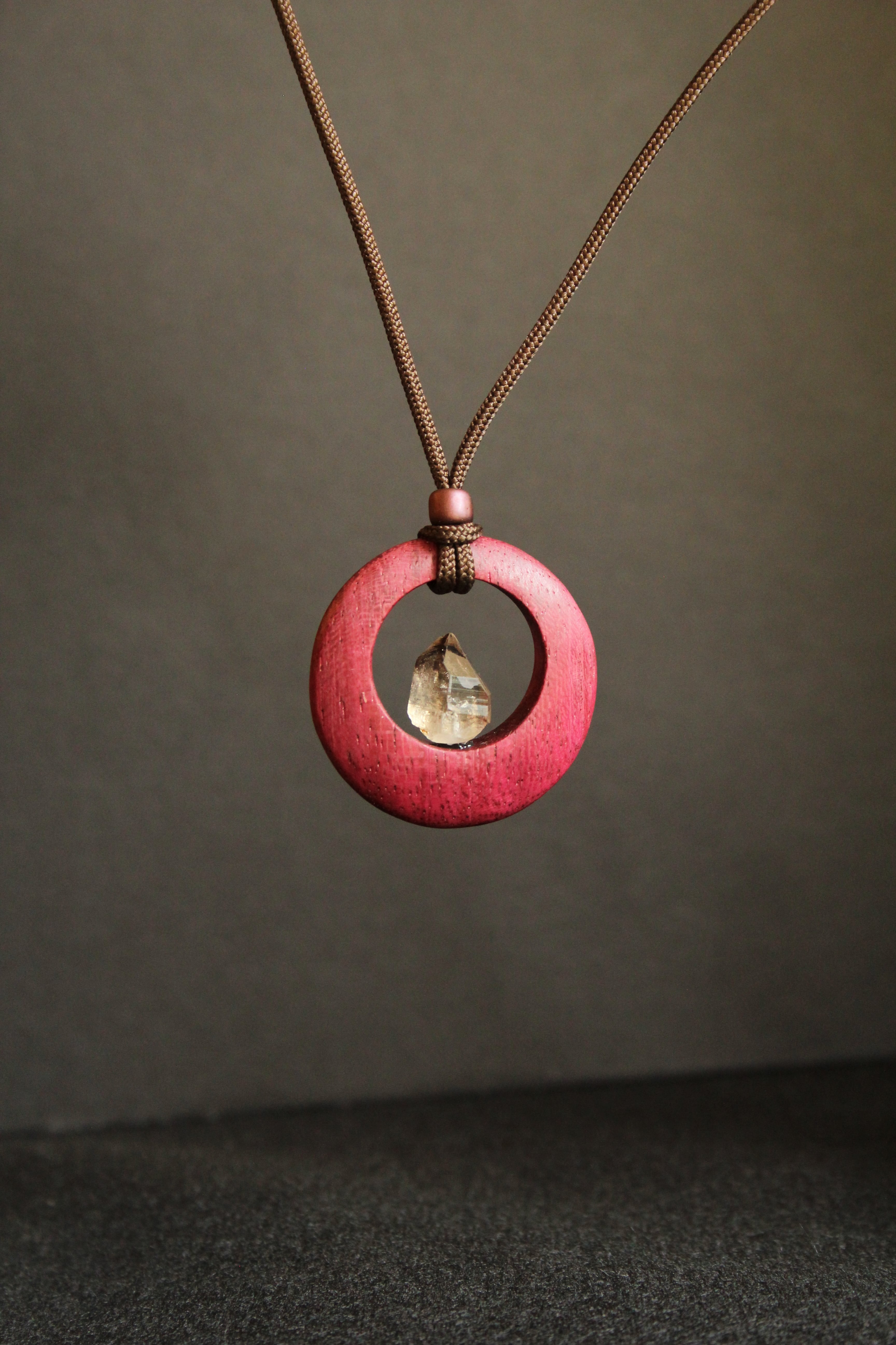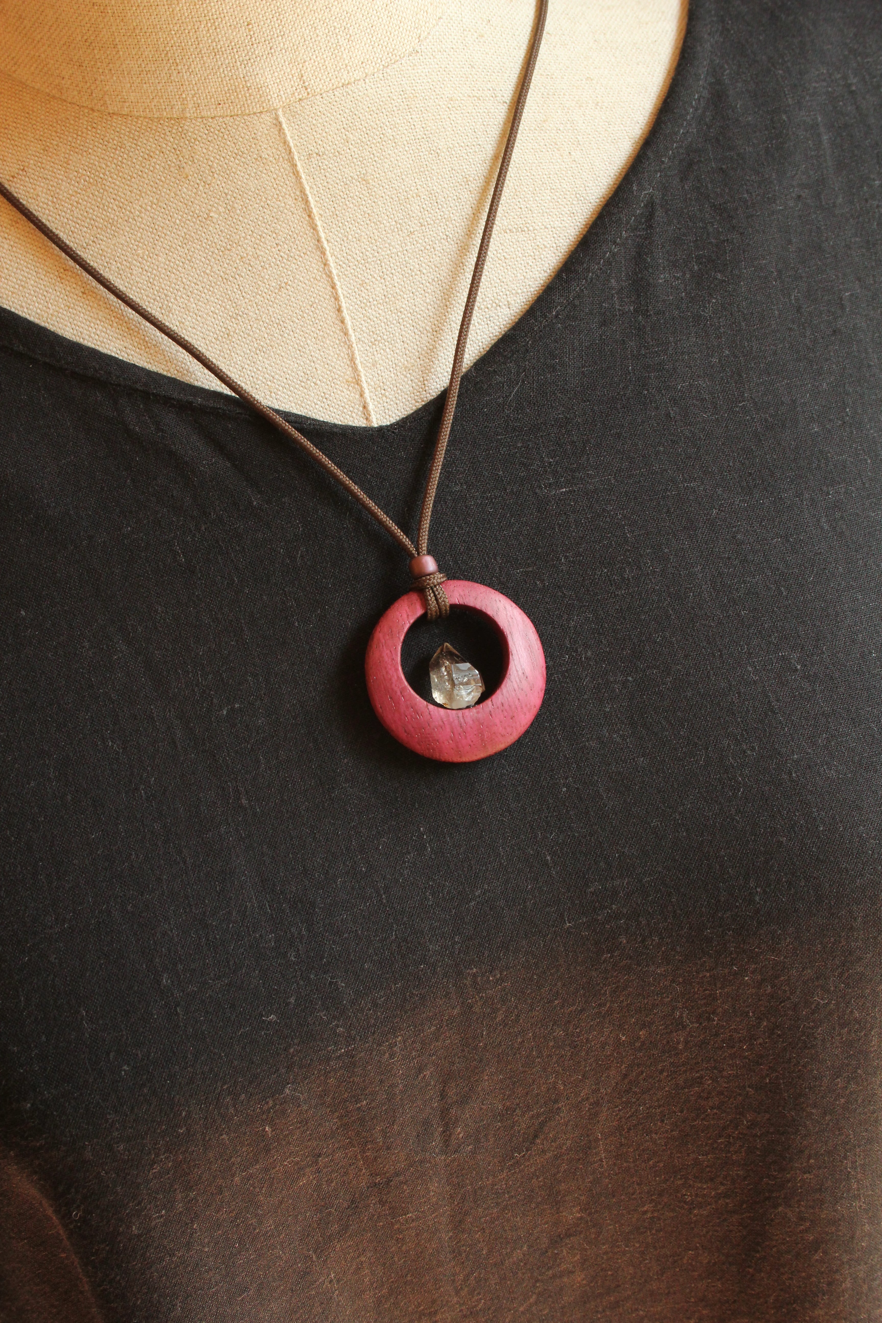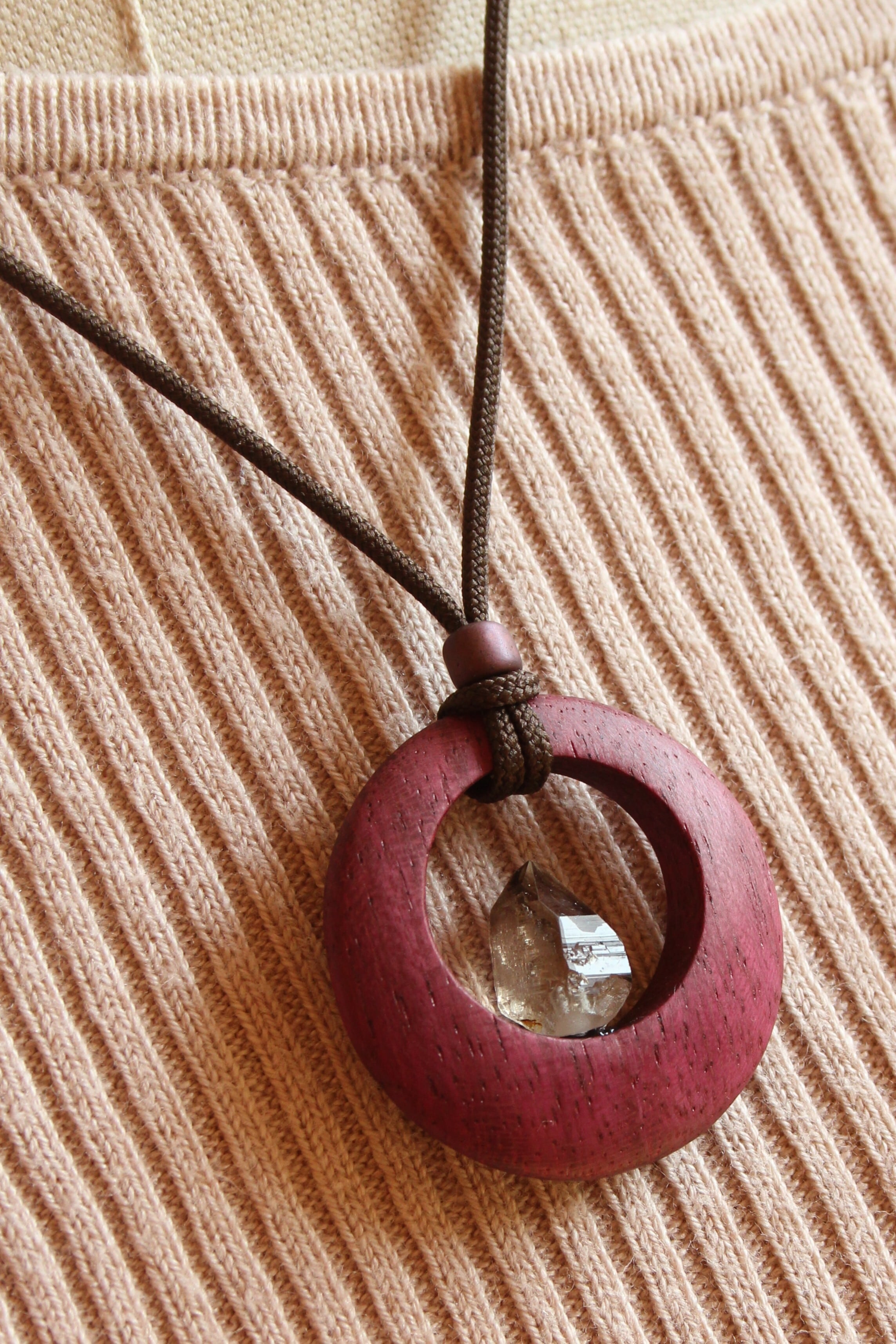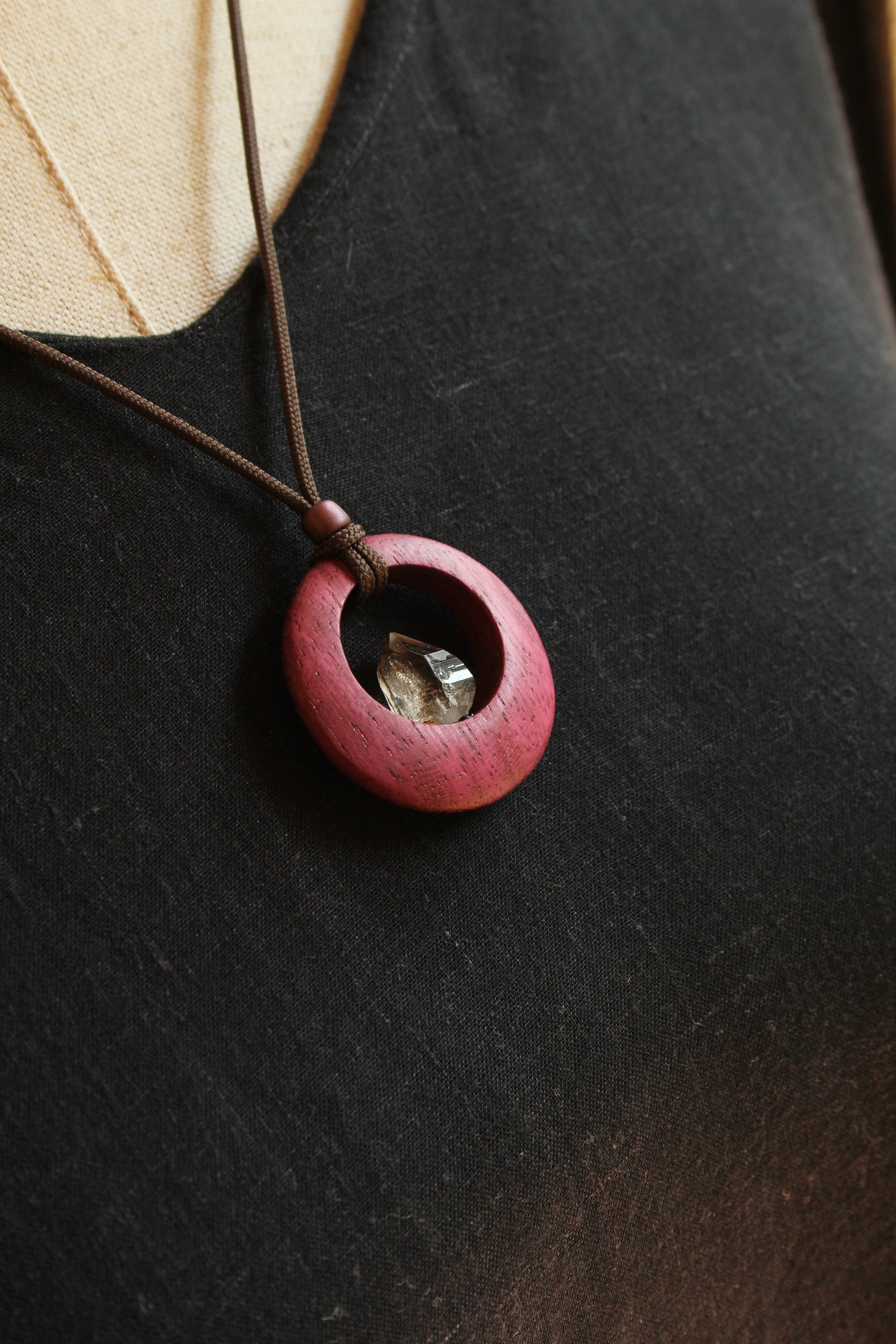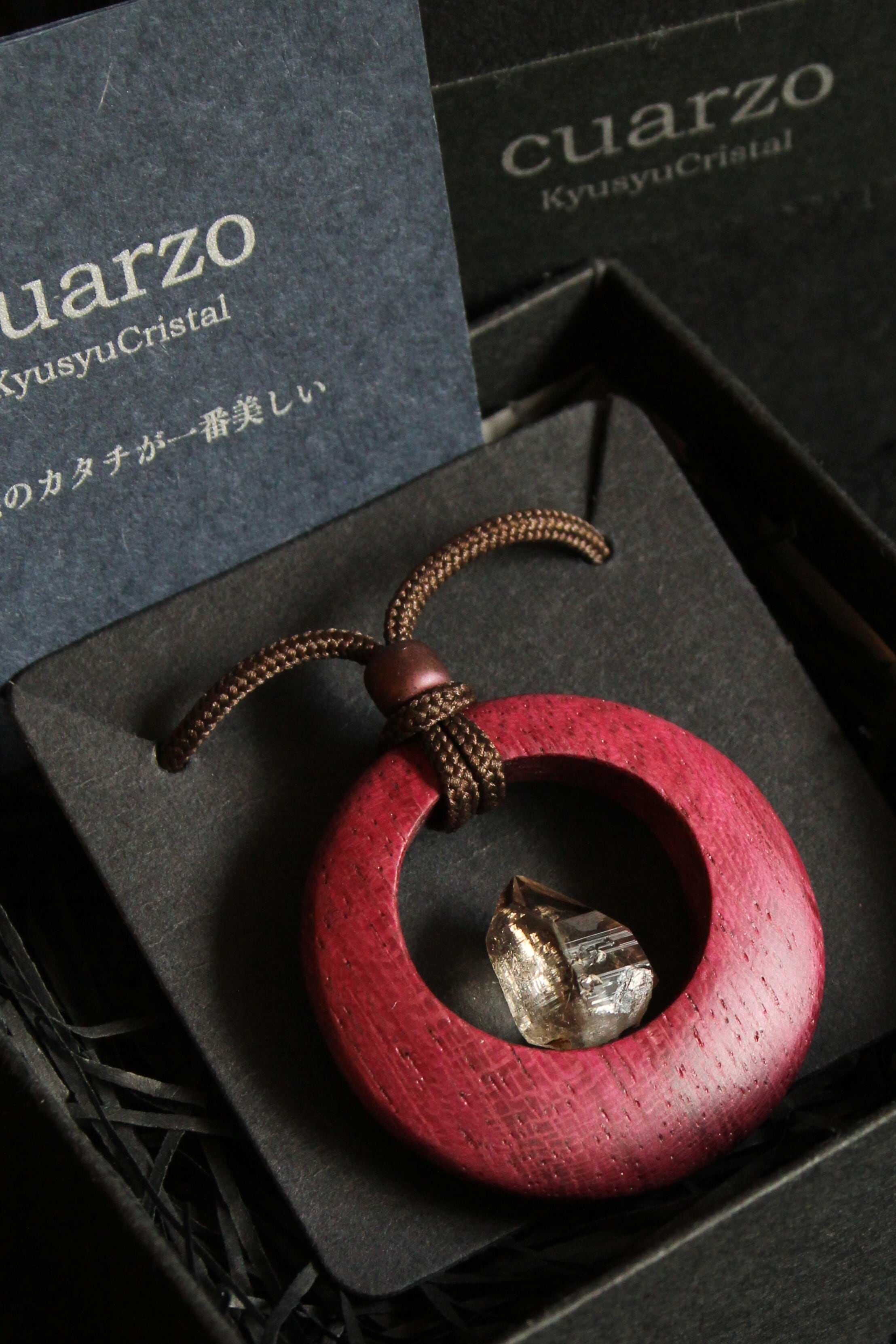 【商品説明】:煙水晶の原石と高級木材のパープルハートを使用したペンダント。ペンダントに使用している水晶は、産出した中でも、選りすぐり美しさを誇るものです。根元がグレーで頭に向けて黒い近い感じになる透明感溢れる宮崎産の煙水晶です。