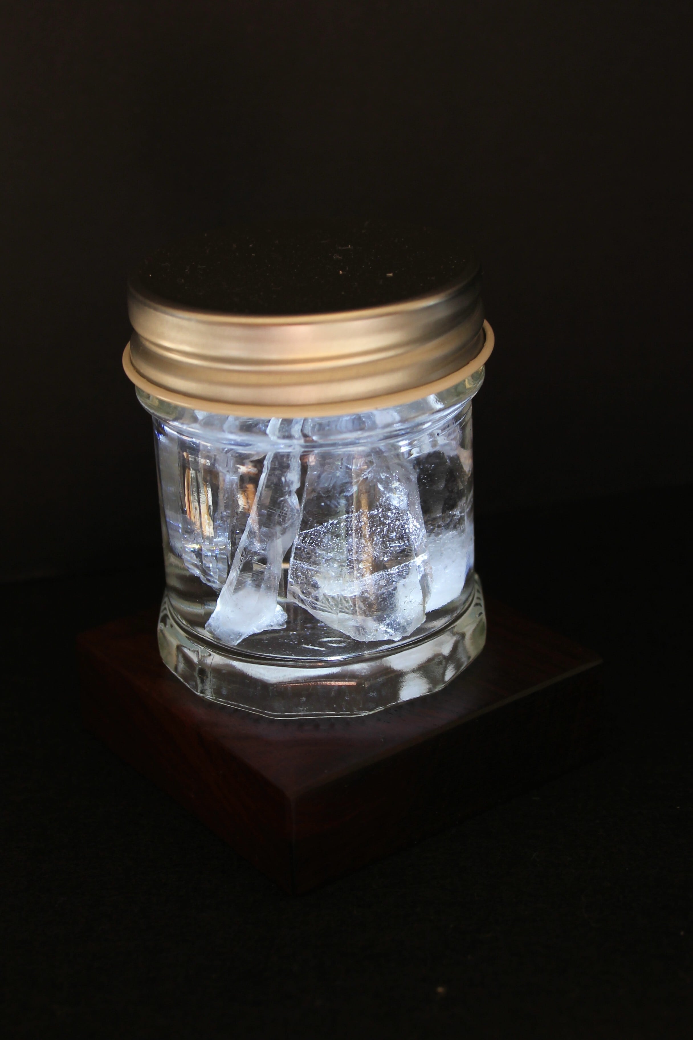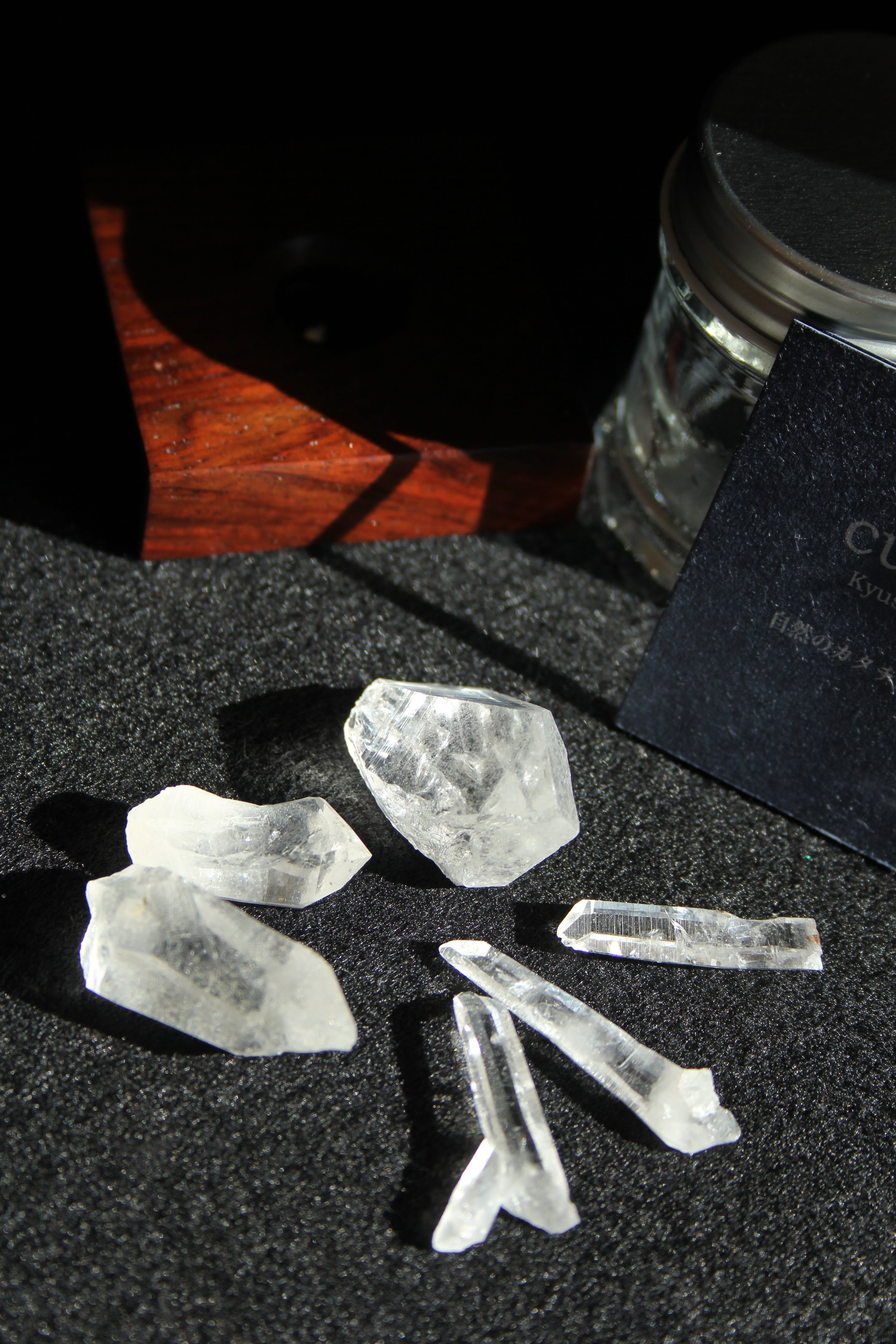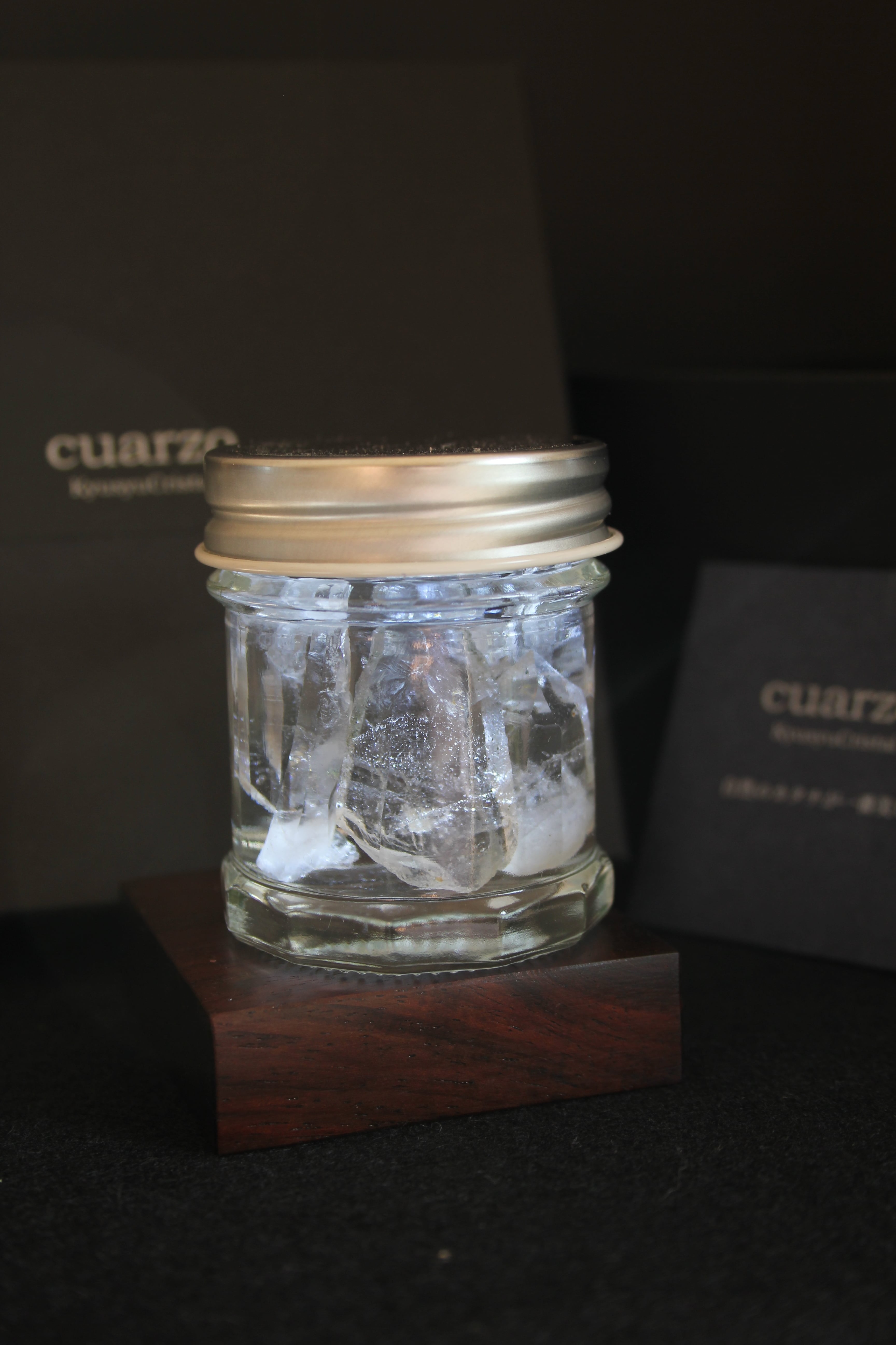 【商品説明】:2種の宮崎産の水晶を使ったアクアリウム。ローズウッドのベースには、LEDが付いており、下から光を当てることができます。産地の違う宮崎産の透明度高い水晶を、それぞれ3個づつ、ビンに詰めています。水晶は欠けや傷はありますが、宮崎産水晶の原石をお手元に置きたい方にはおすすめです。