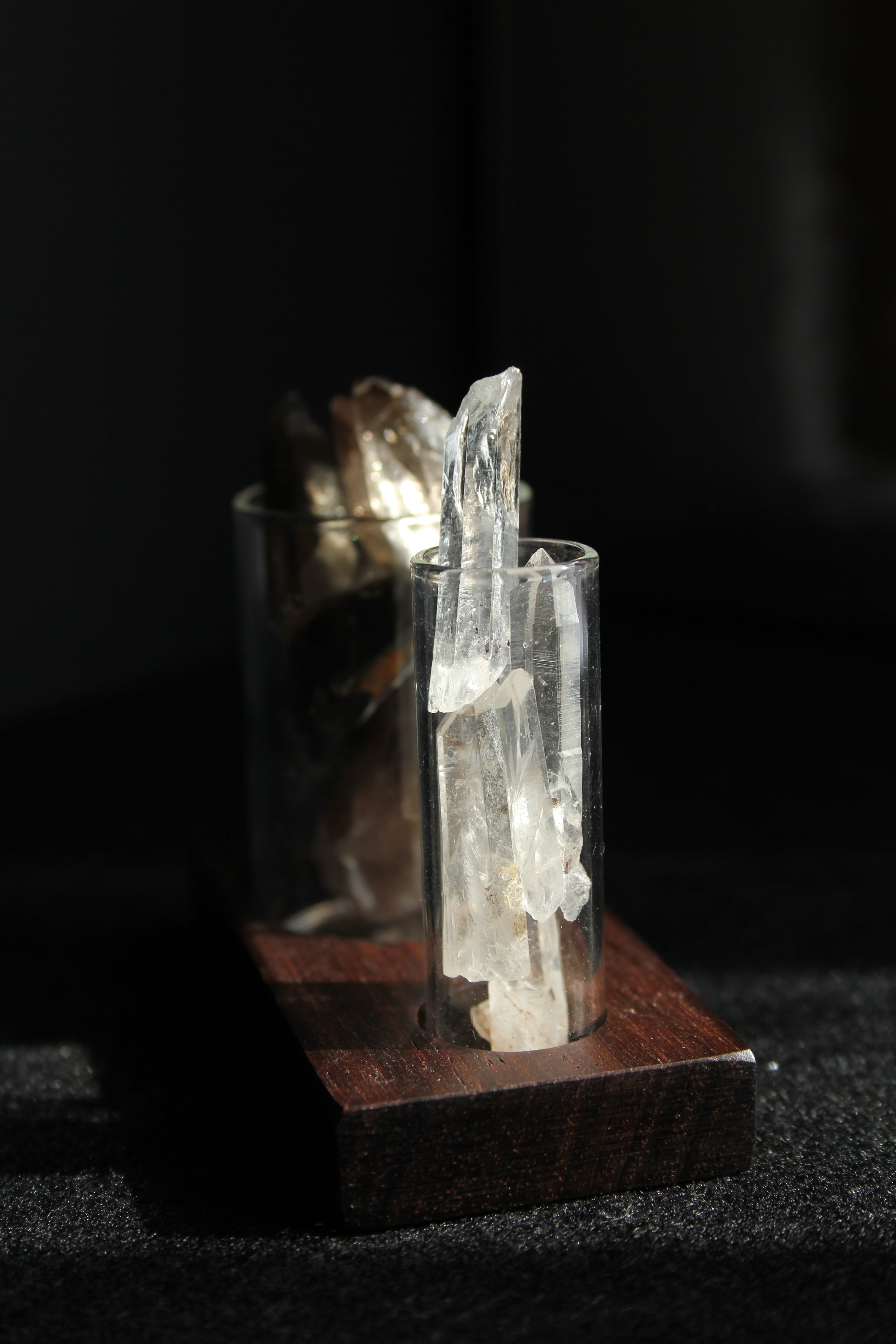 【商品説明】:宮崎産の透明度高い水晶と、ほんのり茶色からモリオンに近い黒水晶など、バリエーションが豊富な煙水晶を各5本づつガラス製の試験管に詰めたセット。試験管台は、もちろんローズウッド。水晶は欠けや傷はありますが、宮崎産水晶の原石をお手元に置きたい人は、とってもお得なセットです。
