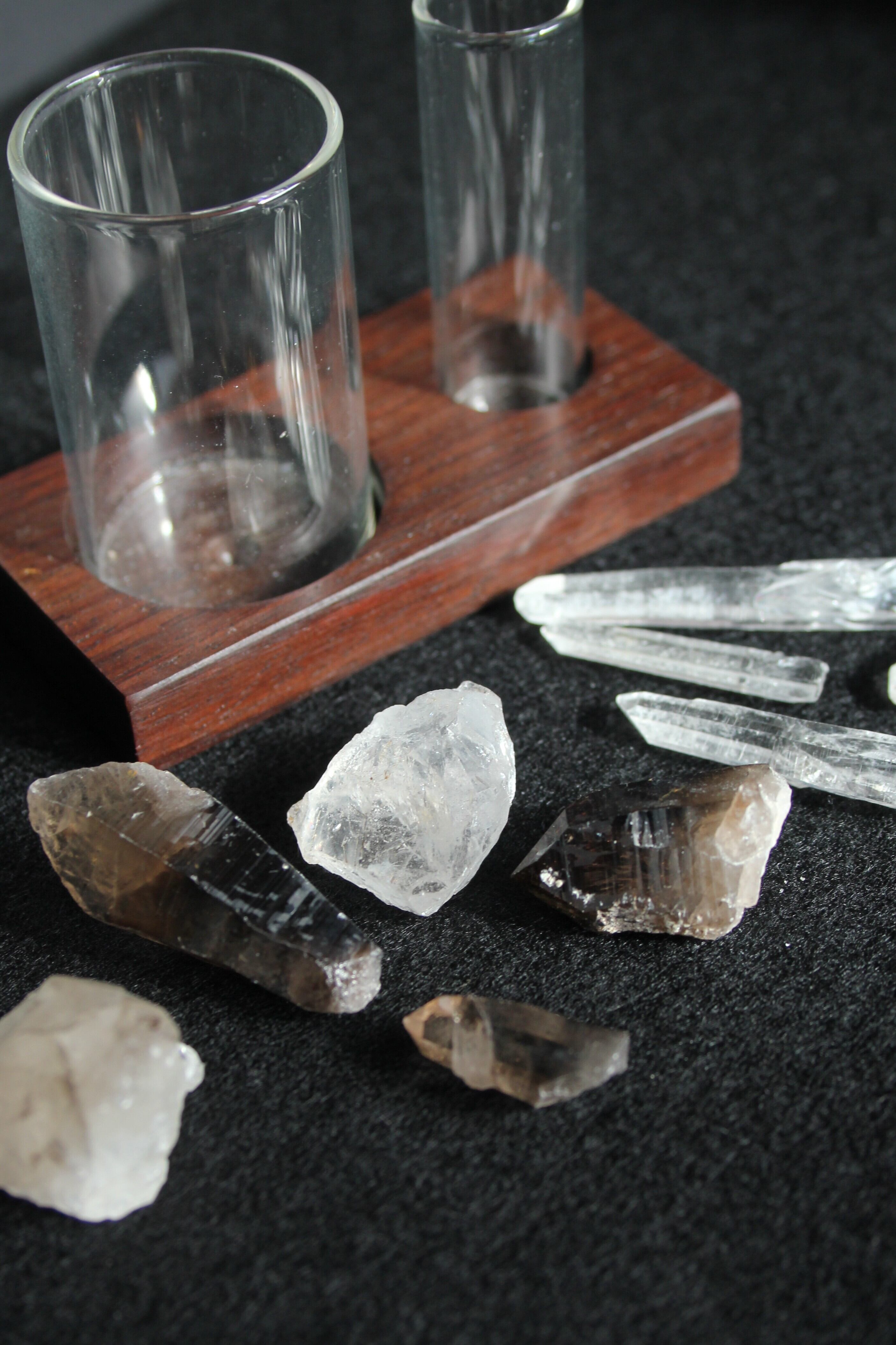 【商品説明】:宮崎産の透明度高い水晶と、ほんのり茶色からモリオンに近い黒水晶など、バリエーションが豊富な煙水晶を各5本づつガラス製の試験管に詰めたセット。試験管台は、もちろんローズウッド。水晶は欠けや傷はありますが、宮崎産水晶の原石をお手元に置きたい人は、とってもお得なセットです。